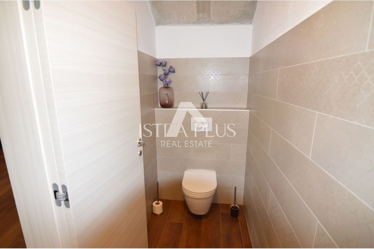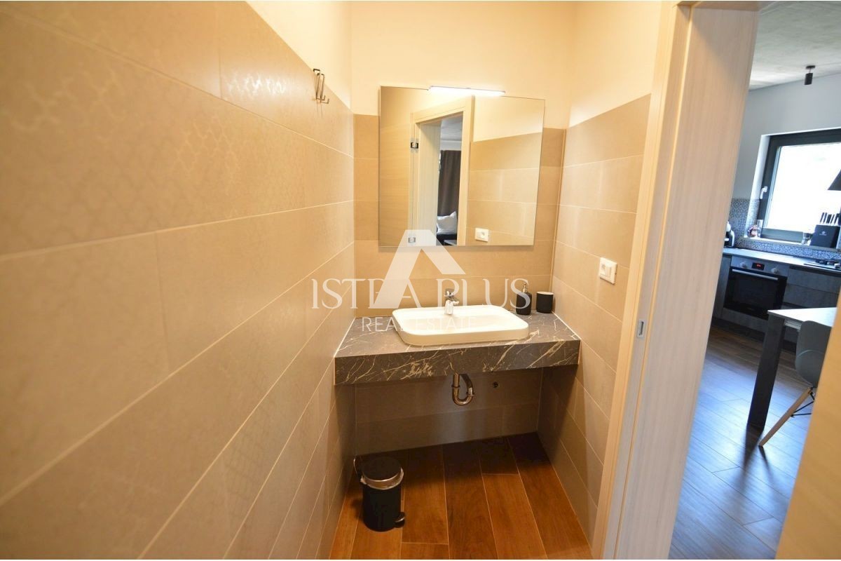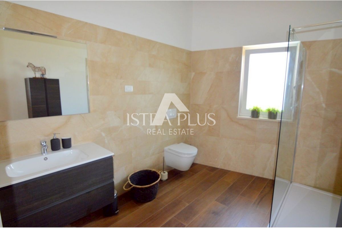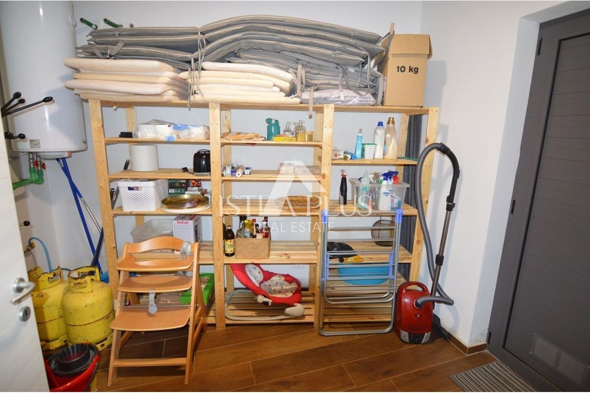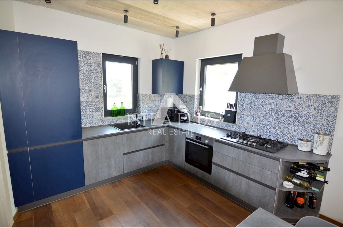K223 Modernes Familienhaus mit Schwimmbad in der Nähe von Poreč, 7 km Die Villa besteht im Erdgeschoss aus einer Eingangshalle, einer Küche mit Esszimmer und einem Wohnzimmer mit Kamin, einer Speisekammer und einer Toilette. Neben der Küche befindet sic