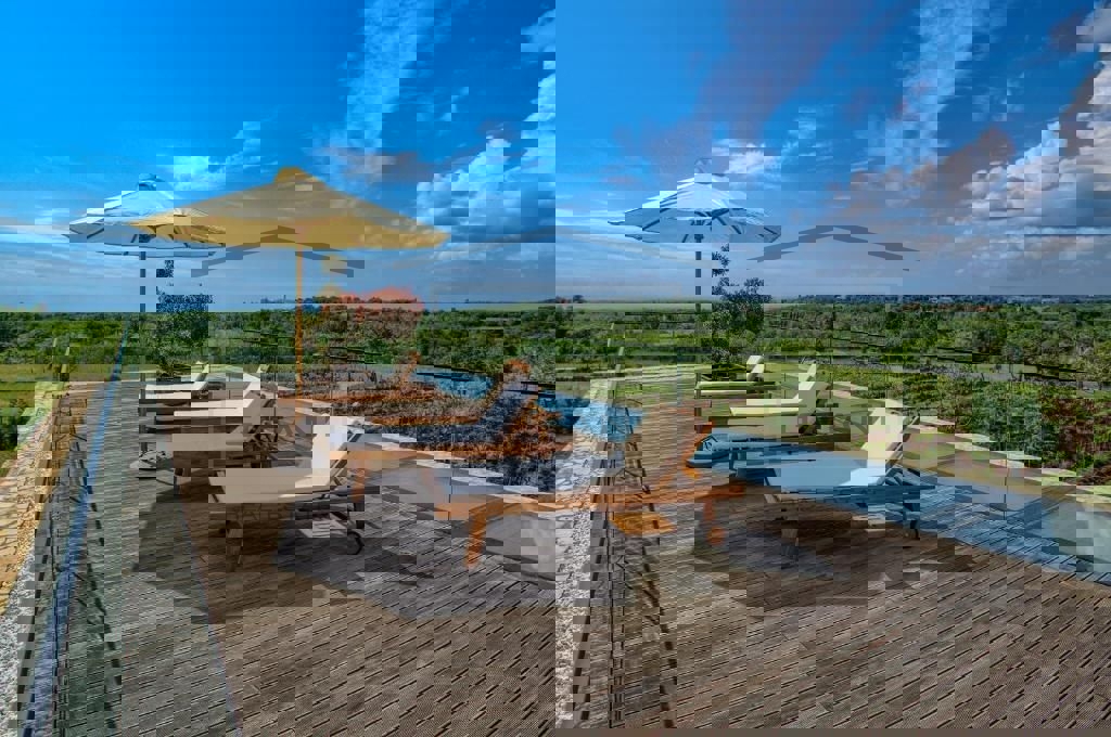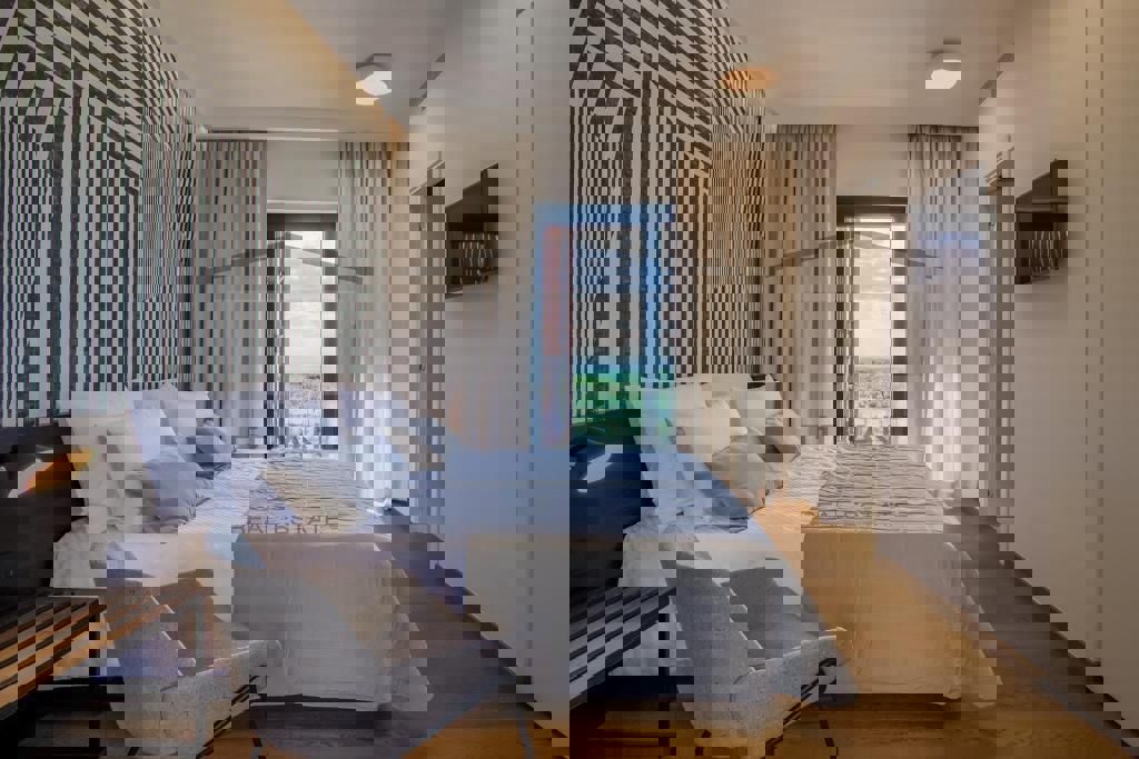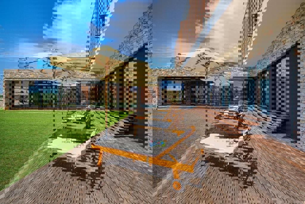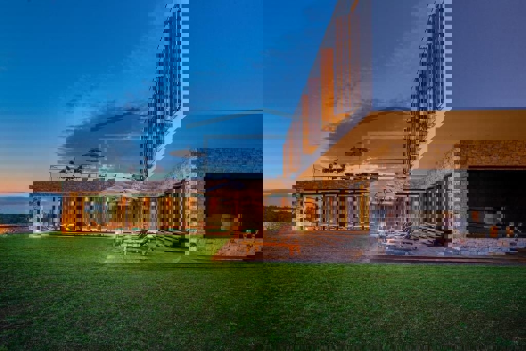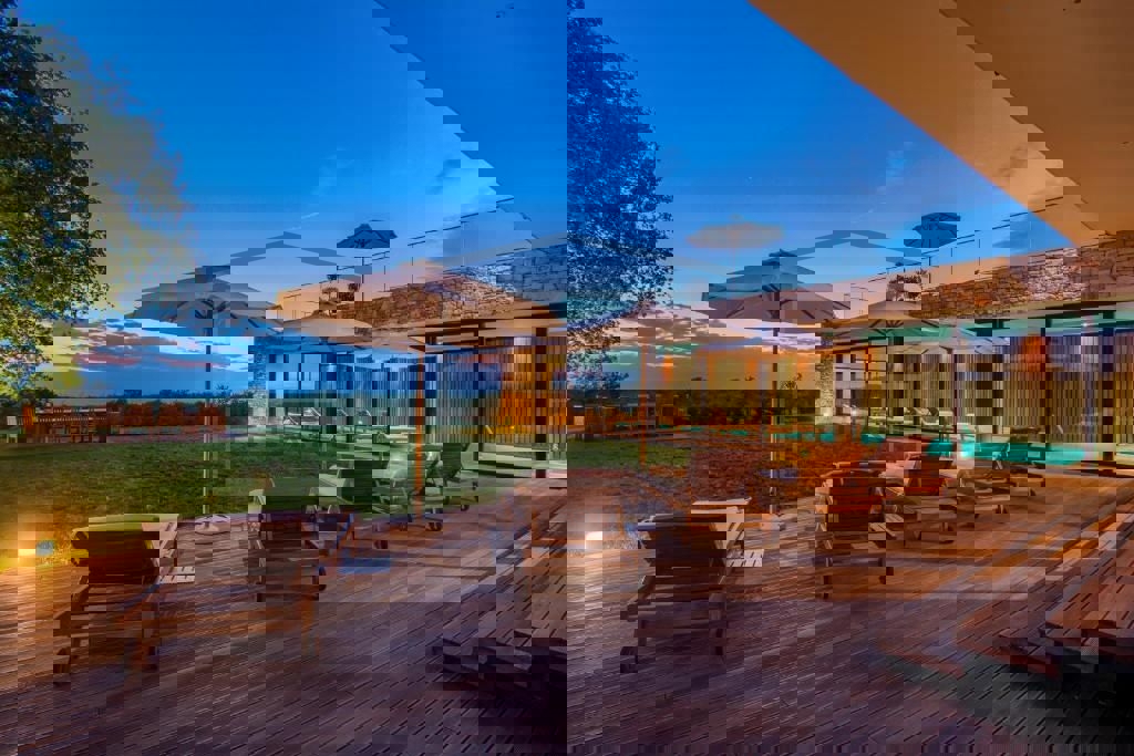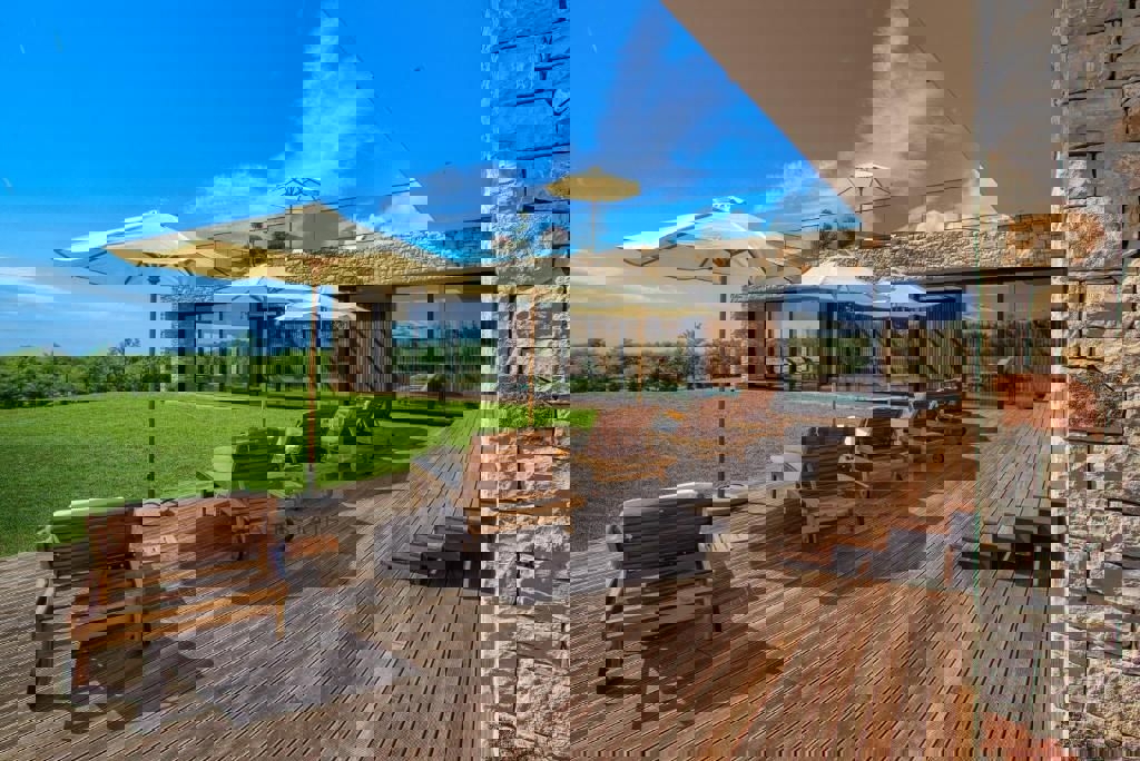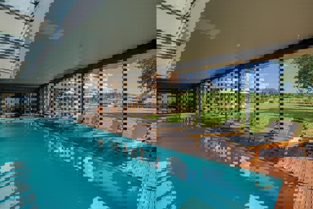 Auf einem wunderschönen Grundstück von 4200 m2 in der Nähe von Poreč befindet sich eine Luxusvilla mit Innenpool. Die Villa besteht aus 4 Schlafzimmern mit eigenem Bad, Küche, Esszimmer und Wohnzimmer, Sauna, Fitnessraum, separatem Bad und Innenpool von 1