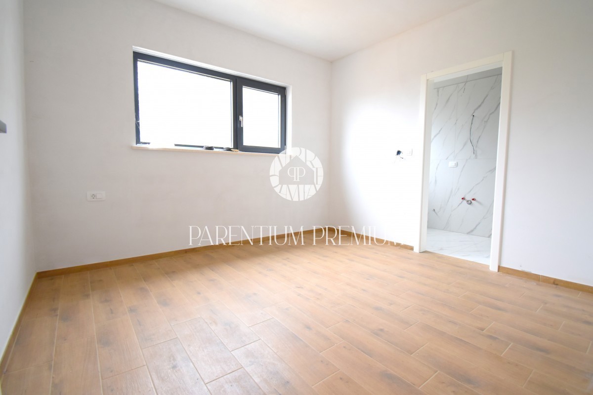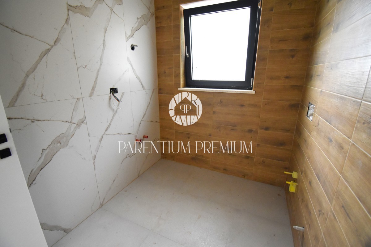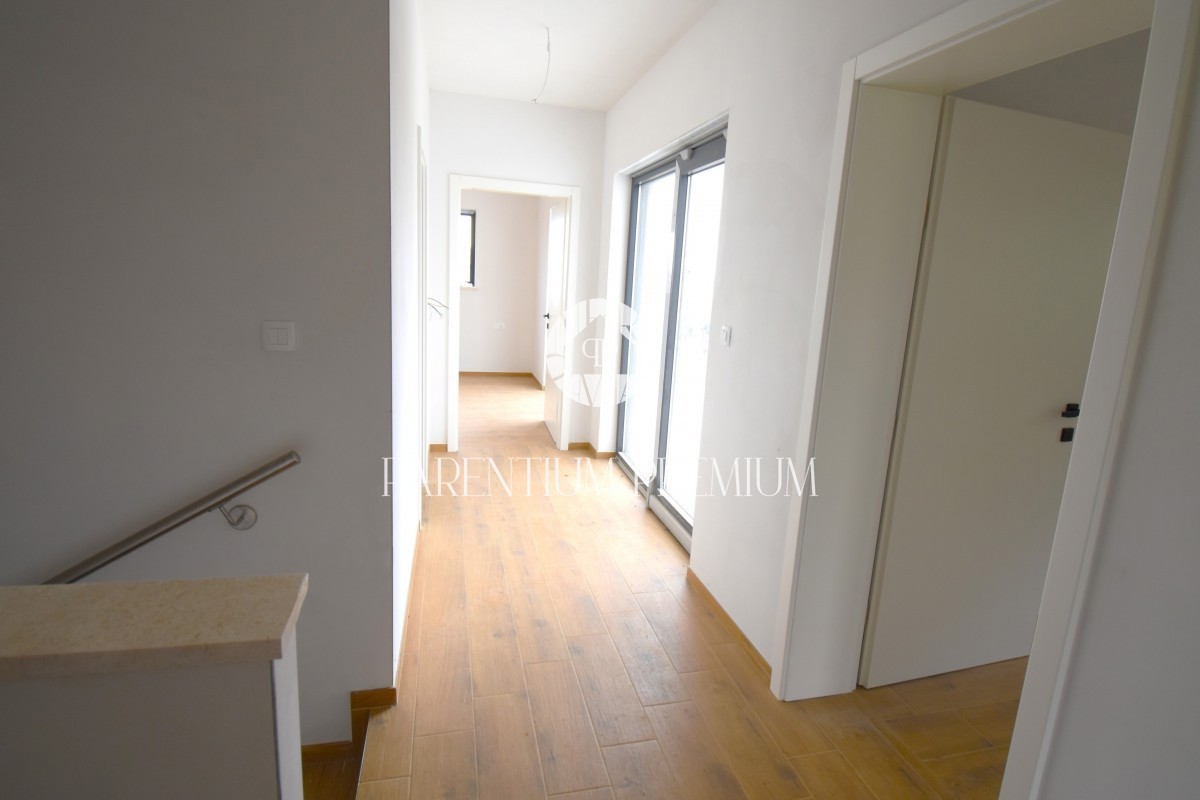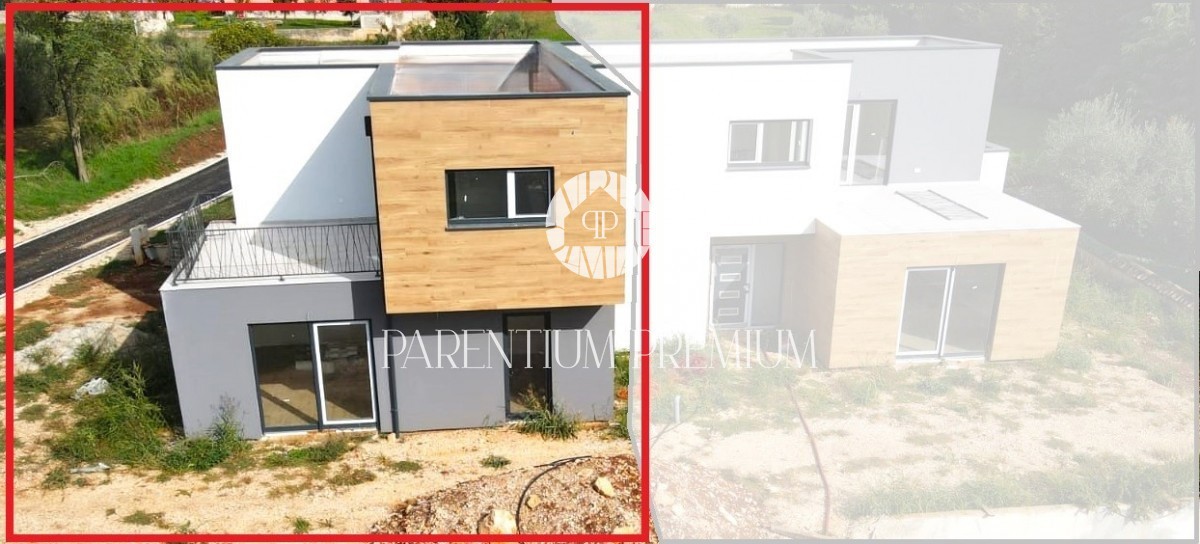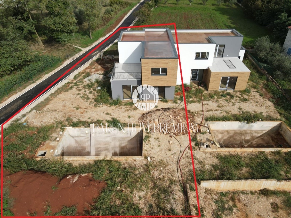 Istrien, Raum Poreč Zum Verkauf steht ein neu gebautes modernes Doppelhaus in der Nähe von Poreč, das sich auf einem Grundstück von 670 m² befindet und sich über Erdgeschoss und erste Etage erstreckt. Im Erdgeschoss gibt es eine Eingangshalle, ein Schlaf