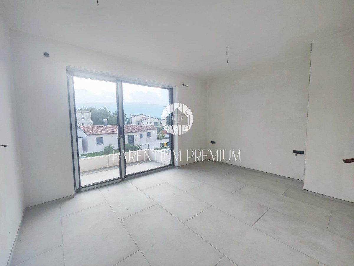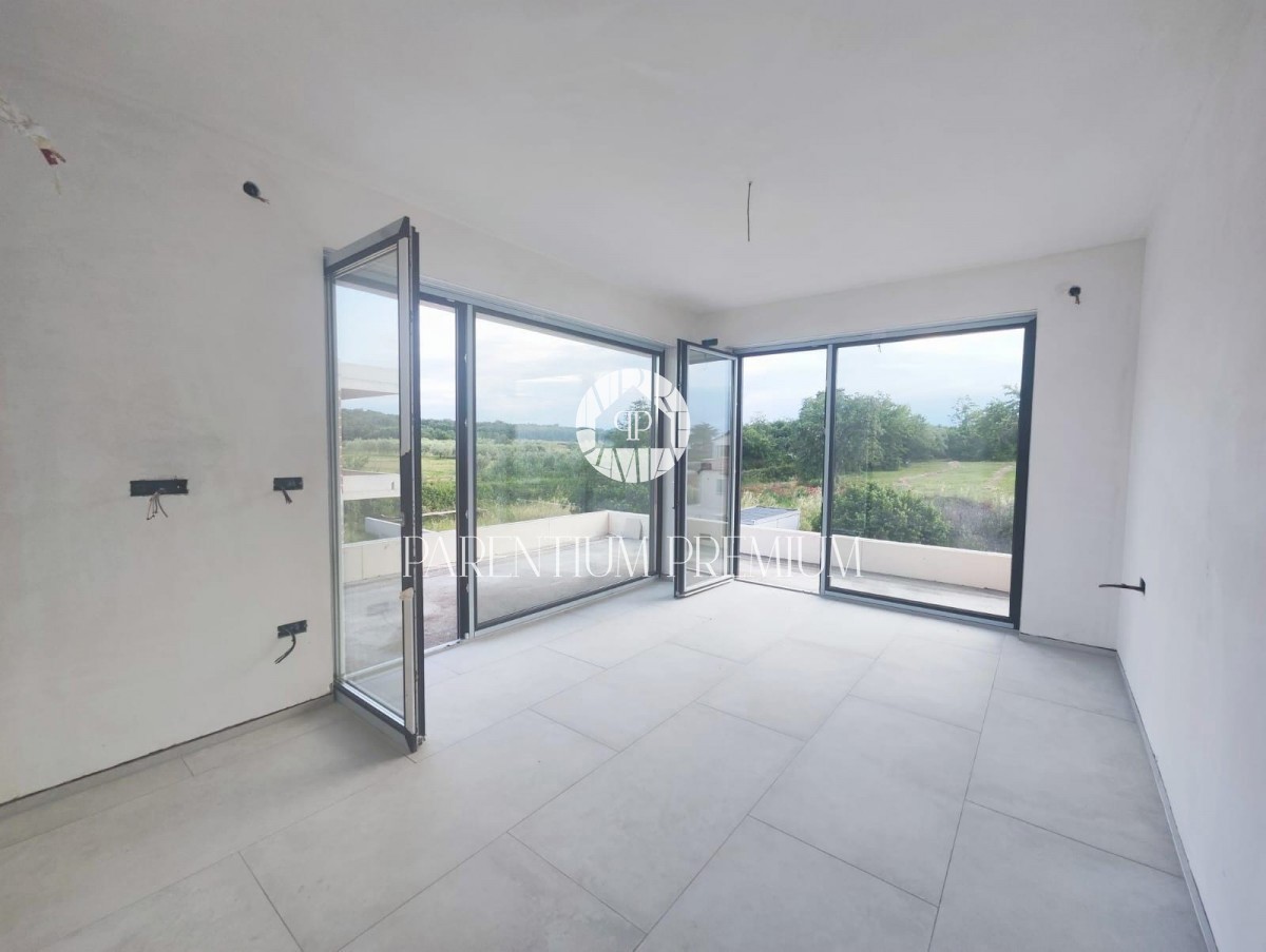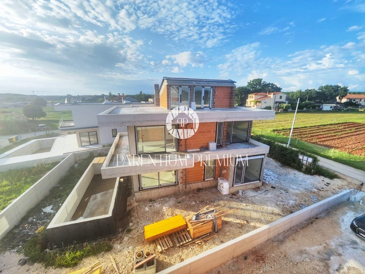 Modernes Haus in einem Neubau, Wohnfläche brutto 300 m2 und netto 233 m2 auf einem Grundstück von 548 m2. Das Erdgeschoss des Hauses besteht aus einem Eingangsbereich, einem Wohnzimmer mit offener Küche und Esszimmer, einem Technikraum, einem Abstellraum,
