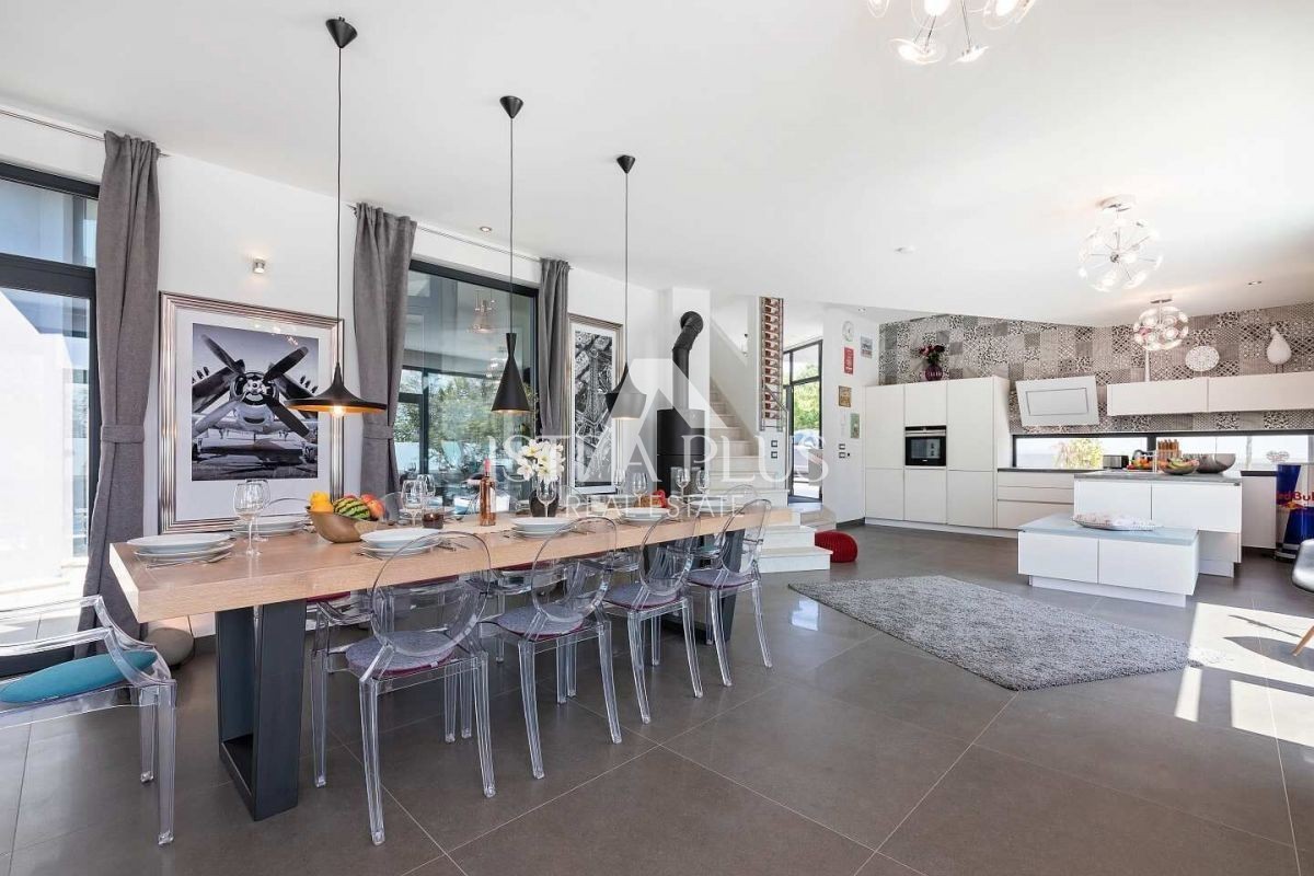 Unweit von Poreč und dem Meer steht auf einem 871 m2 großen Grundstück diese beeindruckende, moderne Villa mit 380 m² zum Verkauf. Die Villa wird von moderner Architektur mit klaren Linien und riesigen Glaswänden dominiert. Im Erdgeschoss der Villa befind