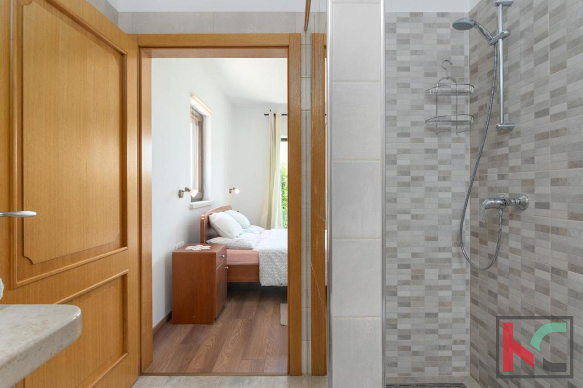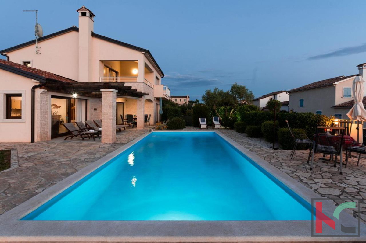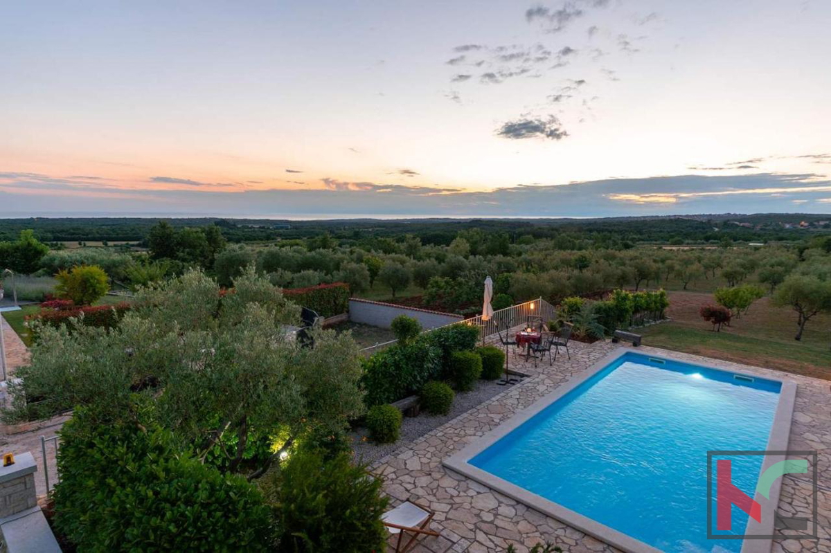 Eine wunderschöne Villa zum Verkauf in äußerst ruhiger Lage in der Nähe von Poreč, mit herrlichem Panoramablick auf das Meer und die Natur. Es wurde 2016 erbaut und erstreckt sich über zwei Etagen mit einer Gesamtwohnfläche von 166 m2. Im Erdgeschoss gib