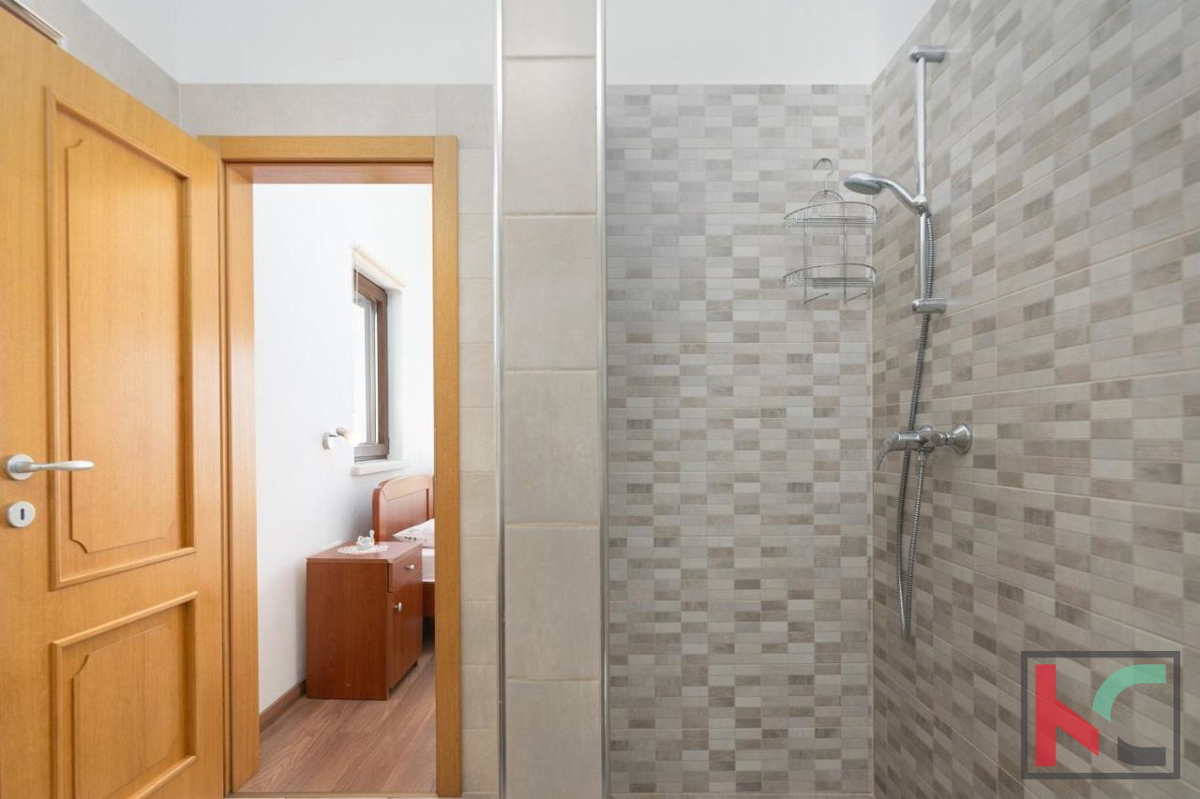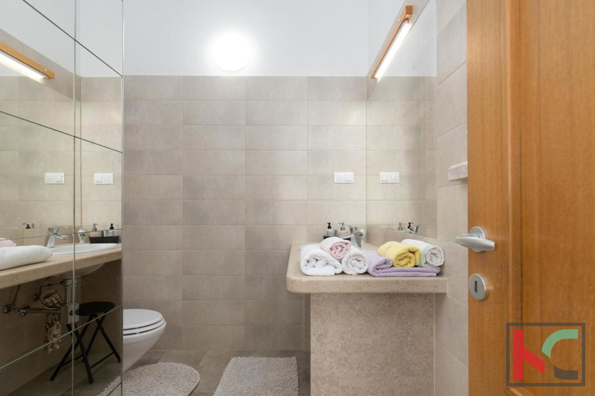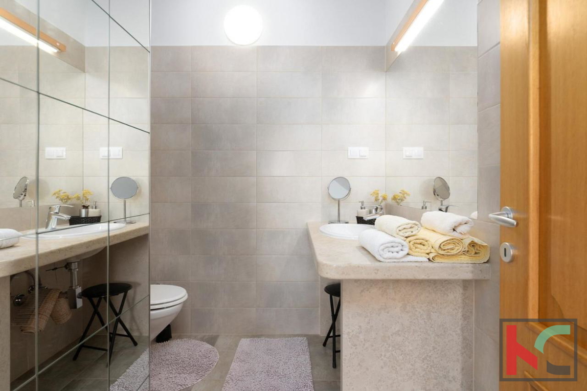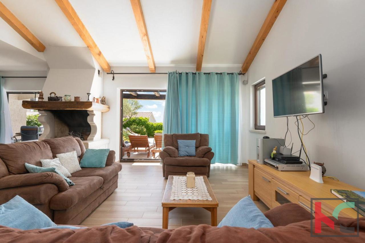 Eine wunderschöne Villa zum Verkauf in äußerst ruhiger Lage in der Nähe von Poreč, mit herrlichem Panoramablick auf das Meer und die Natur. Es wurde 2016 erbaut und erstreckt sich über zwei Etagen mit einer Gesamtwohnfläche von 166 m2. Im Erdgeschoss gib