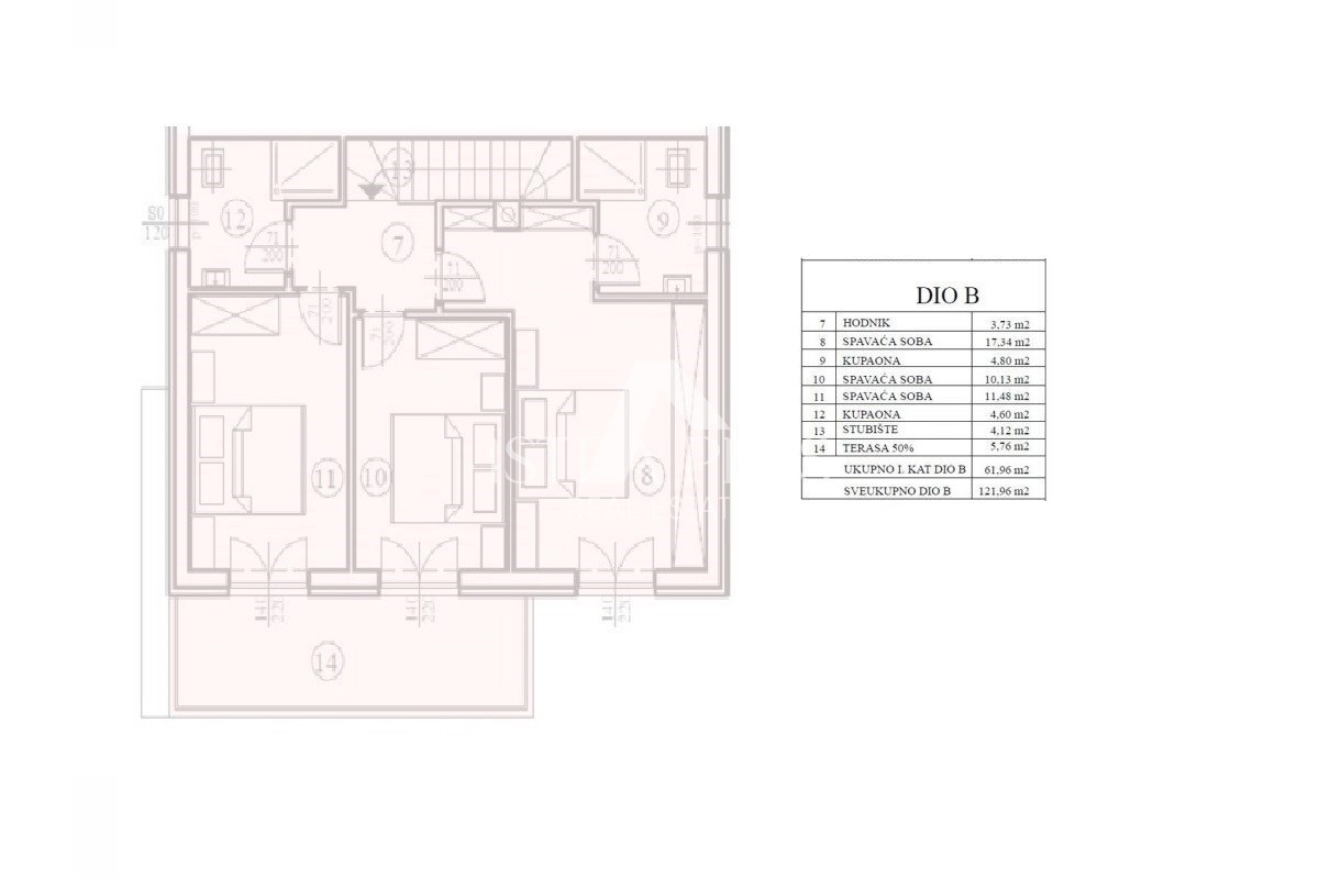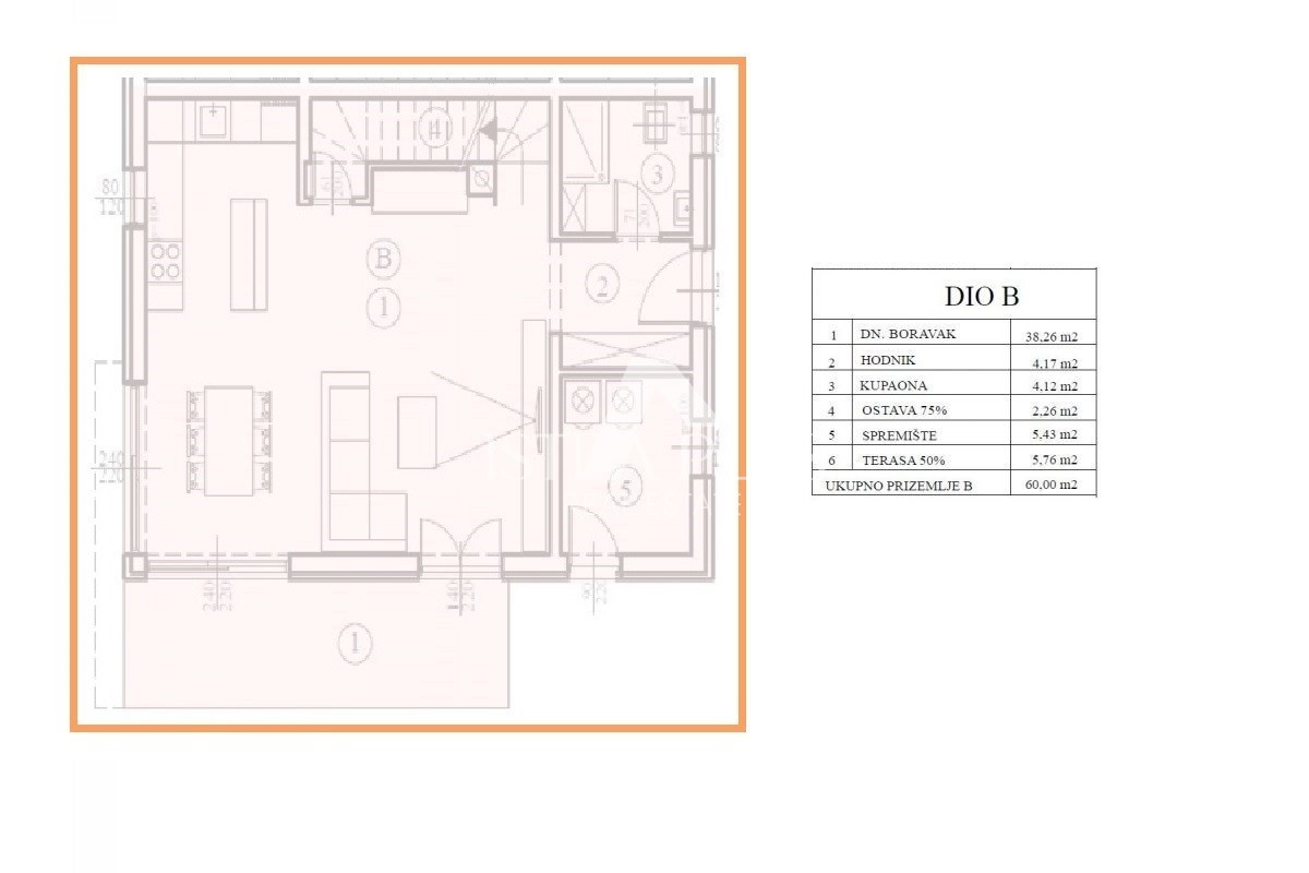 K122 Das Haus besteht aus Erdgeschoss und Obergeschoss. Im Erdgeschoss gibt es einen Flur, ein Badezimmer, eine Küche mit Esszimmer und Wohnzimmer, einen Abstellraum, einen Abstellraum und eine großzügige Terrasse, die teilweise überdacht ist und mit der