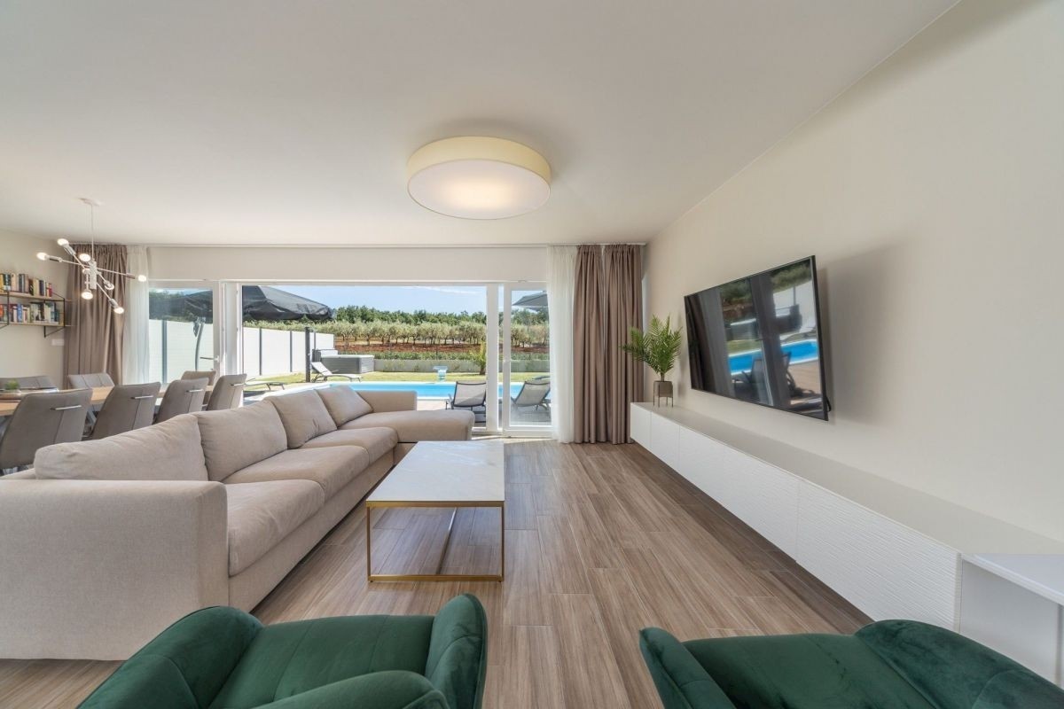 Diese schöne moderne Villa befindet sich in einer kleinen istrischen Stadt nur wenige Kilometer von Porec entfernt. Die Villa von 261,28 m2 verfügt über sechs Schlafzimmer, die einen schönen Blick auf die märchenhafte istrische Landschaft, Olivenhaine und