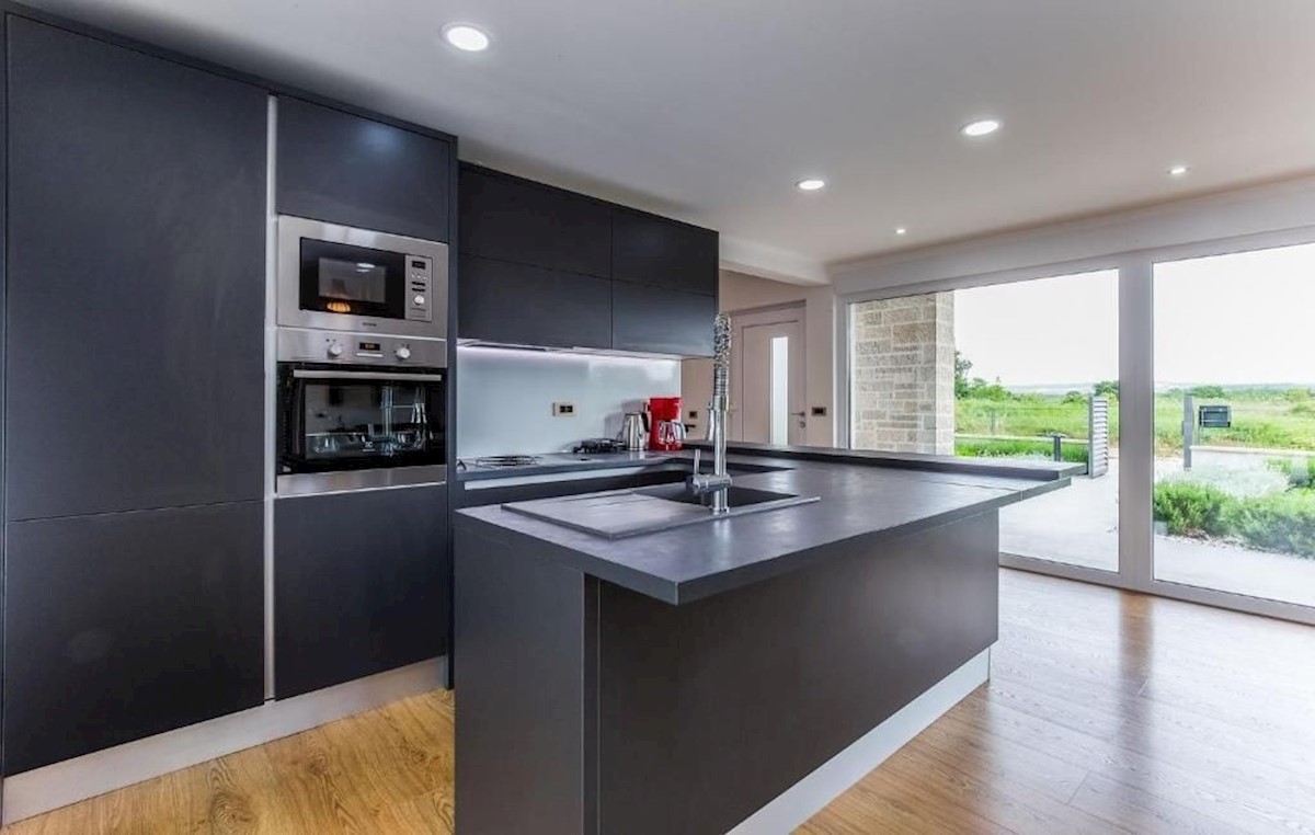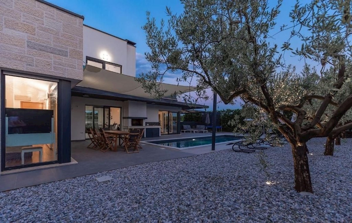 Moderne Villa mit Pool von ca. 250 m2, in der Nähe von Visnjan - im Untergeschoss befindet sich eine Taverne mit Kamin, Bad, Waschküche und Ruhebereich, ausgestattet mit der ersten Phase des Whirlpools. Das Erdgeschoss verfügt über ein Wohnzimmer, eine Kü