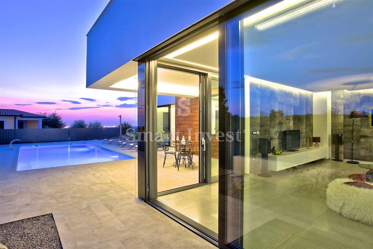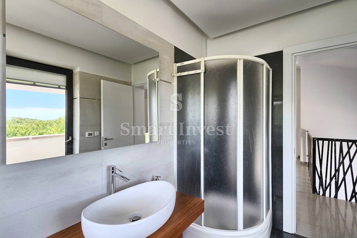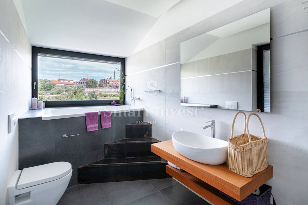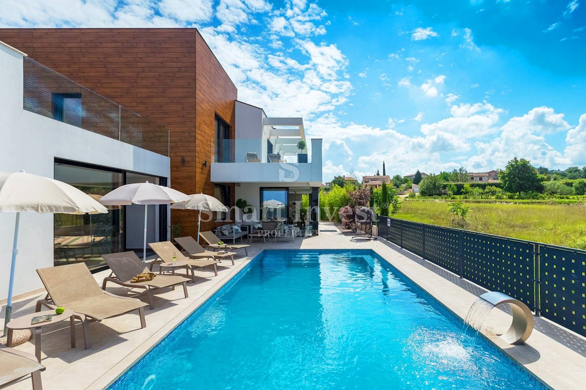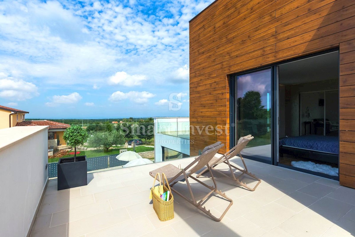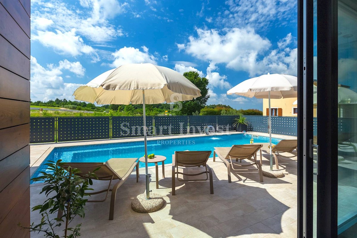 ISTRIEN - POREČ Nähe. Zum Verkauf steht eine moderne Villa mit Pool und Meerblick in schöner ruhiger Lage in der Nähe von Porec, 10 km vom Meer entfernt. Die Villa besteht aus Keller, Erdgeschoss und Obergeschoss, mit einer Gesamtfläche von 370 m2 auf ei