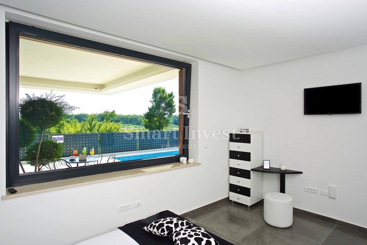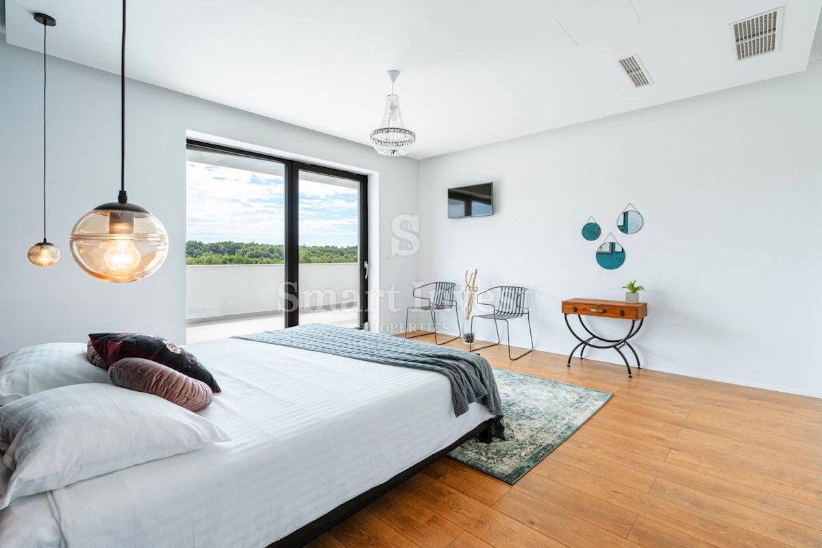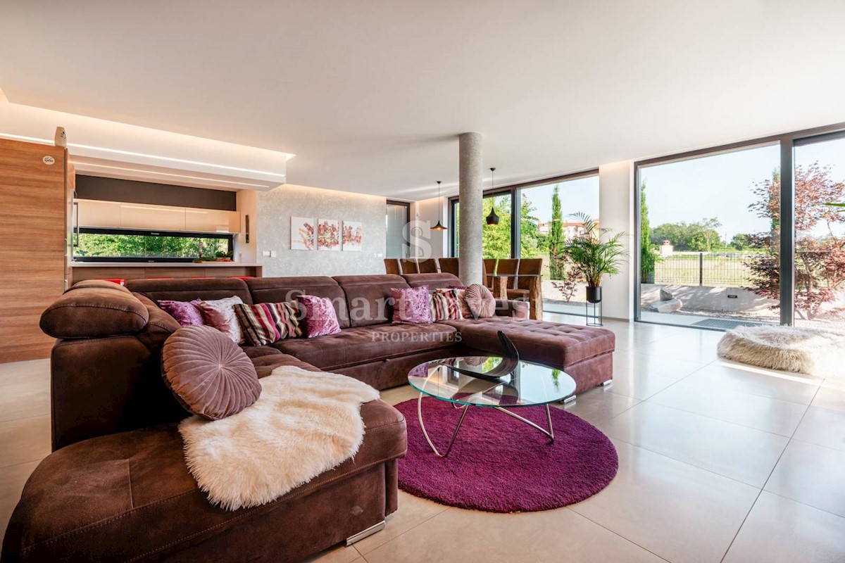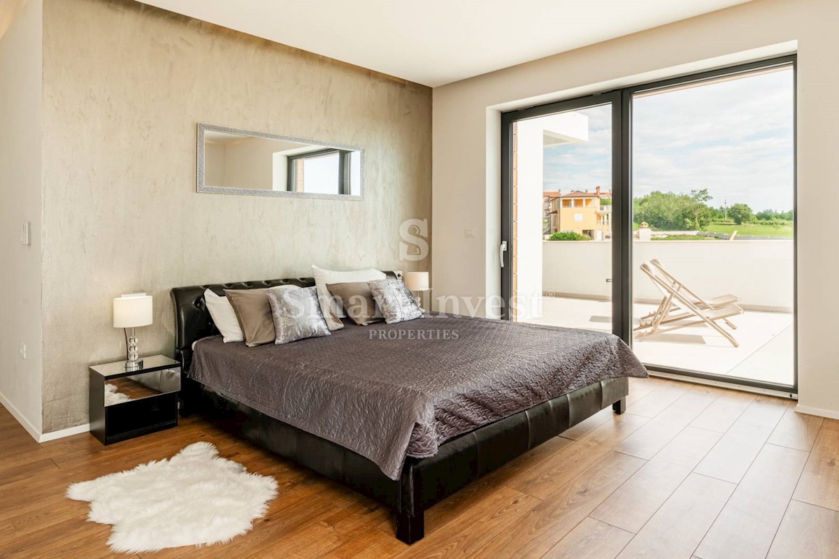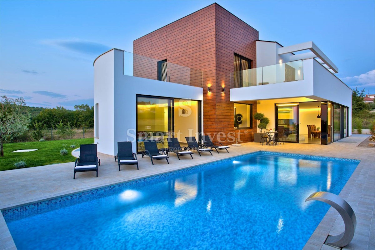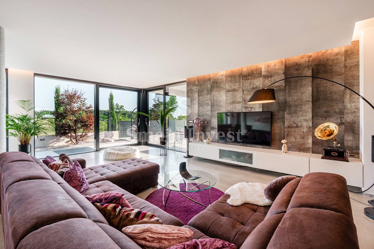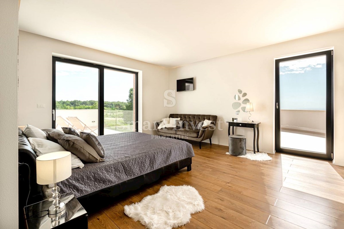 ISTRIEN - POREČ Nähe. Zum Verkauf steht eine moderne Villa mit Pool und Meerblick in schöner ruhiger Lage in der Nähe von Porec, 10 km vom Meer entfernt. Die Villa besteht aus Keller, Erdgeschoss und Obergeschoss, mit einer Gesamtfläche von 370 m2 auf ei