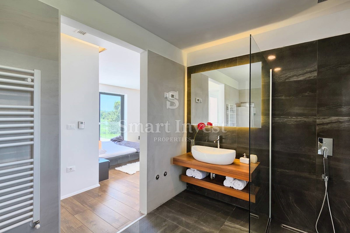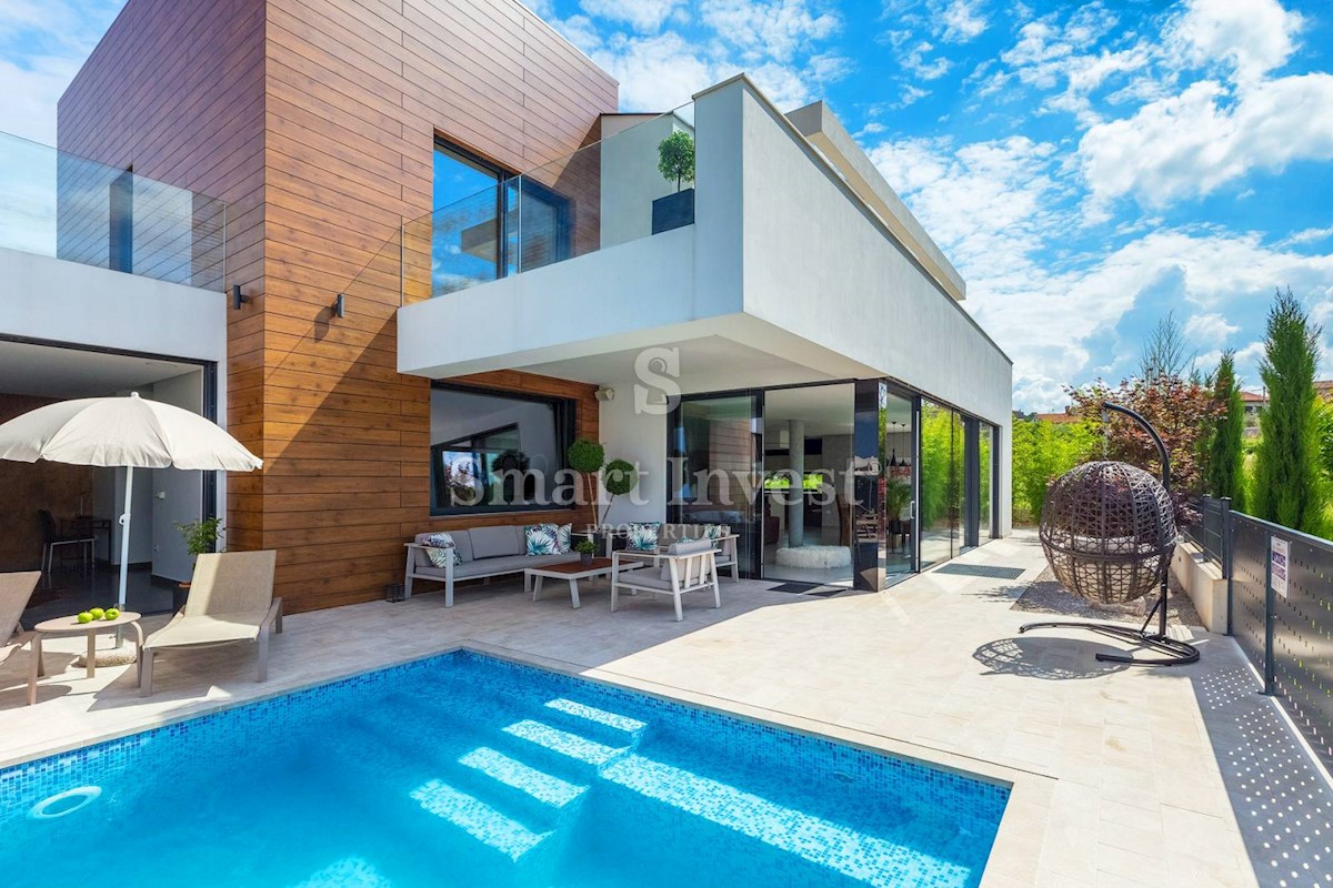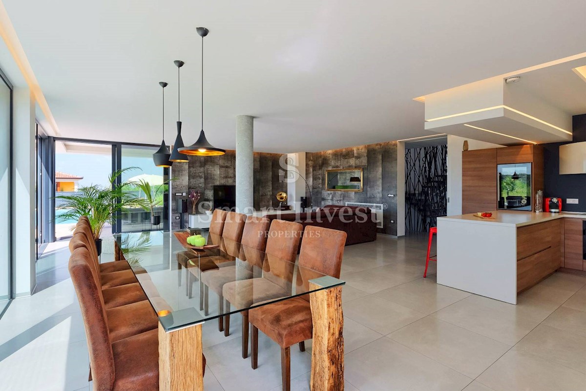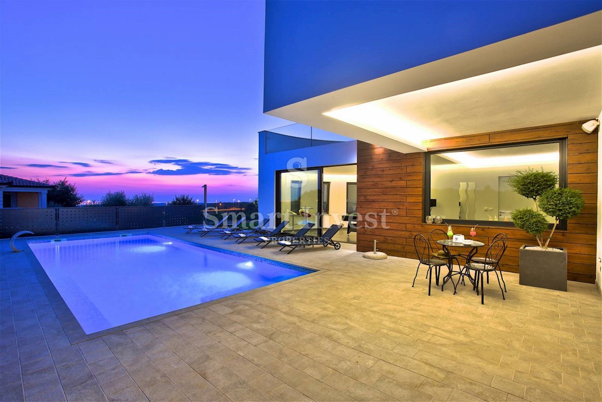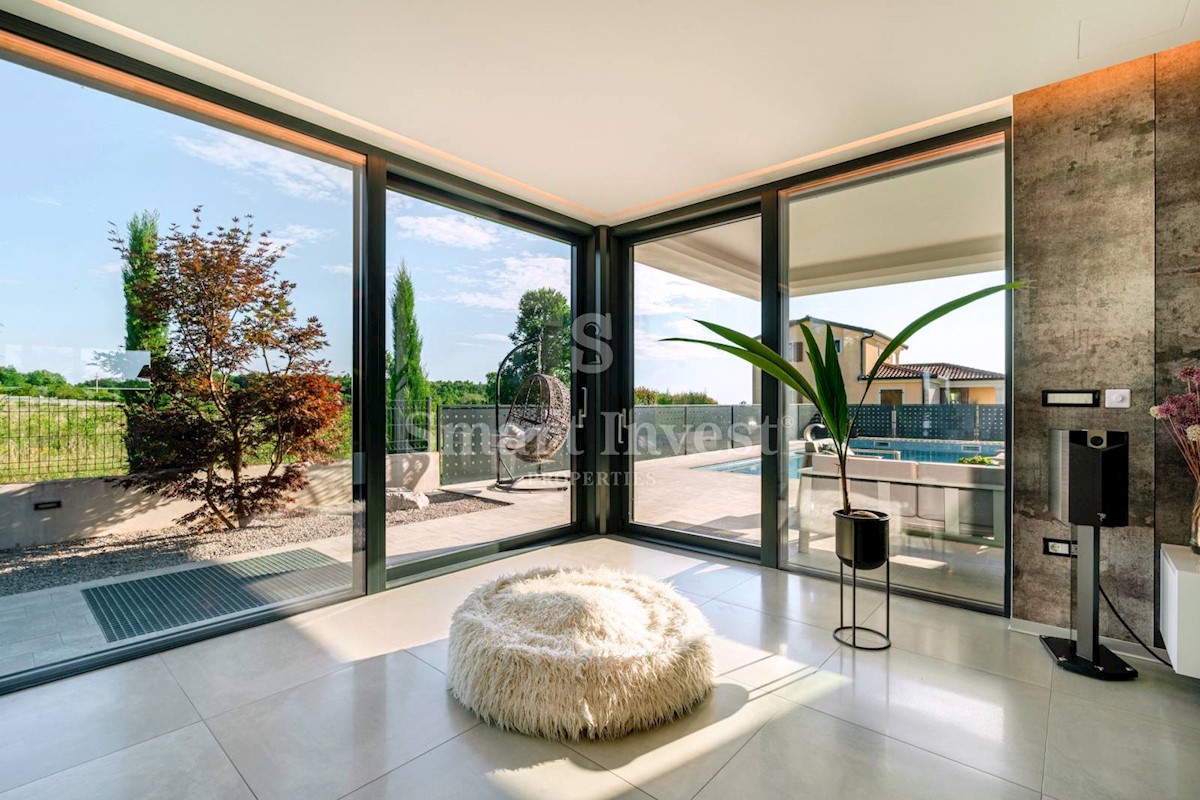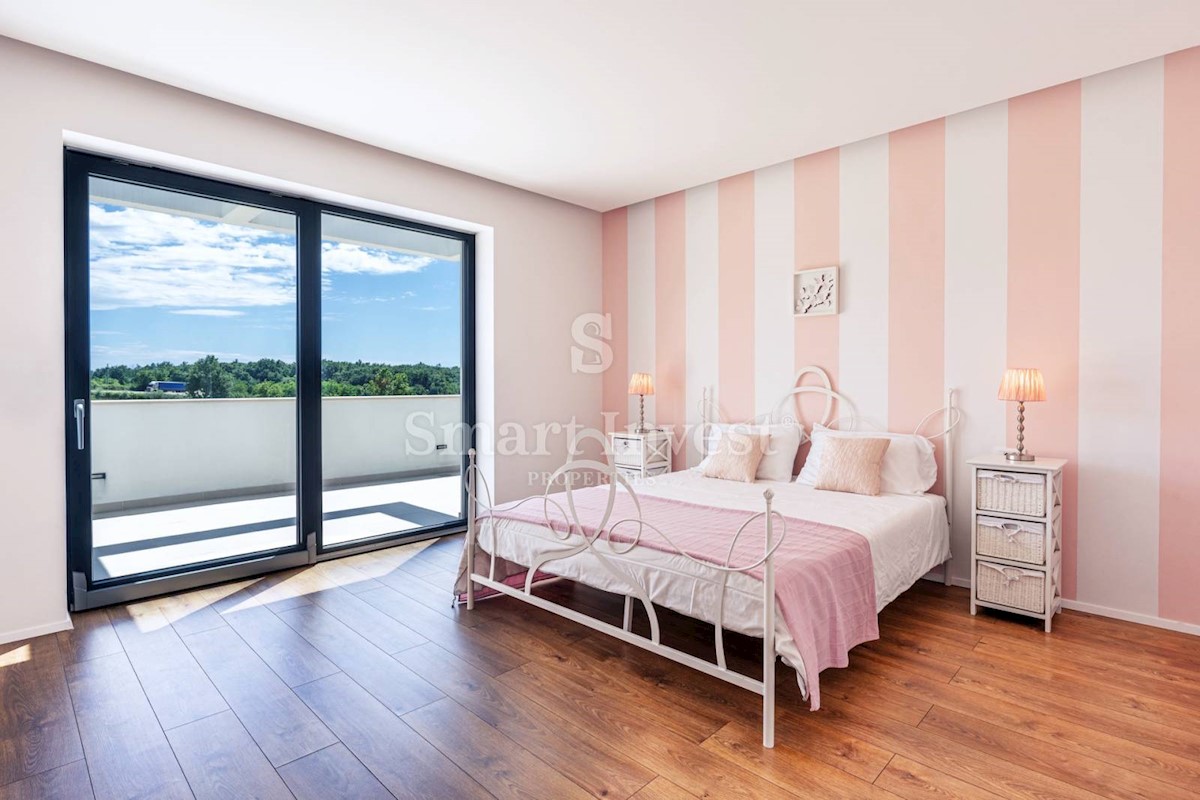 ISTRIEN - POREČ Nähe. Zum Verkauf steht eine moderne Villa mit Pool und Meerblick in schöner ruhiger Lage in der Nähe von Porec, 10 km vom Meer entfernt. Die Villa besteht aus Keller, Erdgeschoss und Obergeschoss, mit einer Gesamtfläche von 370 m2 auf ei
