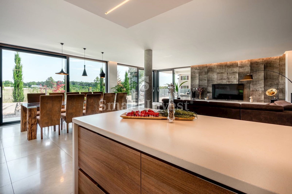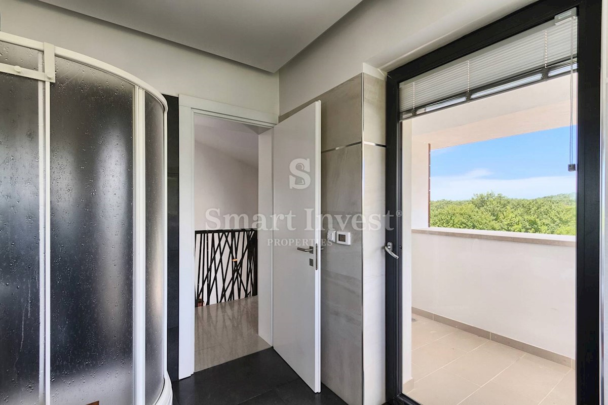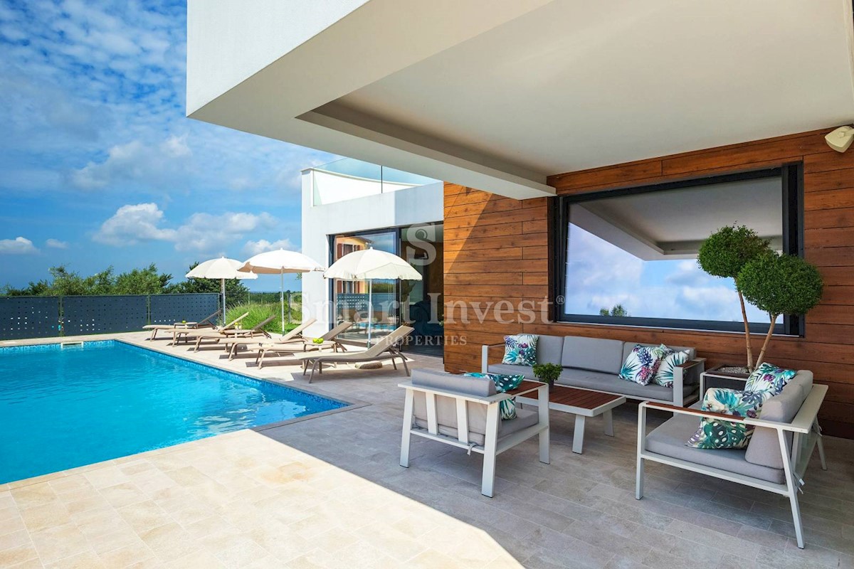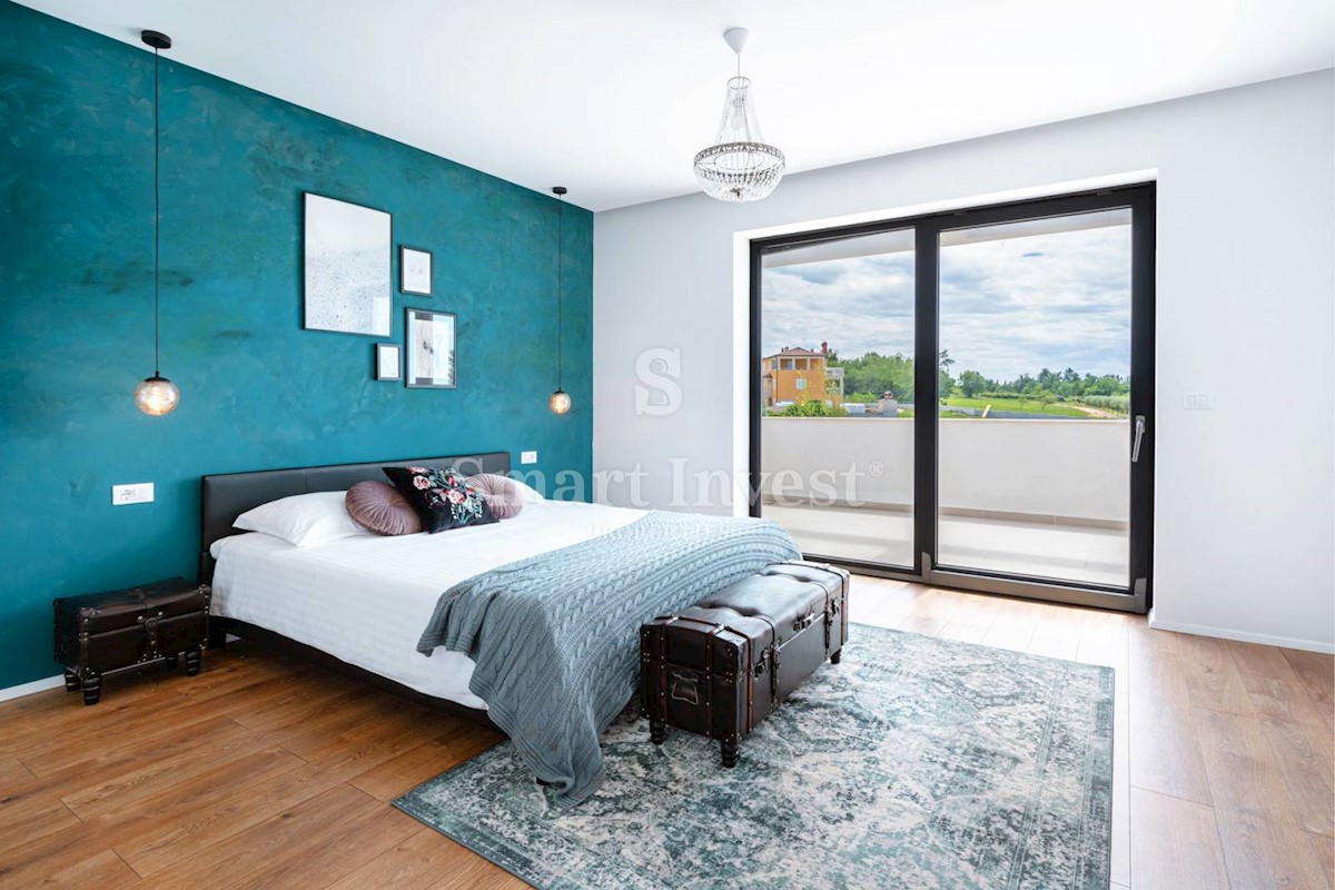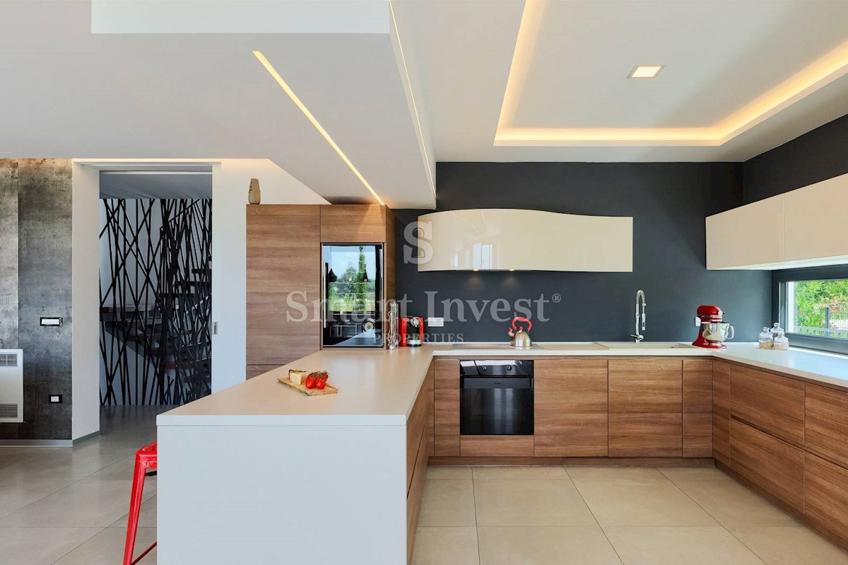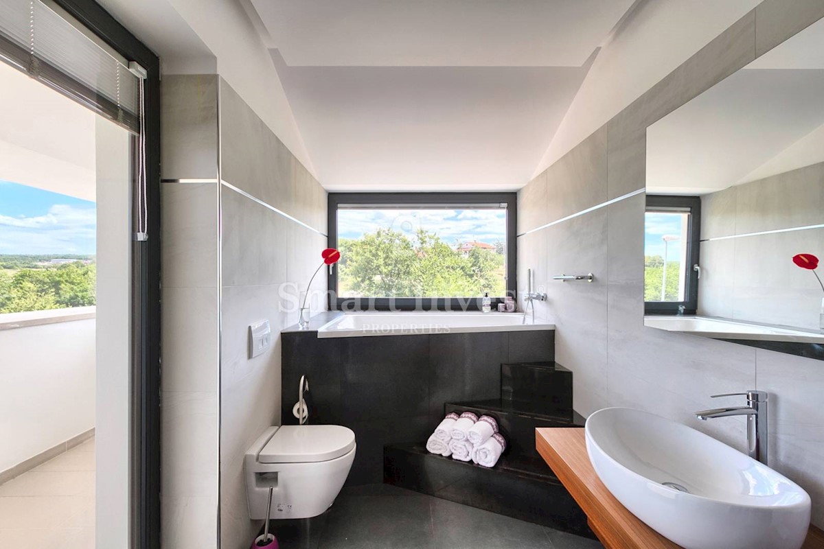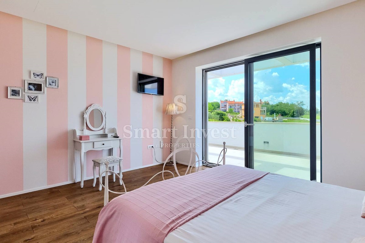 ISTRIEN - POREČ Nähe. Zum Verkauf steht eine moderne Villa mit Pool und Meerblick in schöner ruhiger Lage in der Nähe von Porec, 10 km vom Meer entfernt. Die Villa besteht aus Keller, Erdgeschoss und Obergeschoss, mit einer Gesamtfläche von 370 m2 auf ei
