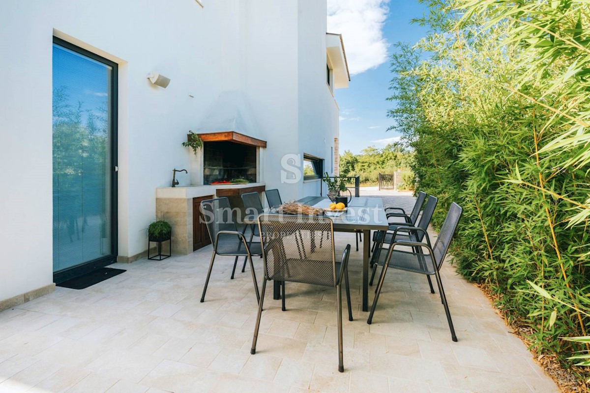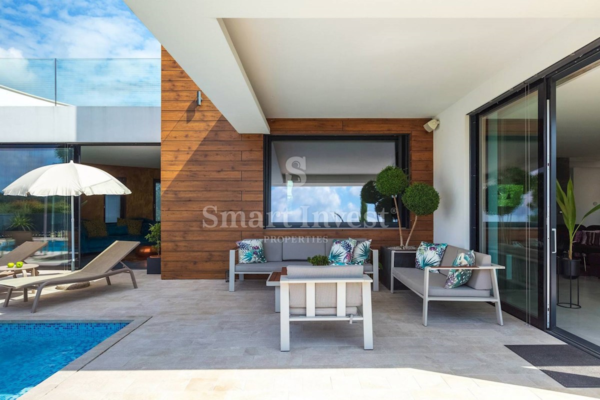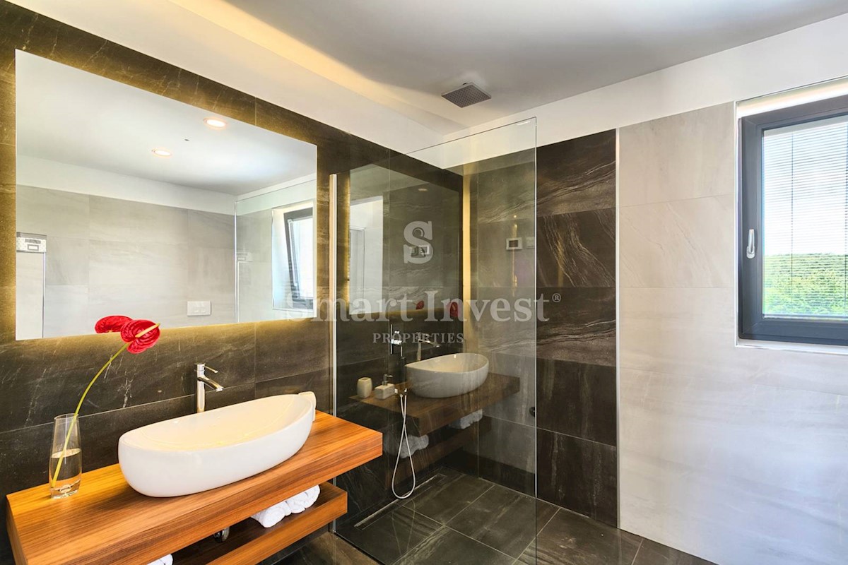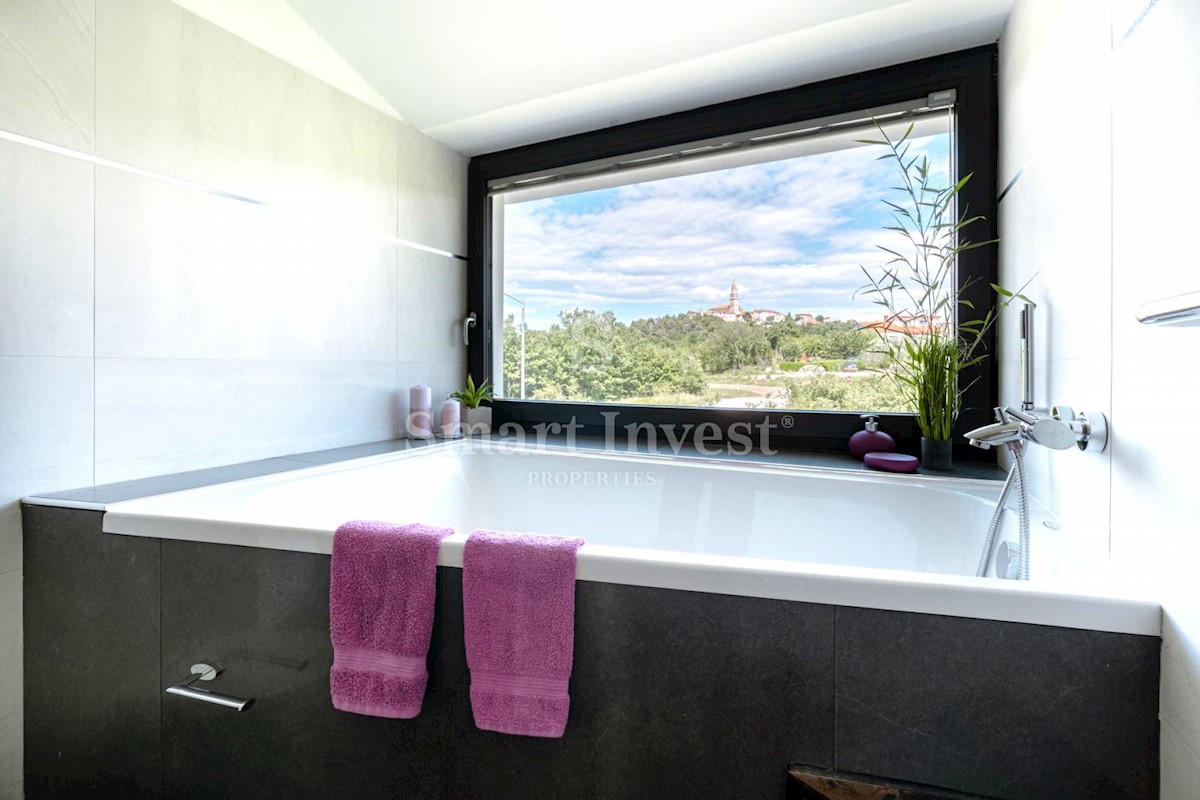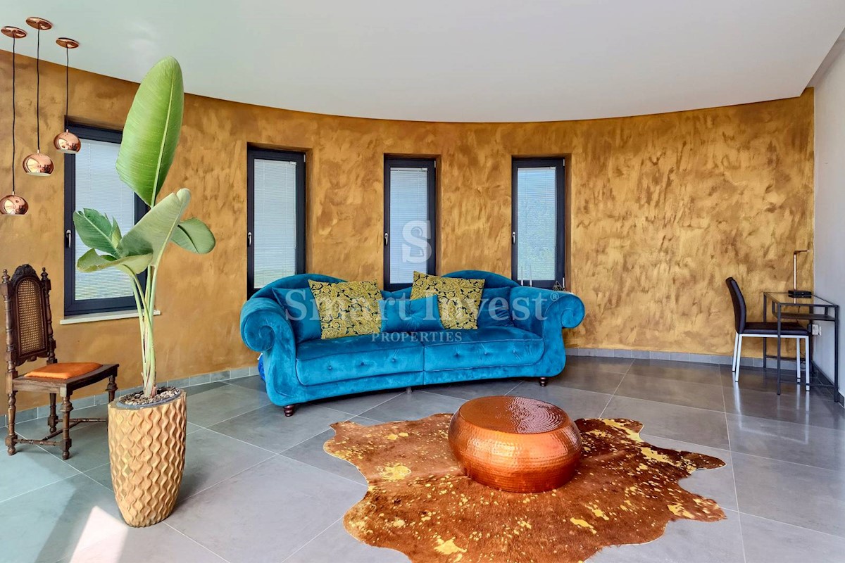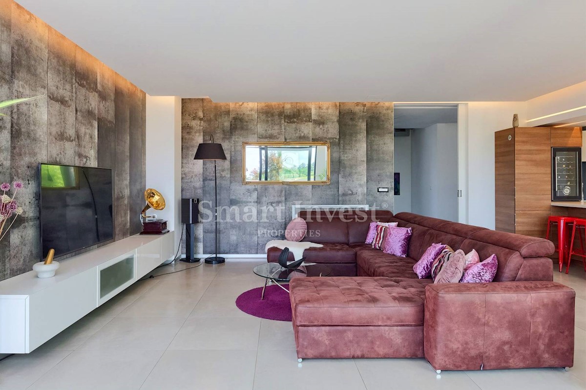 ISTRIEN - POREČ Nähe. Zum Verkauf steht eine moderne Villa mit Pool und Meerblick in schöner ruhiger Lage in der Nähe von Porec, 10 km vom Meer entfernt. Die Villa besteht aus Keller, Erdgeschoss und Obergeschoss, mit einer Gesamtfläche von 370 m2 auf ei