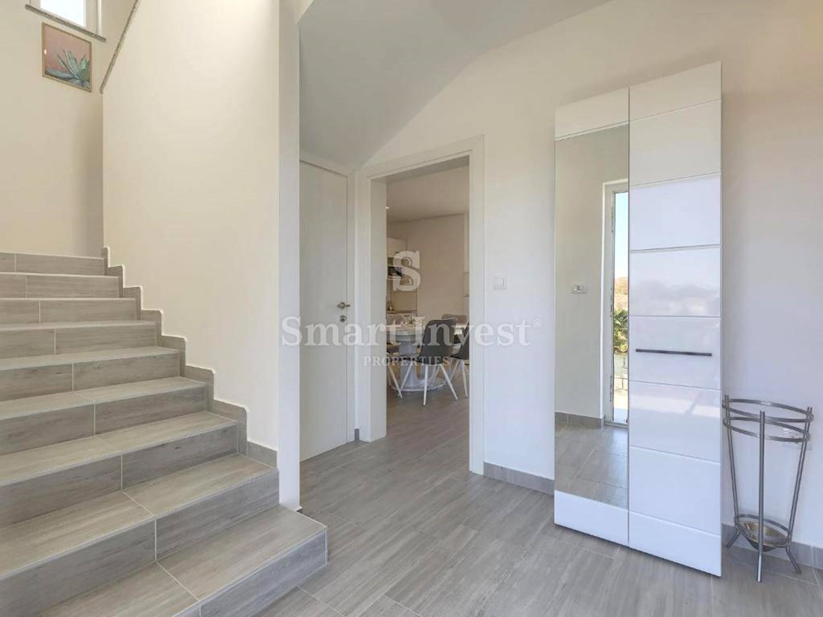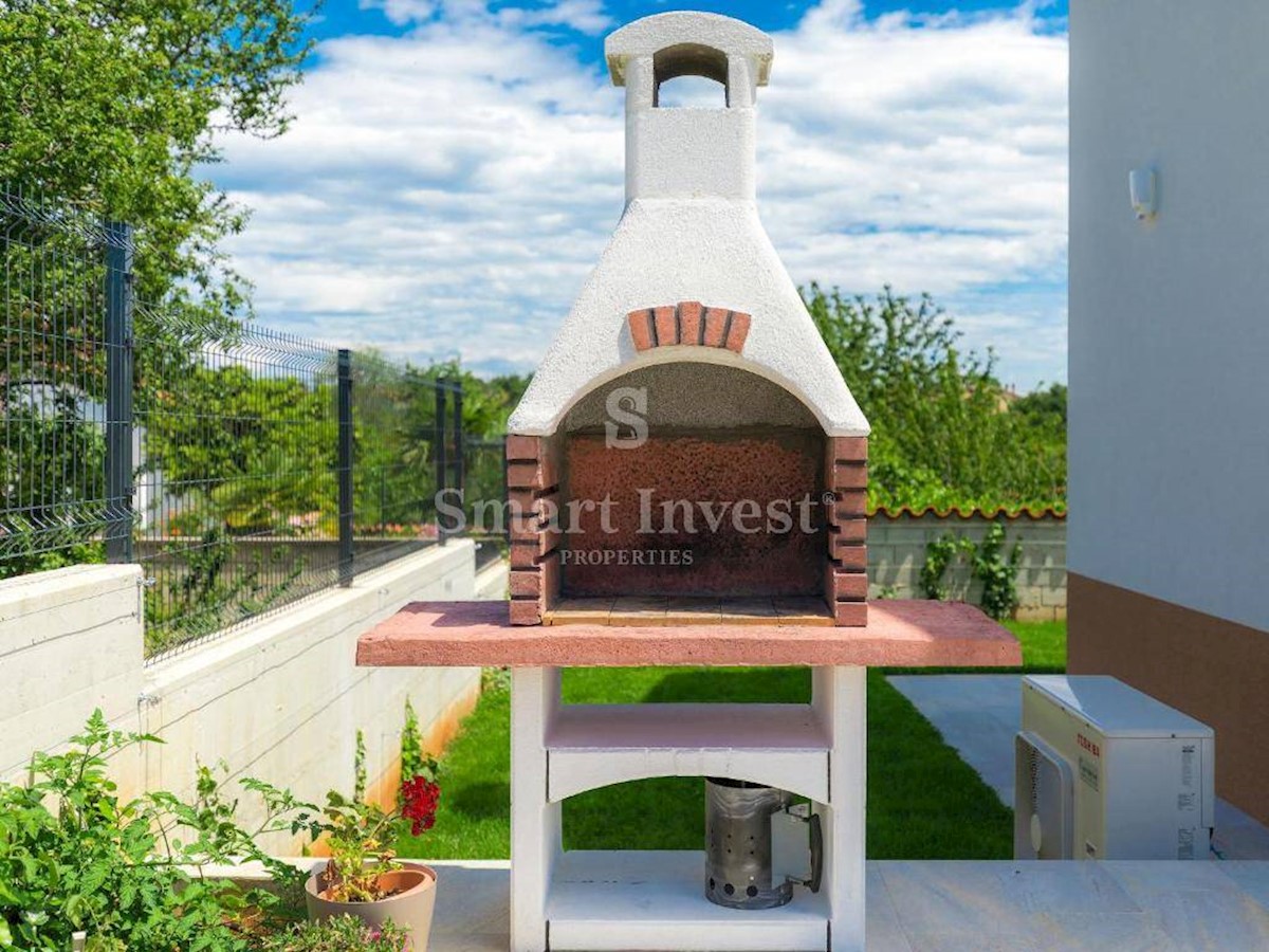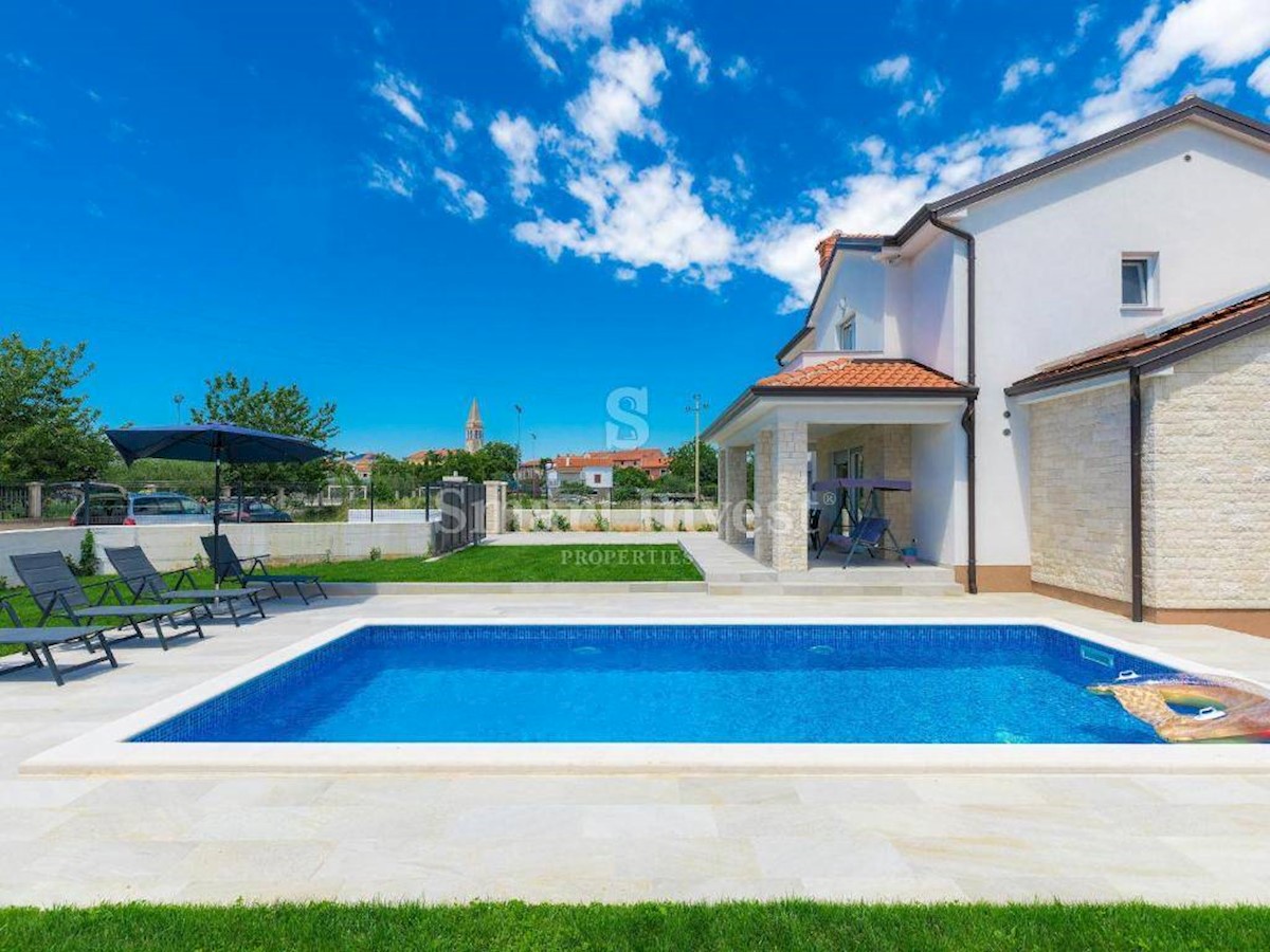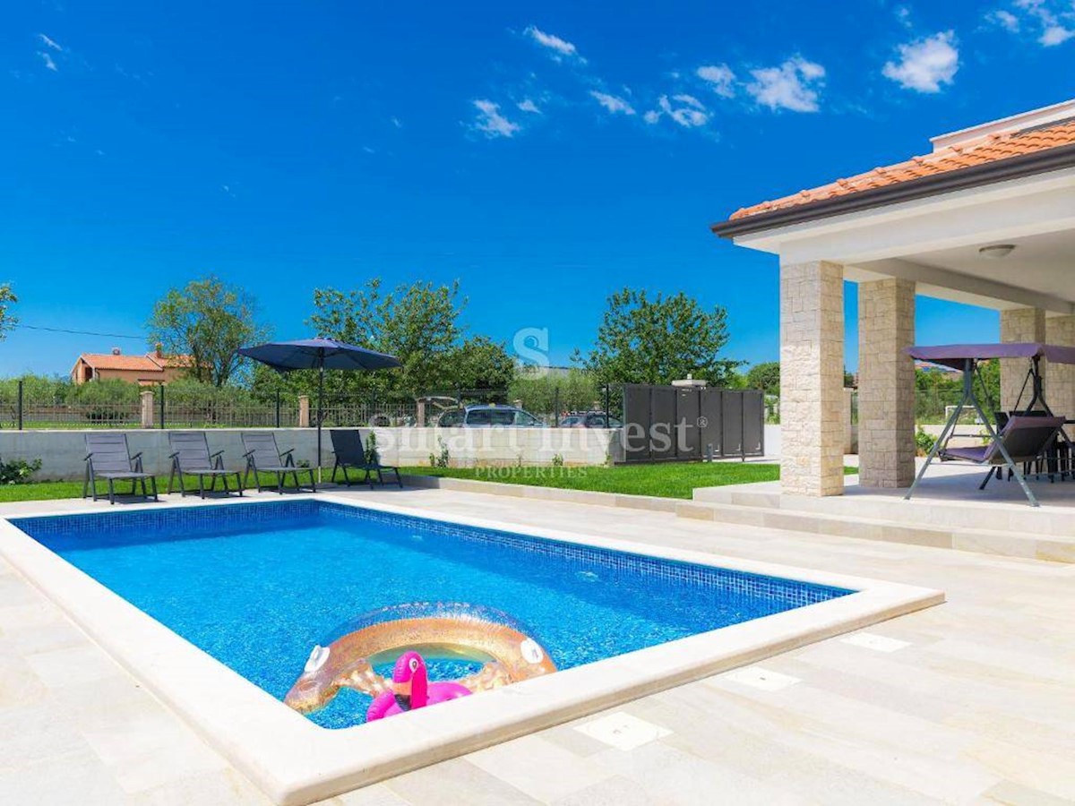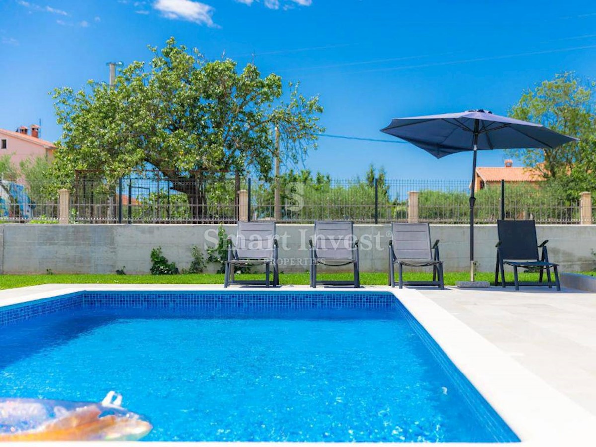 ISTRIEN - POREČ Nähe. Zum Verkauf steht ein neu gebautes Einfamilienhaus mit Swimmingpool und schönem Garten in ruhiger Lage, 5 km vom Meer, den Stränden und 7 km vom Zentrum von Poreč entfernt. Das Haus hat 150 qm Wohnfläche, auf einem Grundstück von 65