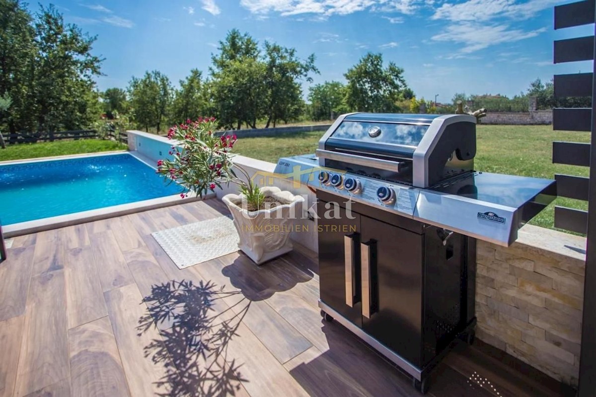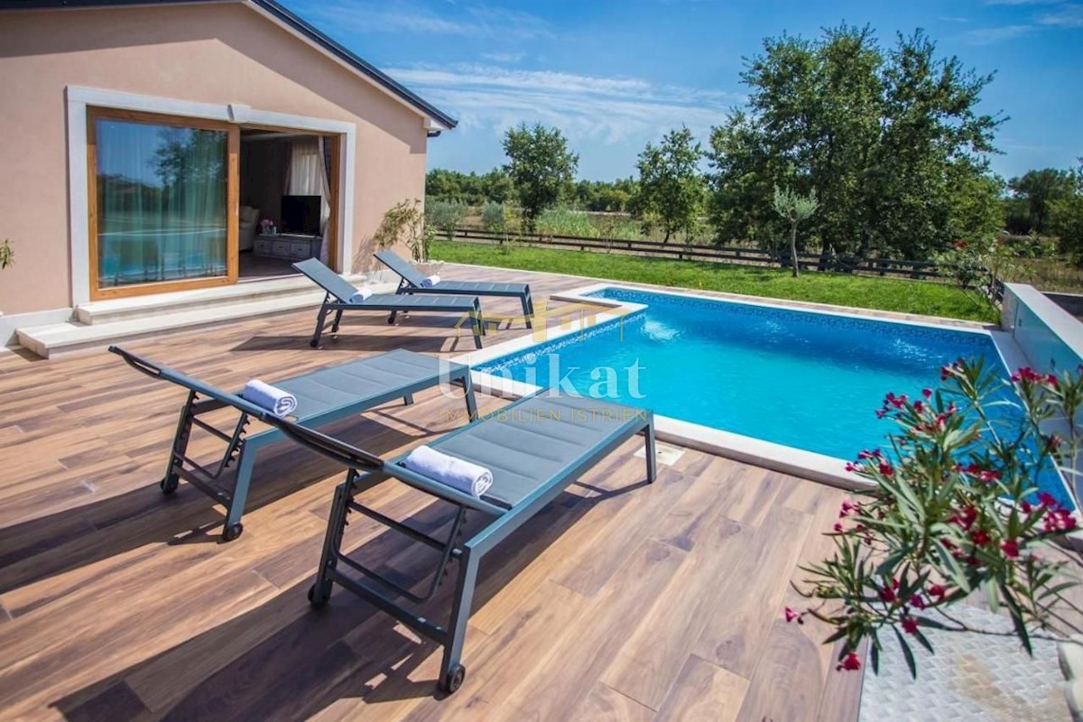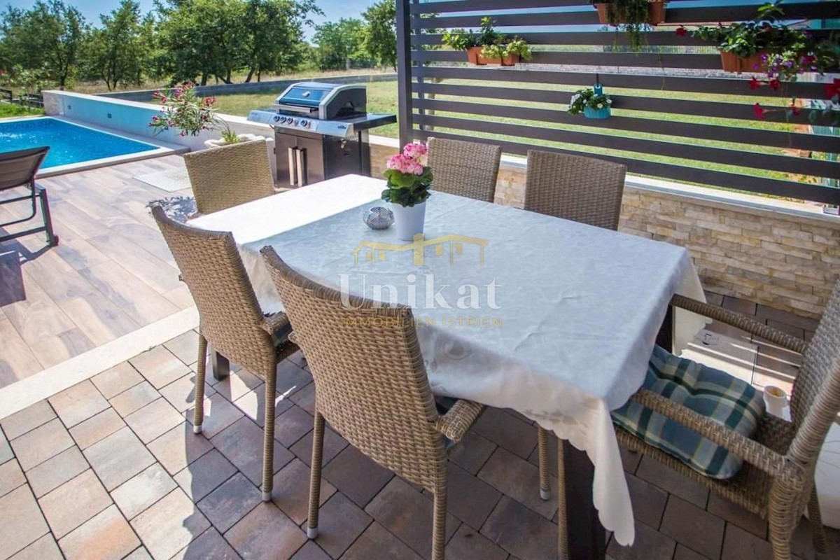 Wunderschöner Bungalow 9 km von Poreč und dem Meer entfernt, nutzbare Wohnfläche 84 m2 auf einem Grundstück von 1.063 m2. Das Haus besteht aus Flur, Wohnzimmer mit Küche und Esszimmer, zwei Schlafzimmern und zwei Badezimmern. Es ist mit Klimaanlagen zum H
