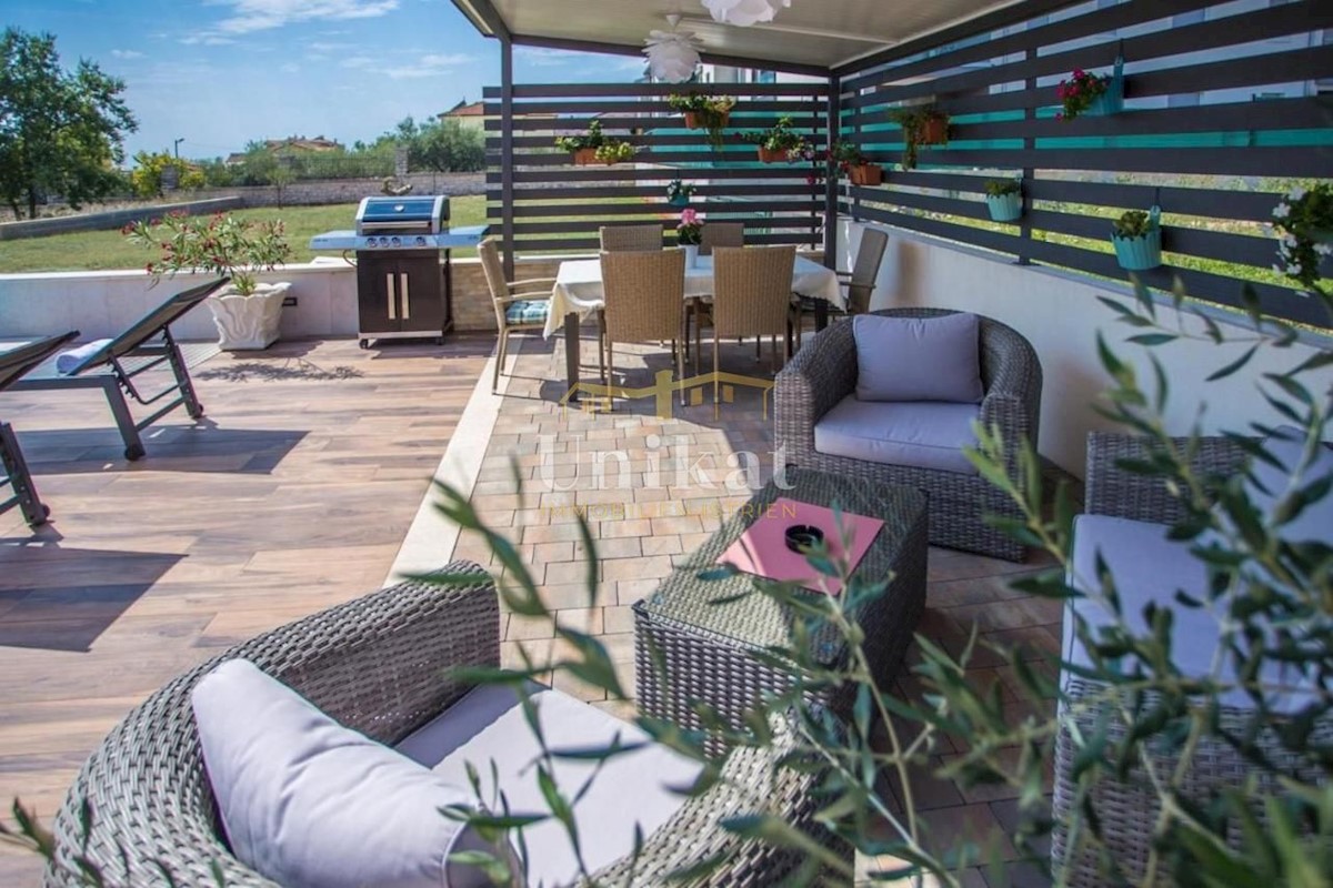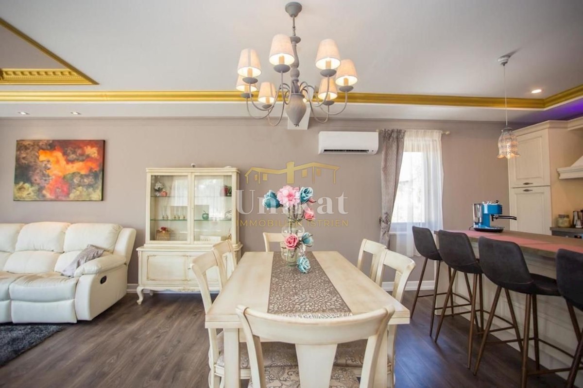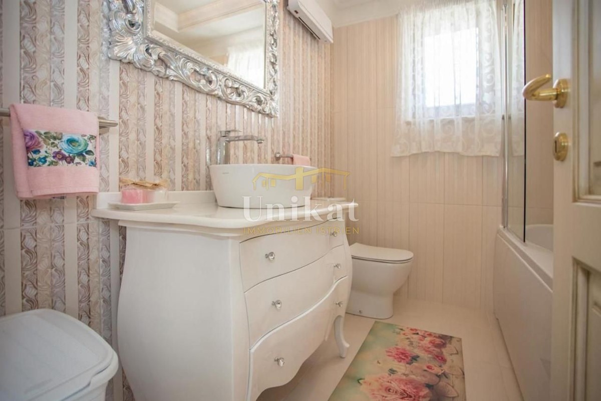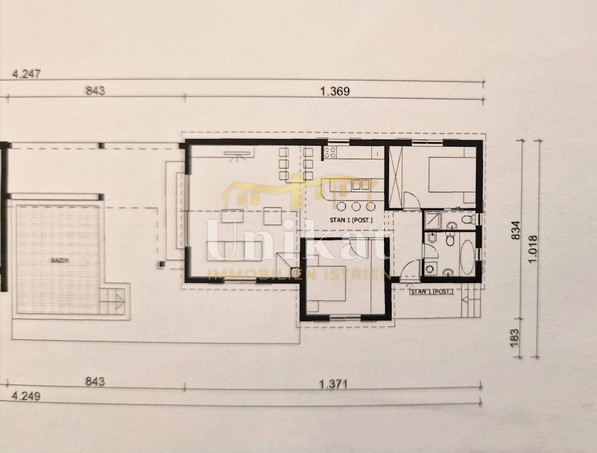 Wunderschöner Bungalow 9 km von Poreč und dem Meer entfernt, nutzbare Wohnfläche 84 m2 auf einem Grundstück von 1.063 m2. Das Haus besteht aus Flur, Wohnzimmer mit Küche und Esszimmer, zwei Schlafzimmern und zwei Badezimmern. Es ist mit Klimaanlagen zum H