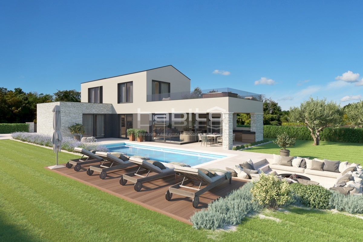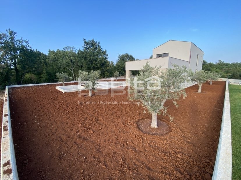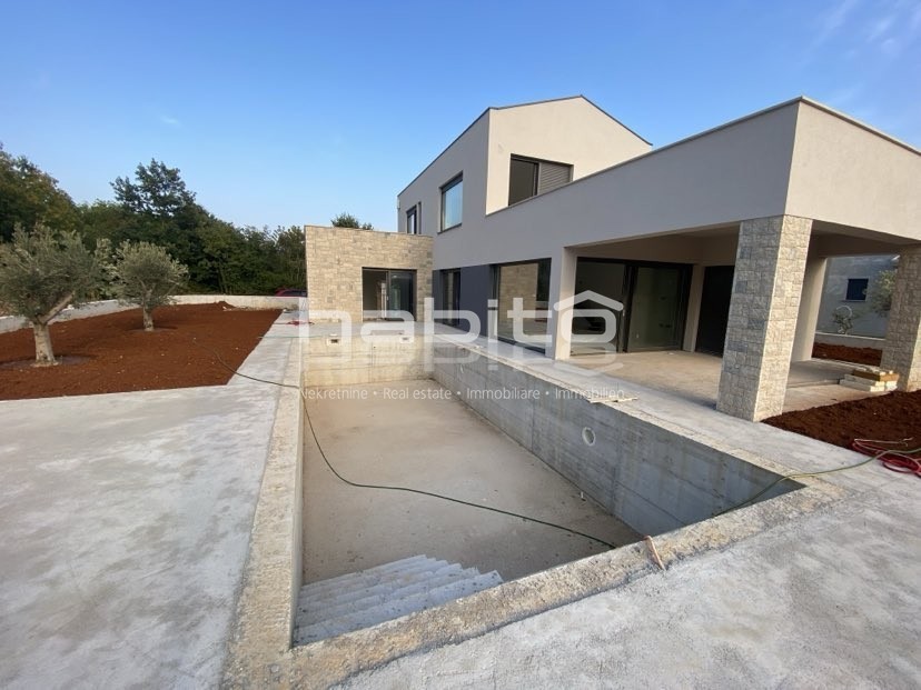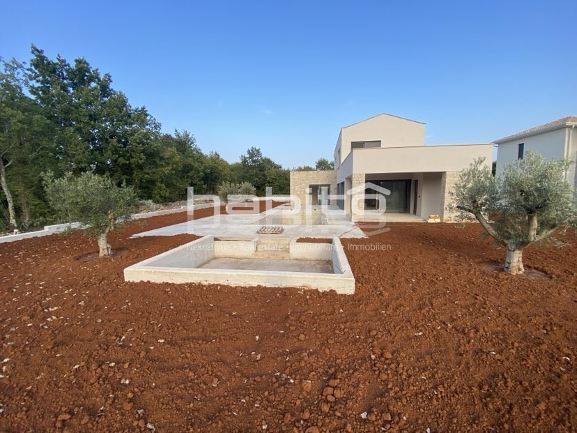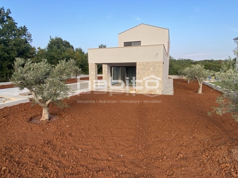 In der ruhigen und kleinen Stadt 18 km von Porec, umgeben von purer Natur, befindet sich diese schöne Villa, die sich im Bau befindet. Auf einem Grundstück von 968 m2 entsteht eine Villa mit 230 m2 brutto, d.h. 170 m2 netto Quadratmeter. Das Haus besteht
