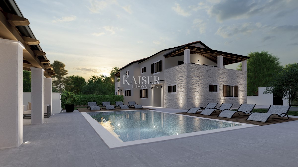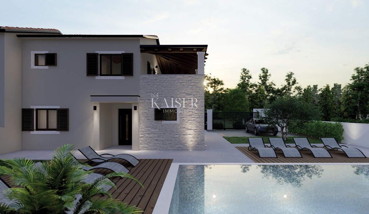 Kaiser Immobilien präsentiert eine wunderschöne neue Villa mit Swimmingpool in der Nähe der Stadt Poreč. Die Villa befindet sich in einem Touristenort, nur 4 km vom Zentrum von Poreč entfernt. Nicht weit von der Villa entfernt befinden sich Restaurants, e