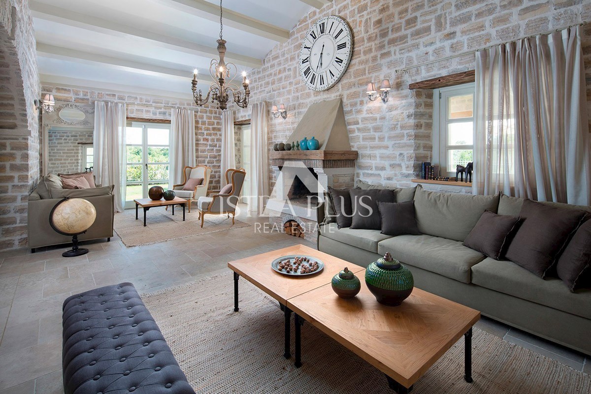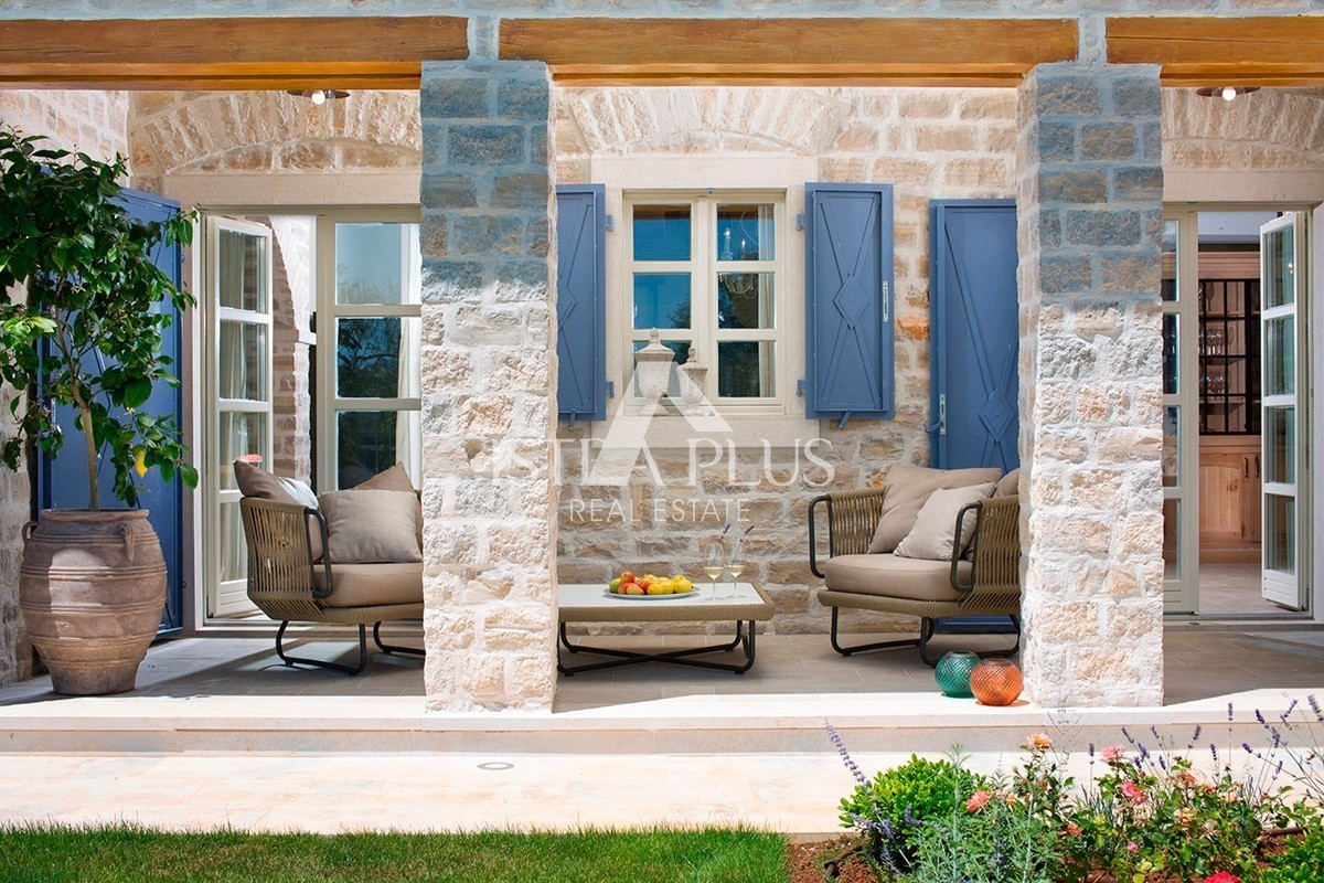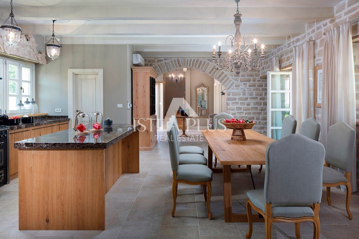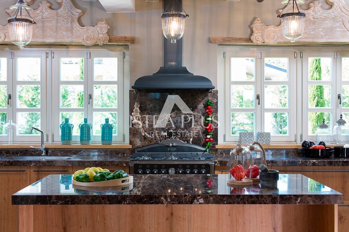 K94 Luxusvilla mit einem Pool von 353 m2 auf zwei vollklimatisierten Etagen mit einer Kapazität von 8 Personen. Im Erdgeschoss gibt es ein geräumiges Wohnzimmer mit Kamin, ein Esszimmer mit Tisch und Stühlen für 8 Personen, eine voll ausgestattete rustika