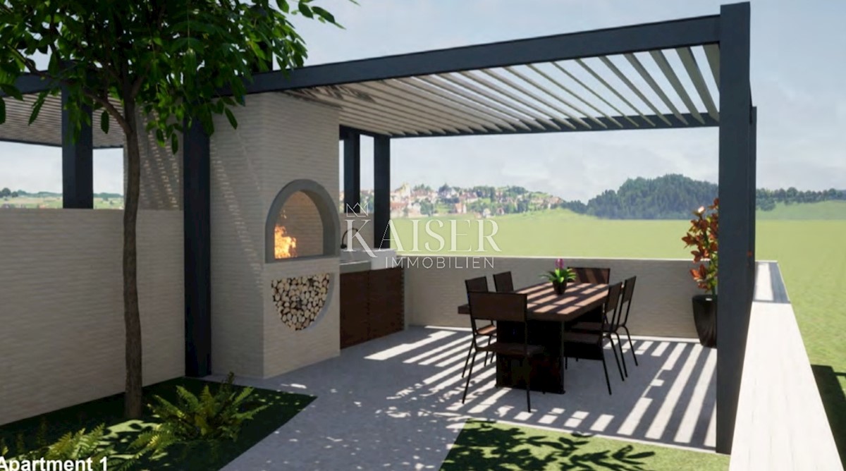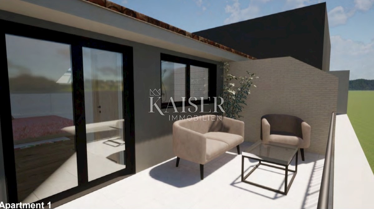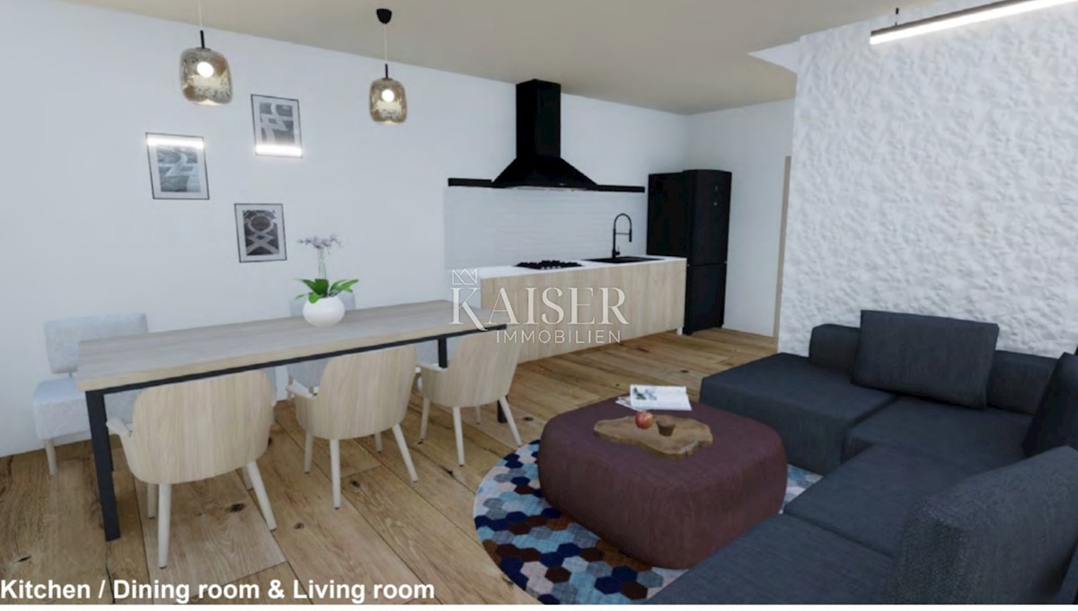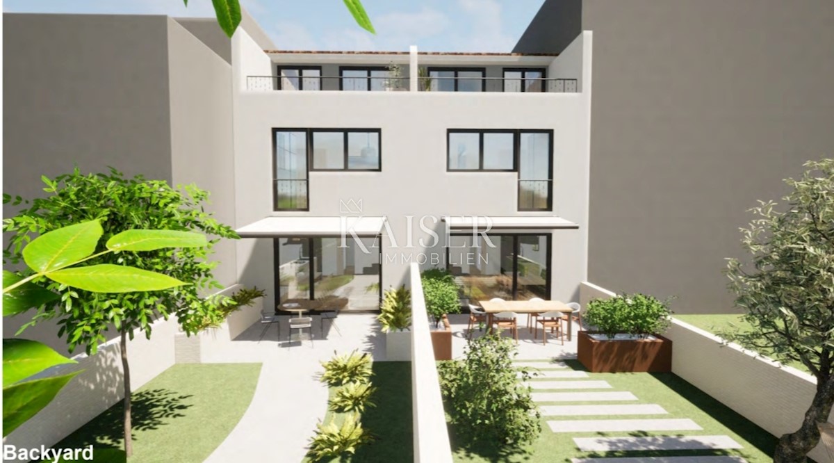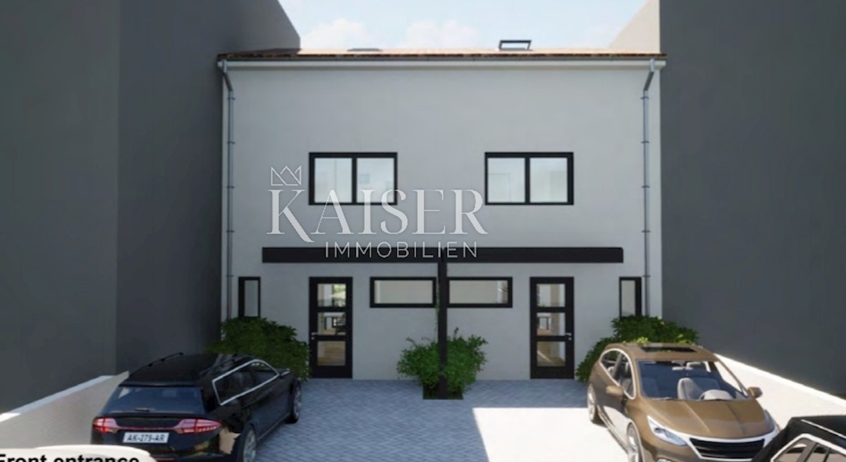 Kaiser Immobilien verkauft ein modernes Reihenhaus mit zwei Wohneinheiten. Jede Wohneinheit besteht aus einem Erdgeschoss, einem Obergeschoss und einem Dachgeschoss, insgesamt 126 m2. Im Erdgeschoss gibt es eine Eingangshalle, zwei Abstellräume, eine Küch