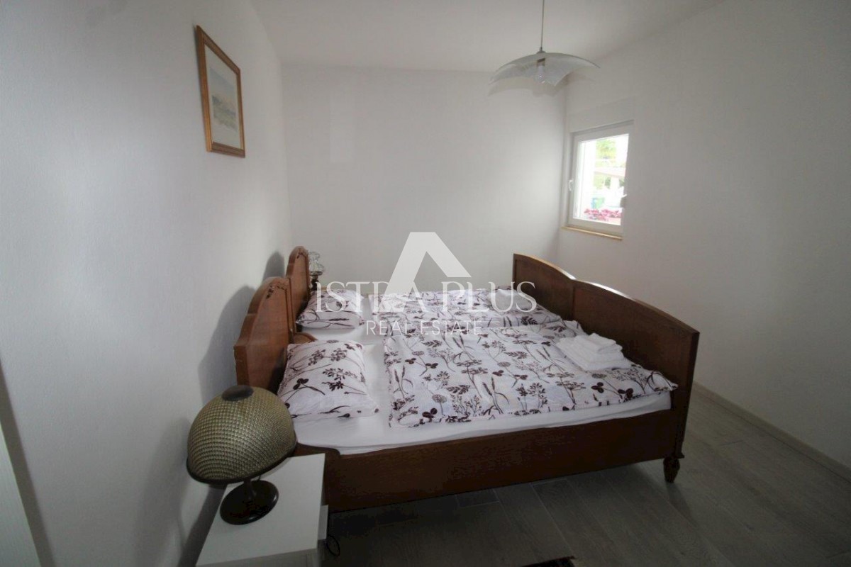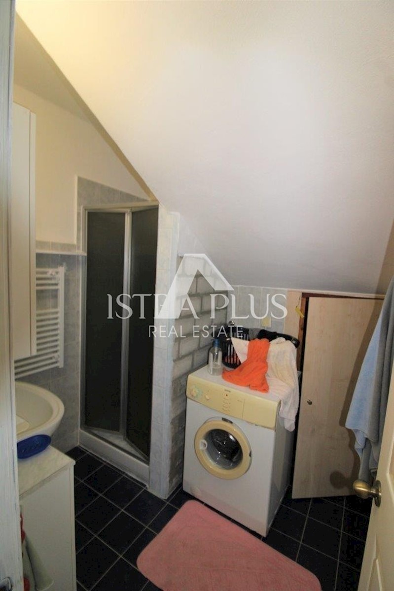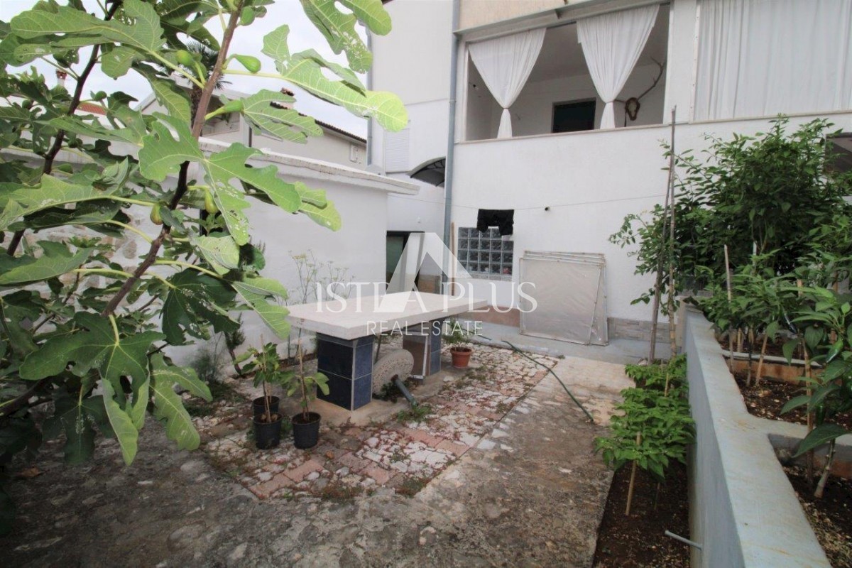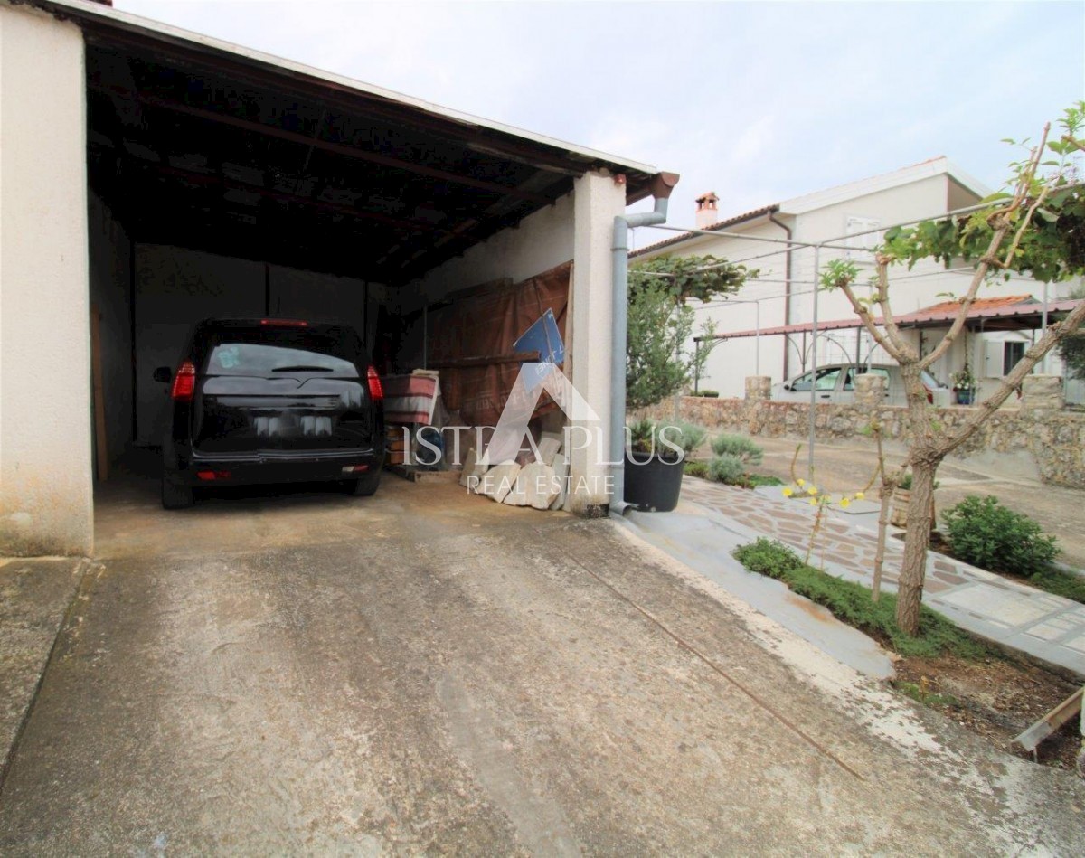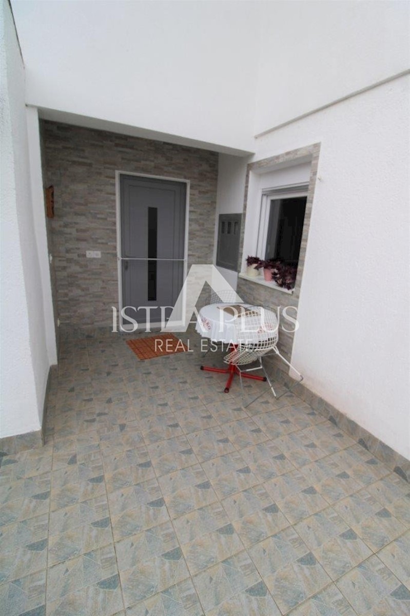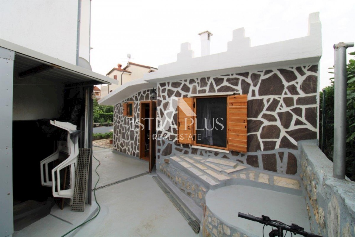 K101 Doppelhaushälfte in Poreč mit Garage und Abstellraum. Im Erdgeschoss des Hauses befinden sich 2 Wohnungen. Eine Wohnung besteht aus einer Eingangsterrasse, einer Küche, einer Toilette, einem Badezimmer mit kleinem Abstellraum, einem Wohnzimmer mit Kl