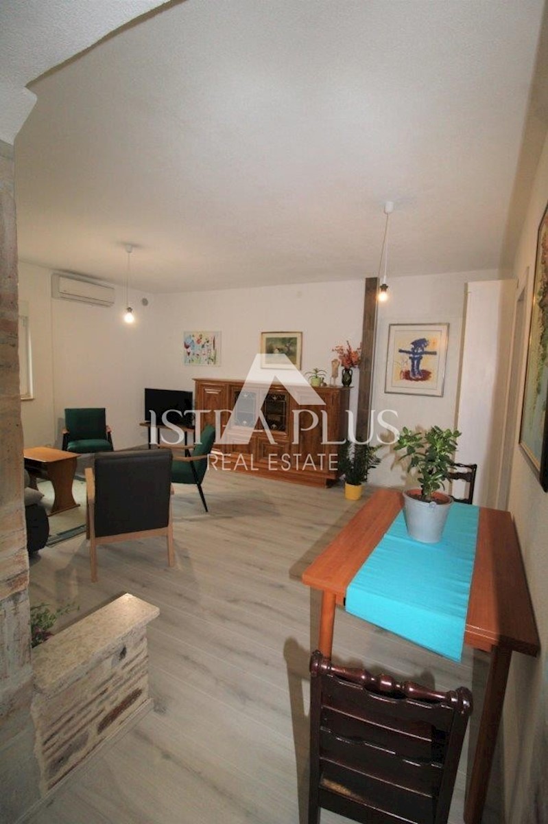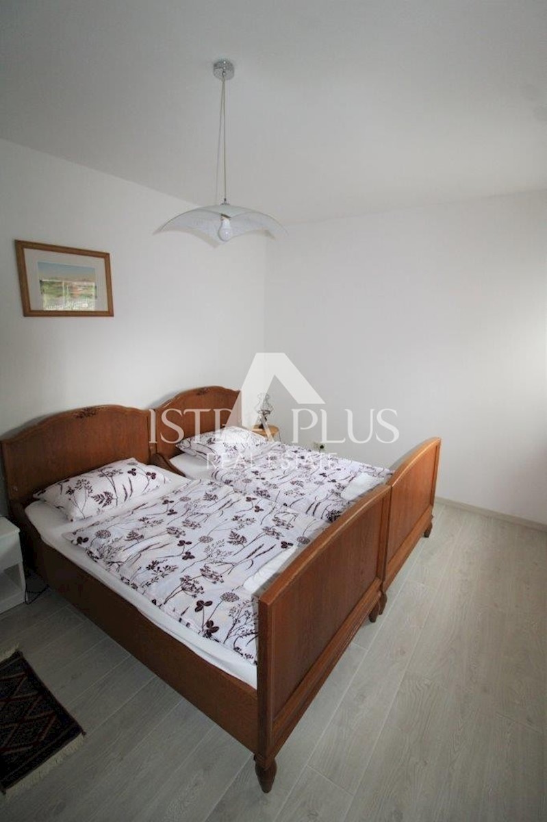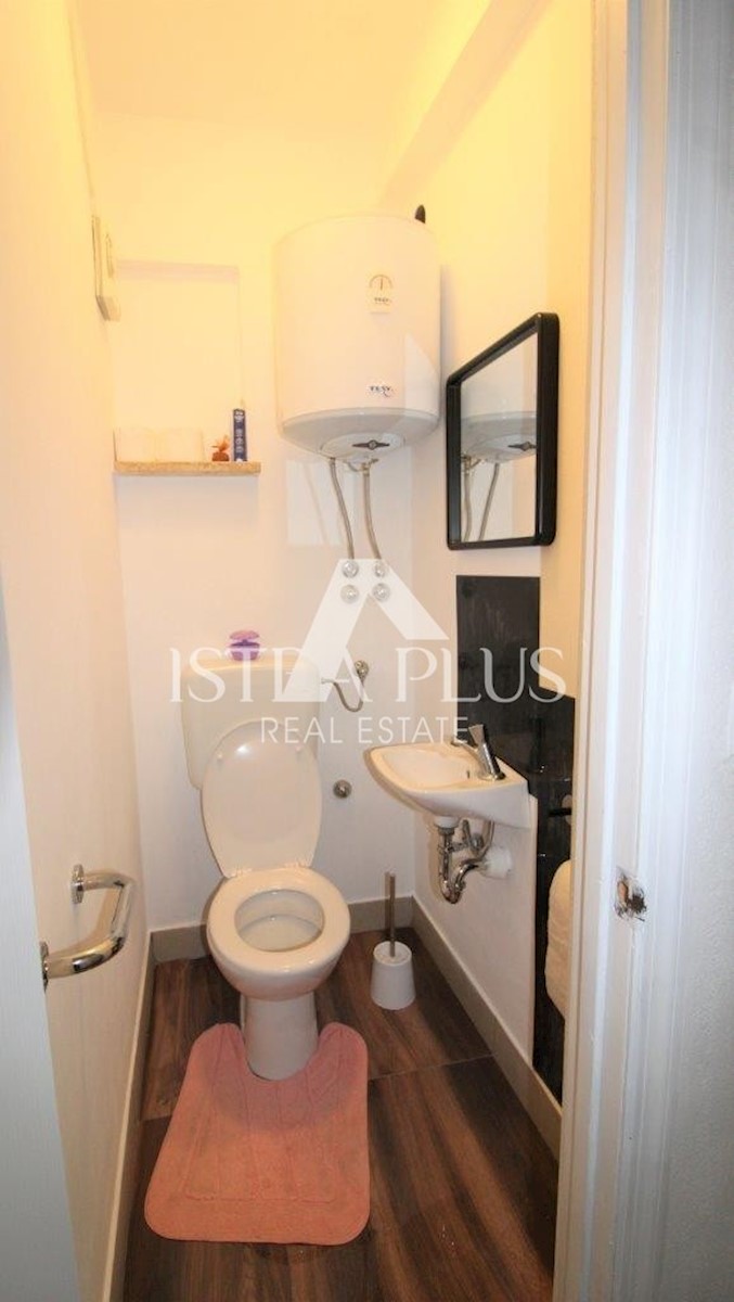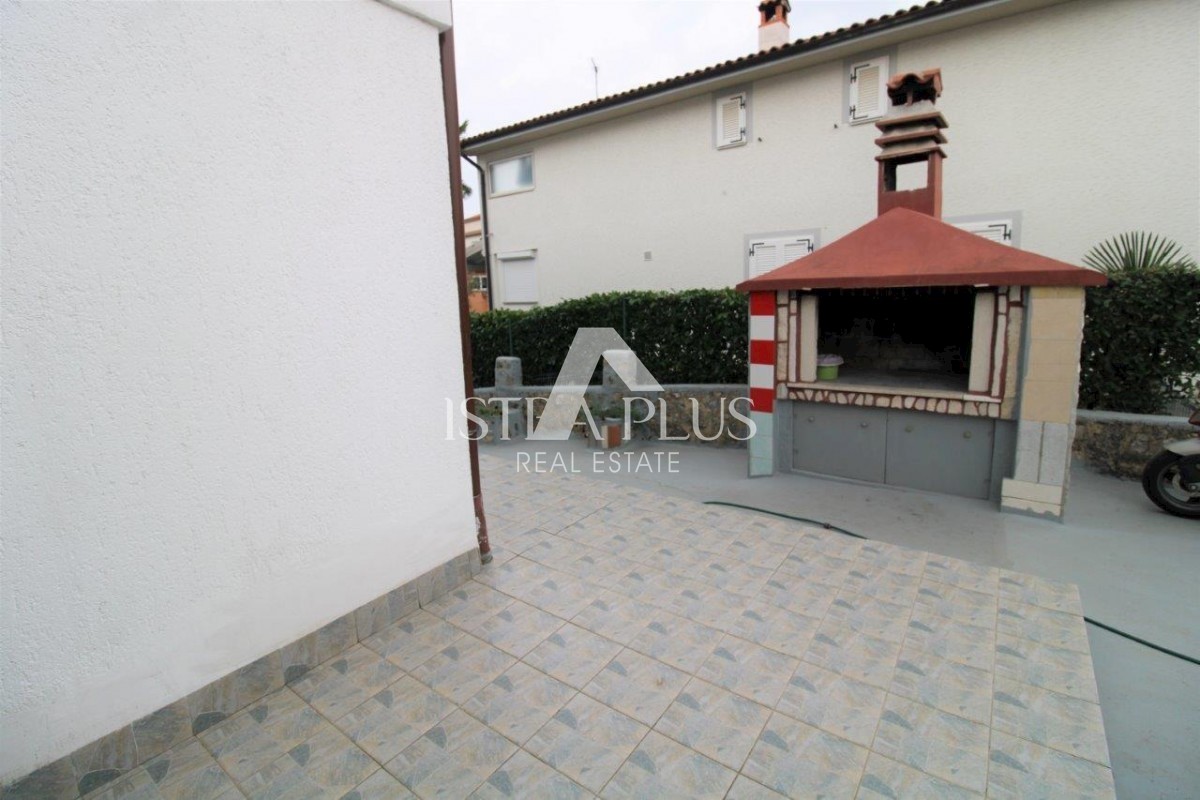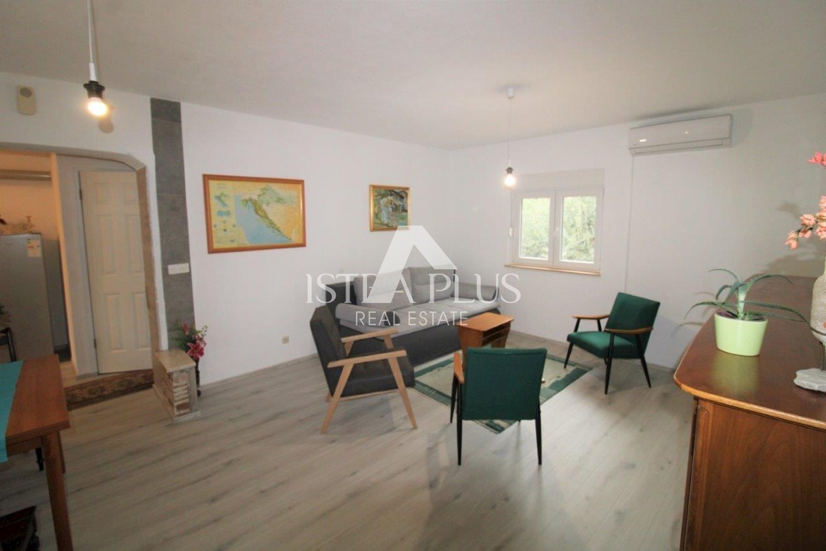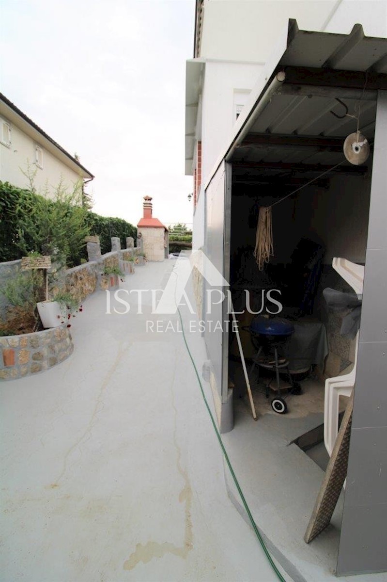 K101 Doppelhaushälfte in Poreč mit Garage und Abstellraum. Im Erdgeschoss des Hauses befinden sich 2 Wohnungen. Eine Wohnung besteht aus einer Eingangsterrasse, einer Küche, einer Toilette, einem Badezimmer mit kleinem Abstellraum, einem Wohnzimmer mit Kl