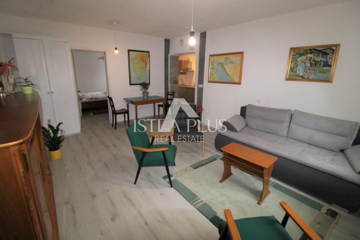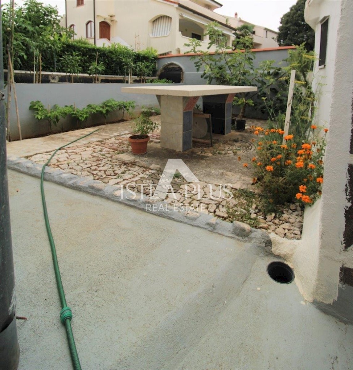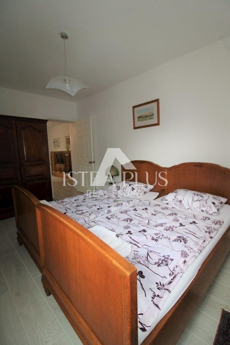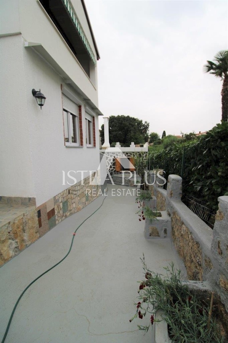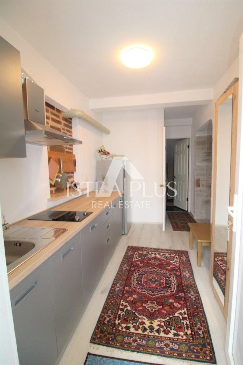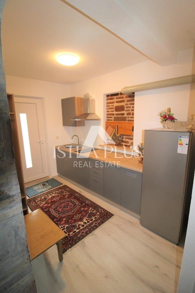 K101 Doppelhaushälfte in Poreč mit Garage und Abstellraum. Im Erdgeschoss des Hauses befinden sich 2 Wohnungen. Eine Wohnung besteht aus einer Eingangsterrasse, einer Küche, einer Toilette, einem Badezimmer mit kleinem Abstellraum, einem Wohnzimmer mit Kl