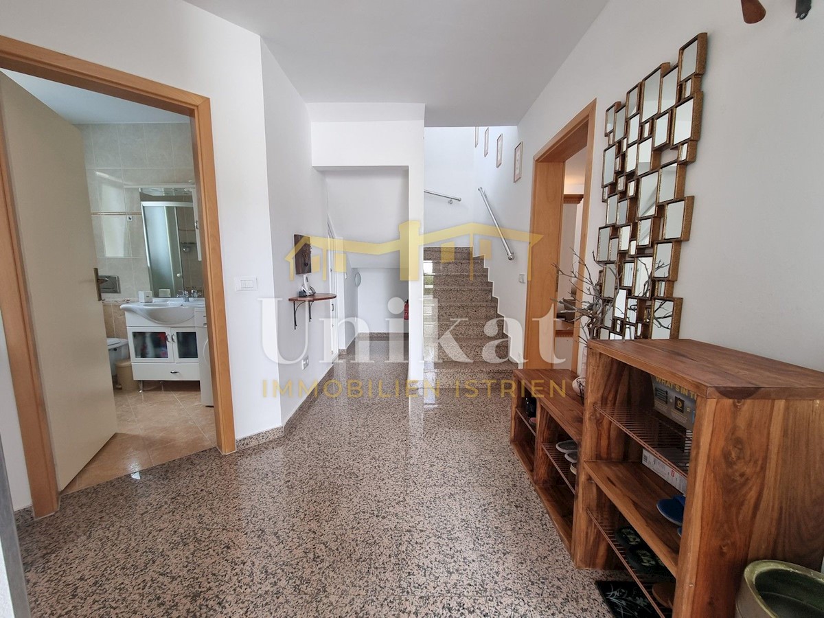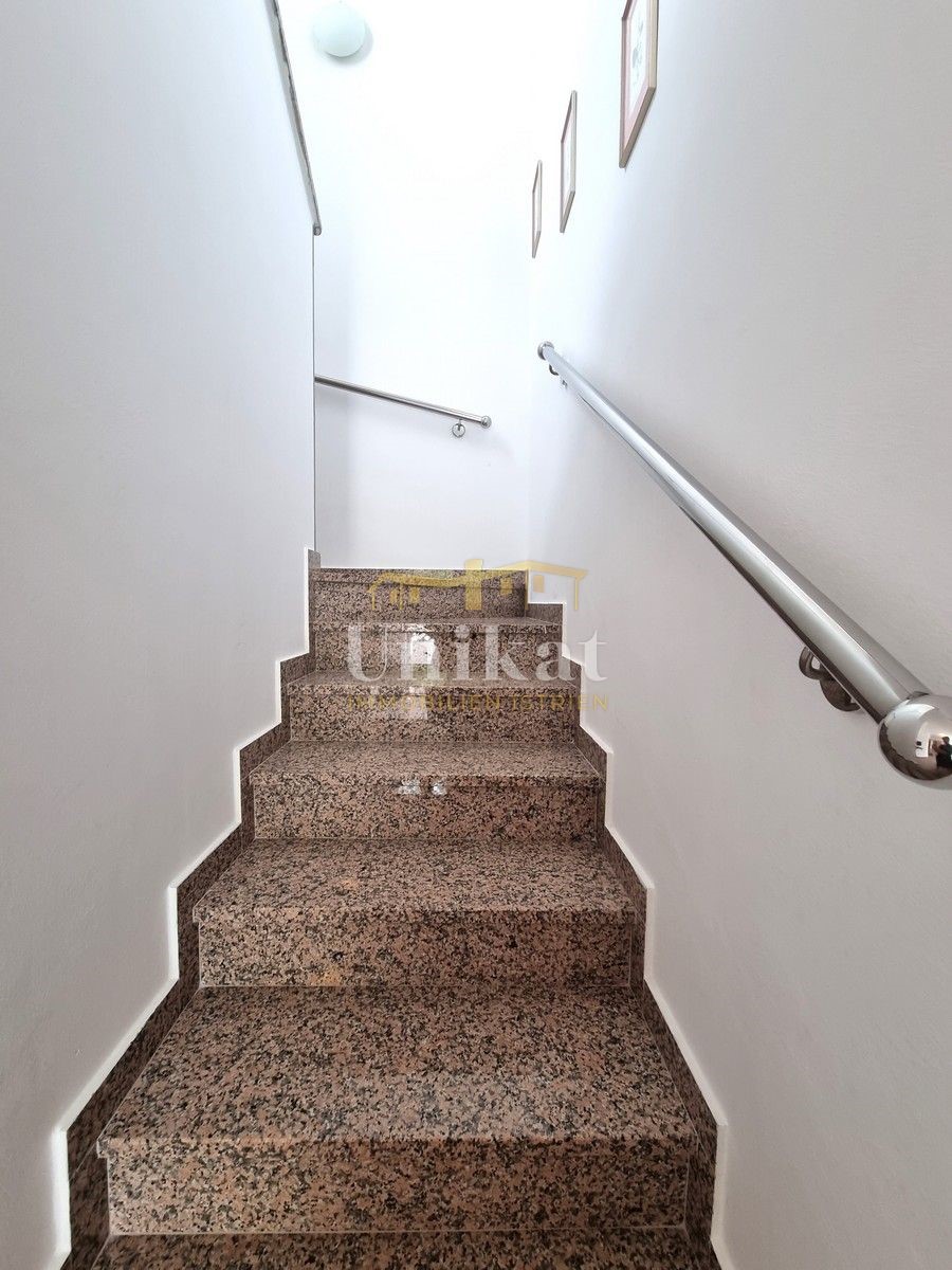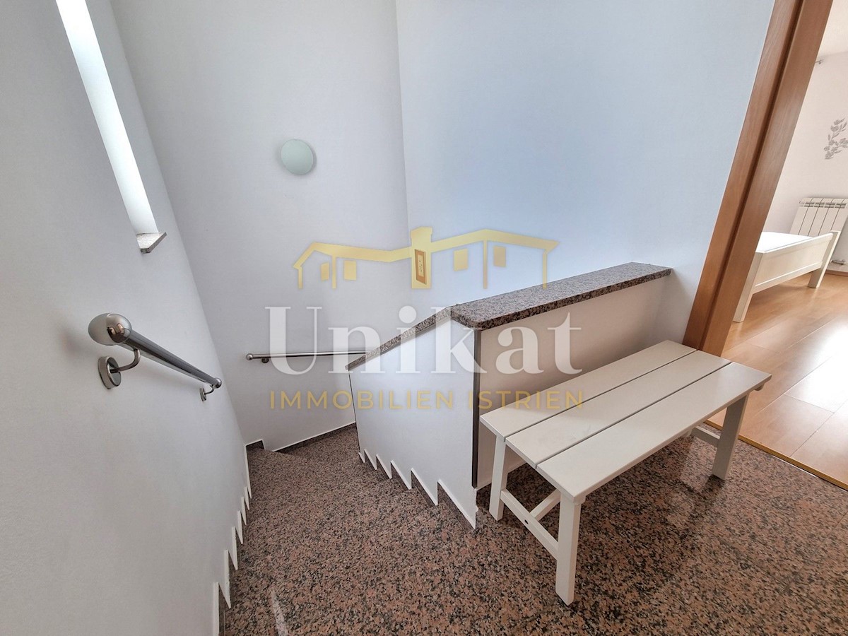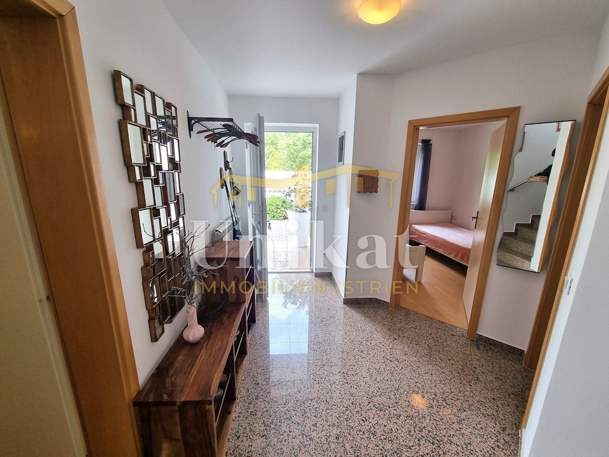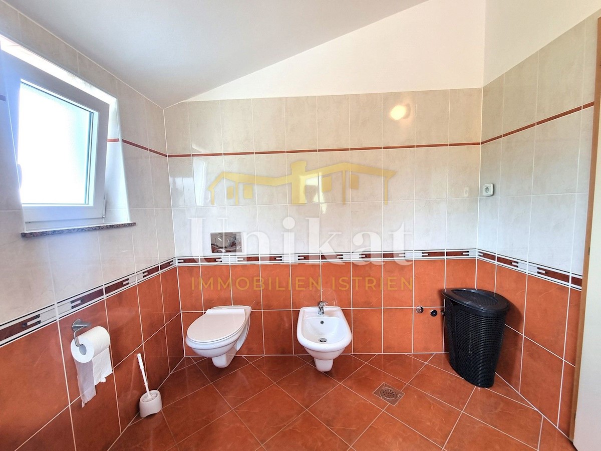 Schöne Doppelhaushälfte in ruhiger Lage, nur 6 km vom Meer und 5 km von der Stadt Poreč entfernt. Das Haus besteht aus Erdgeschoss und 1. Etage. Im Erdgeschoss befinden sich der Flur, ein Wohnbereich mit Küche und Essbereich, ein Schlafzimmer und ein Bade