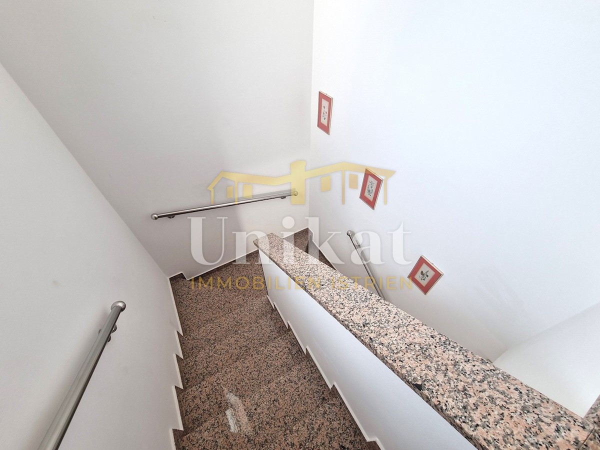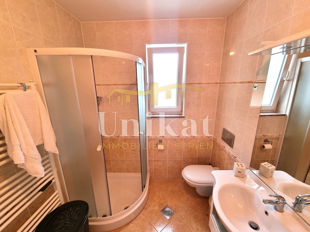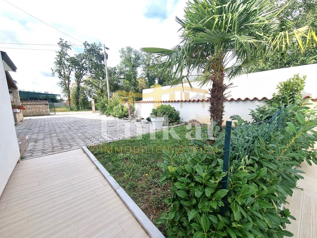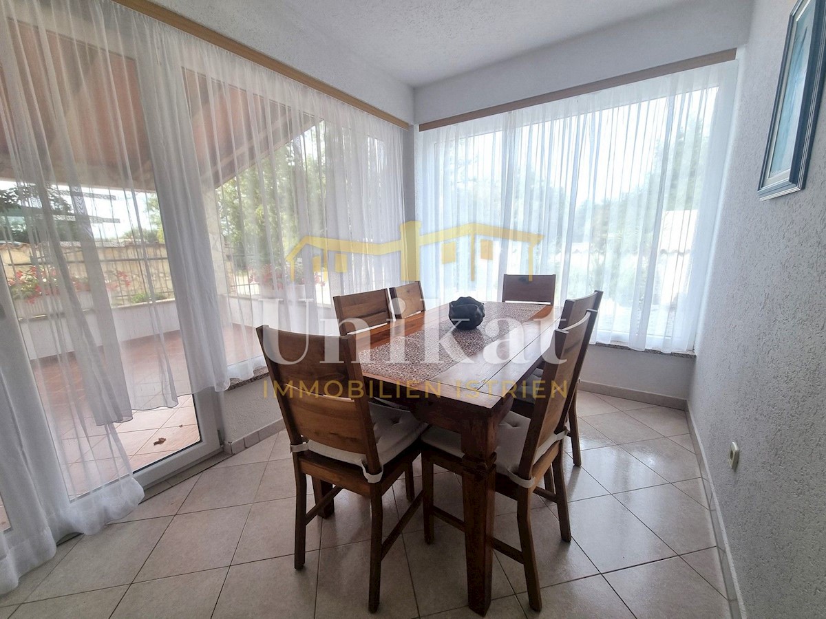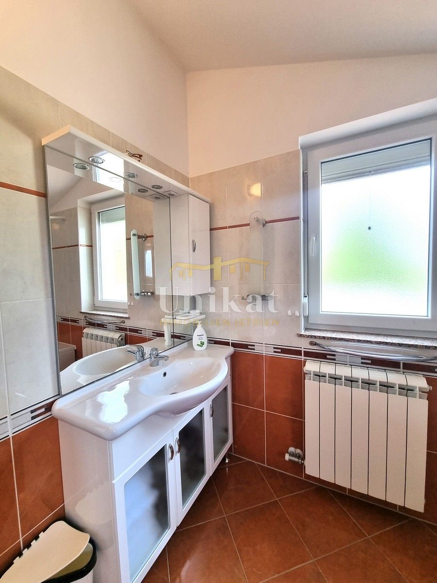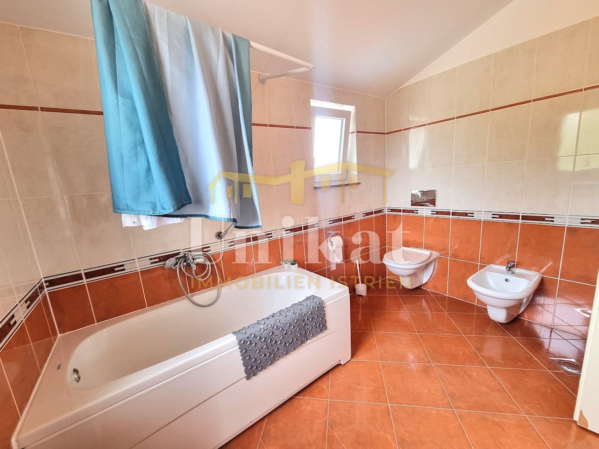 Schöne Doppelhaushälfte in ruhiger Lage, nur 6 km vom Meer und 5 km von der Stadt Poreč entfernt. Das Haus besteht aus Erdgeschoss und 1. Etage. Im Erdgeschoss befinden sich der Flur, ein Wohnbereich mit Küche und Essbereich, ein Schlafzimmer und ein Bade