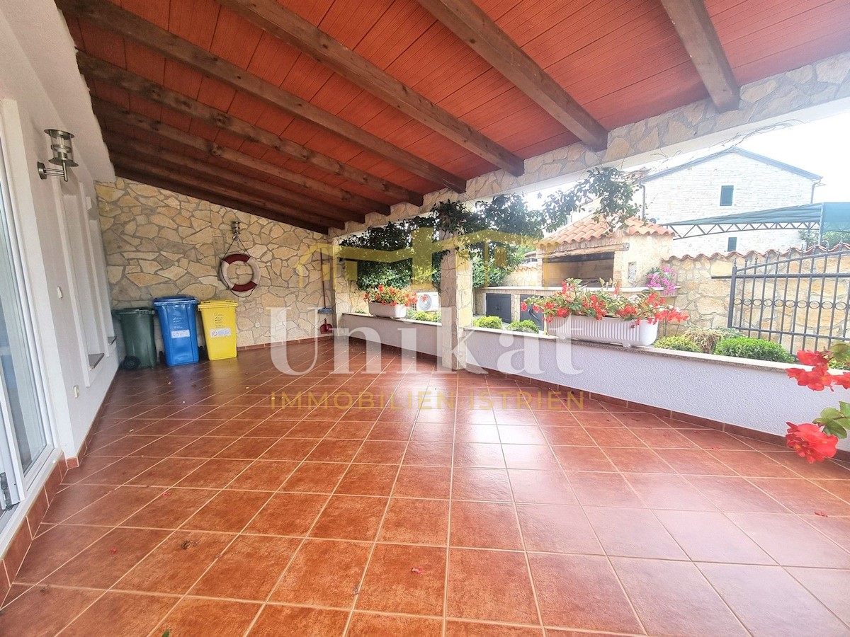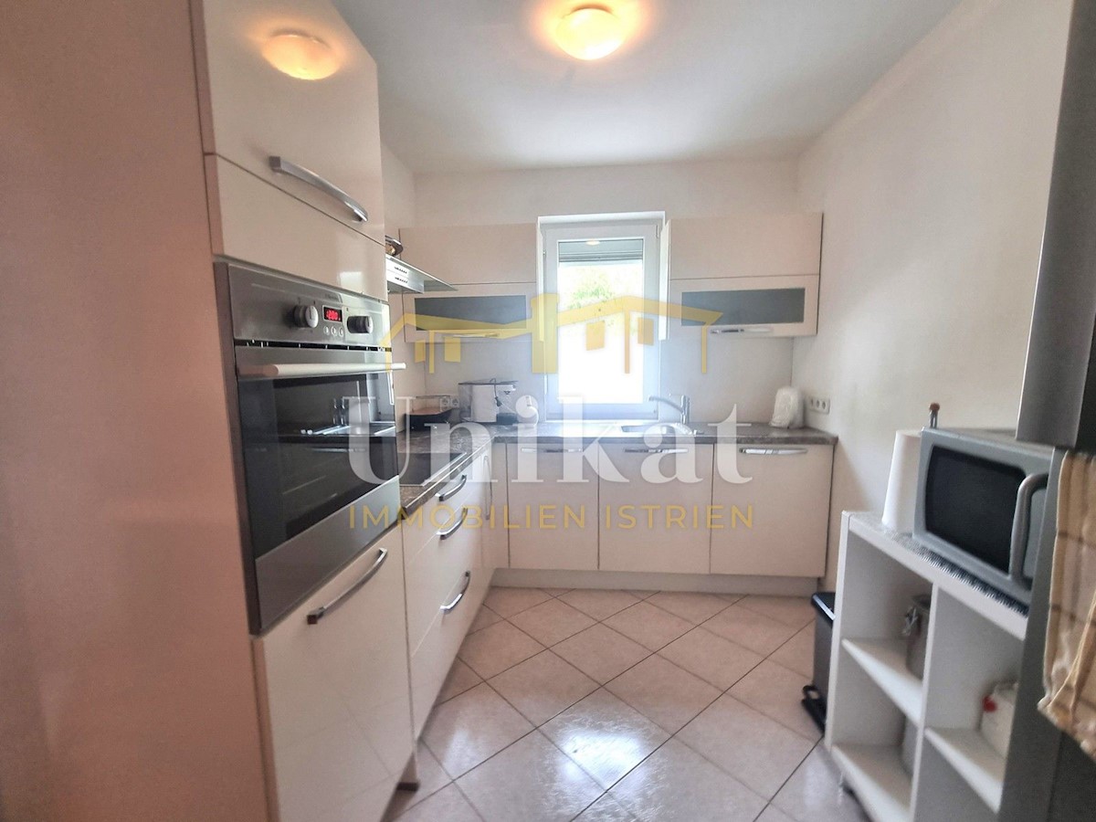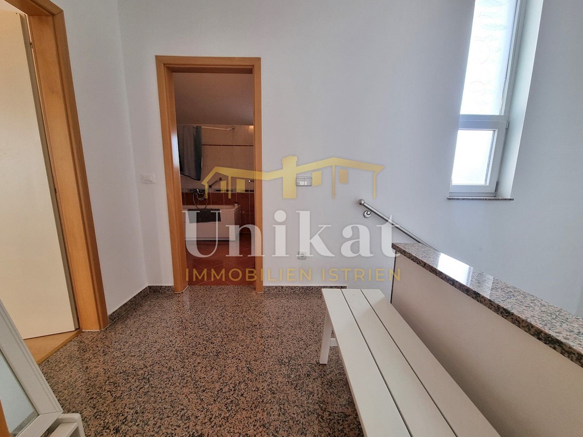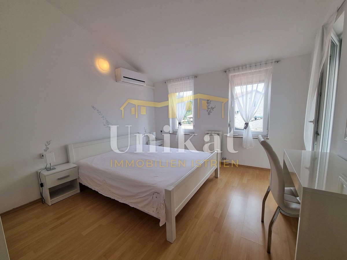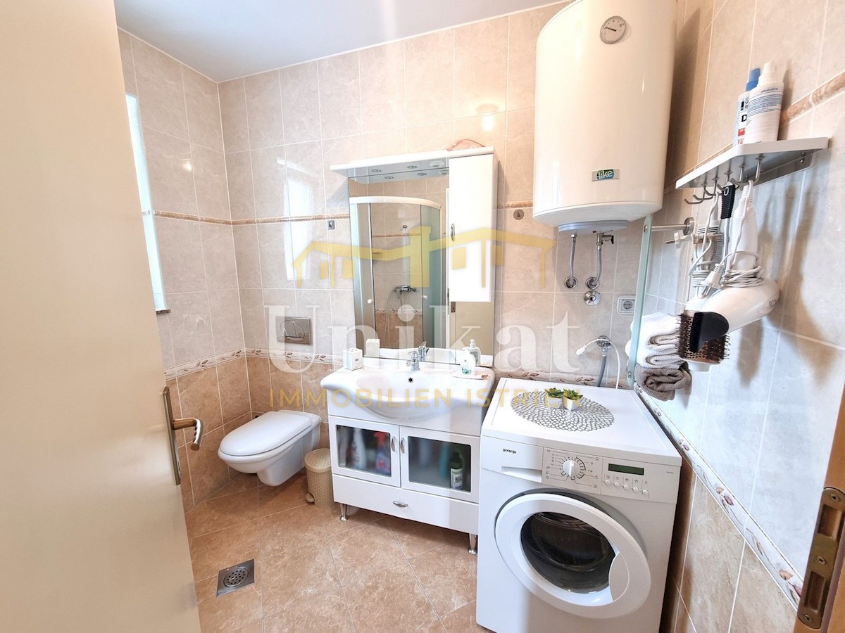 Schöne Doppelhaushälfte in ruhiger Lage, nur 6 km vom Meer und 5 km von der Stadt Poreč entfernt. Das Haus besteht aus Erdgeschoss und 1. Etage. Im Erdgeschoss befinden sich der Flur, ein Wohnbereich mit Küche und Essbereich, ein Schlafzimmer und ein Bade