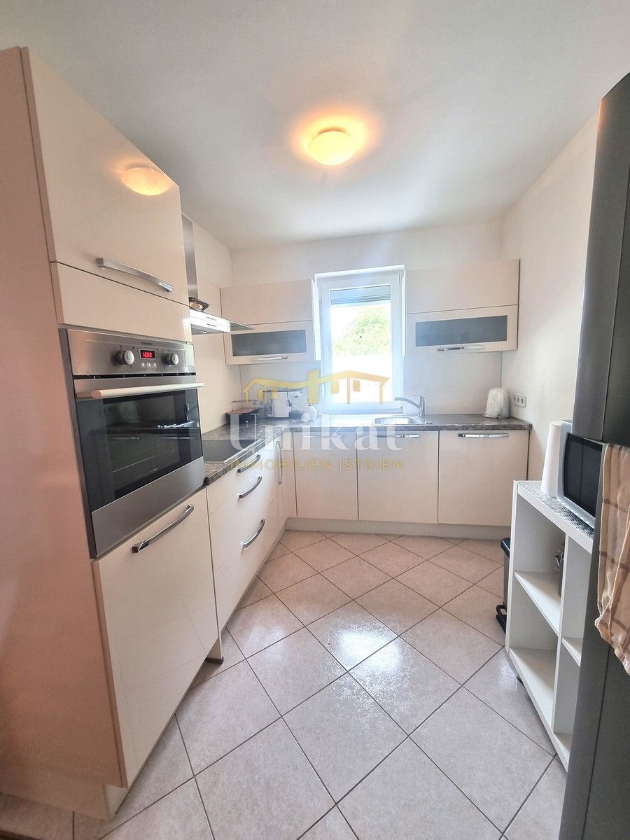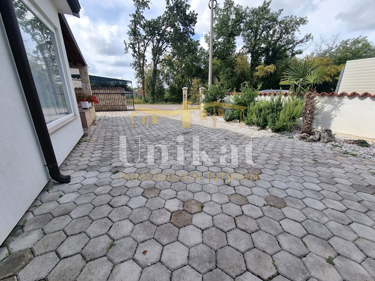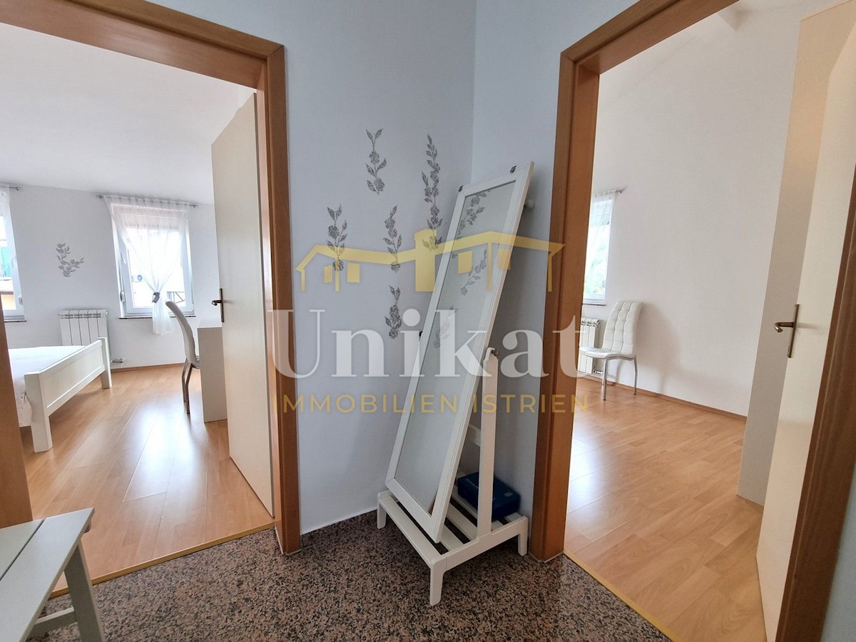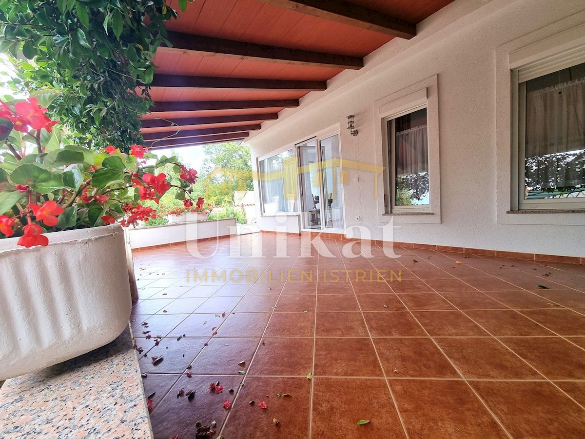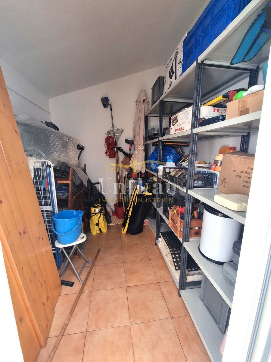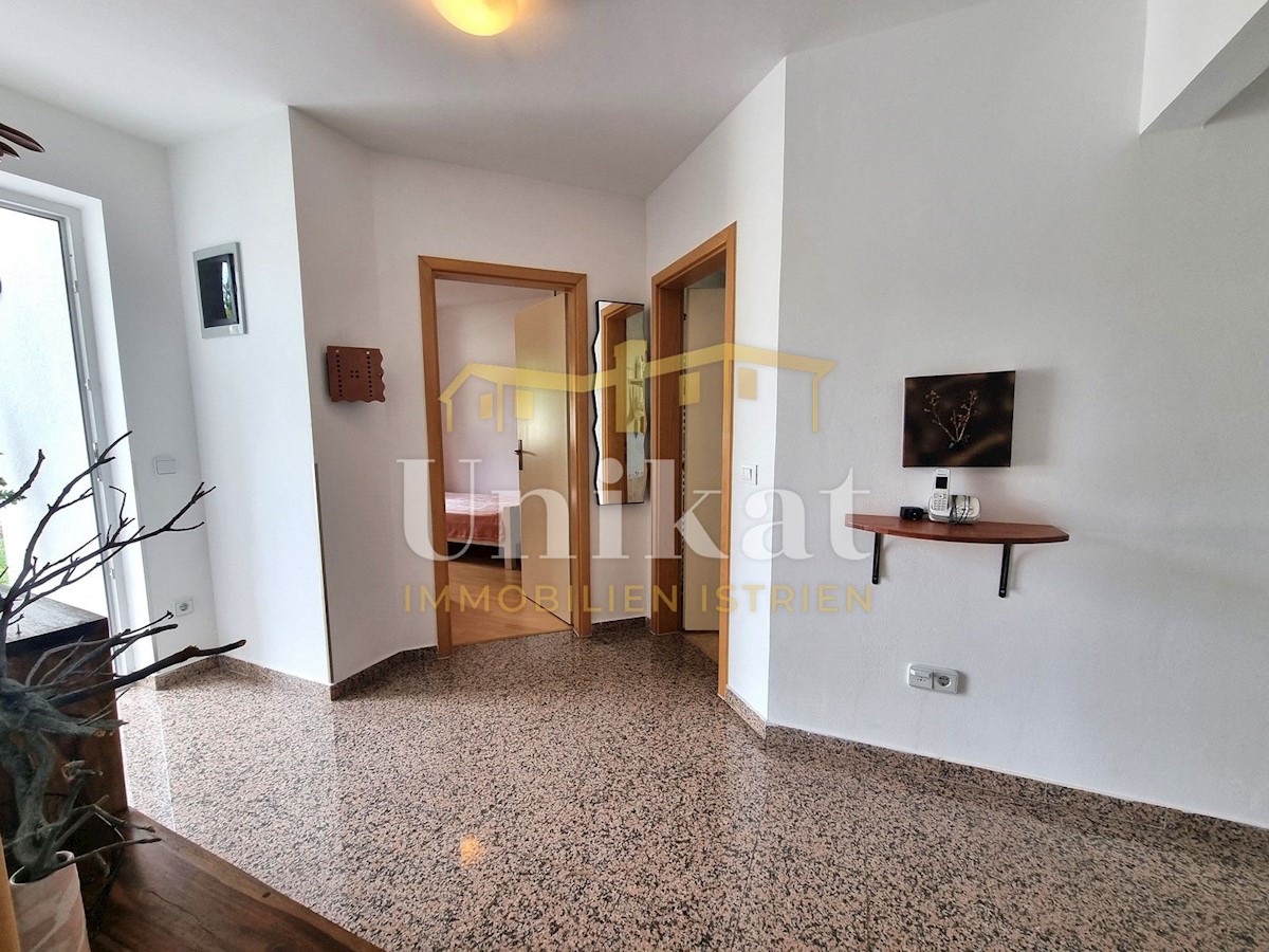 Schöne Doppelhaushälfte in ruhiger Lage, nur 6 km vom Meer und 5 km von der Stadt Poreč entfernt. Das Haus besteht aus Erdgeschoss und 1. Etage. Im Erdgeschoss befinden sich der Flur, ein Wohnbereich mit Küche und Essbereich, ein Schlafzimmer und ein Bade