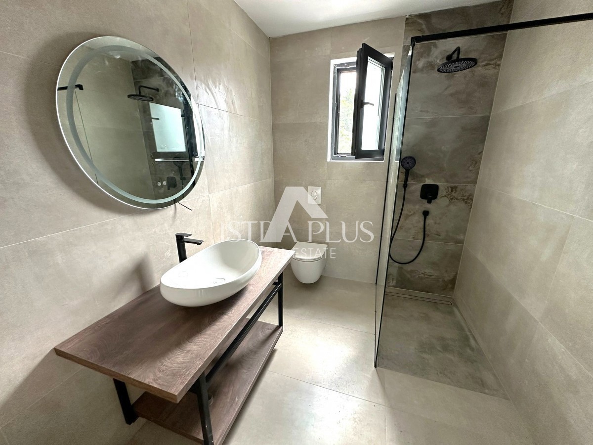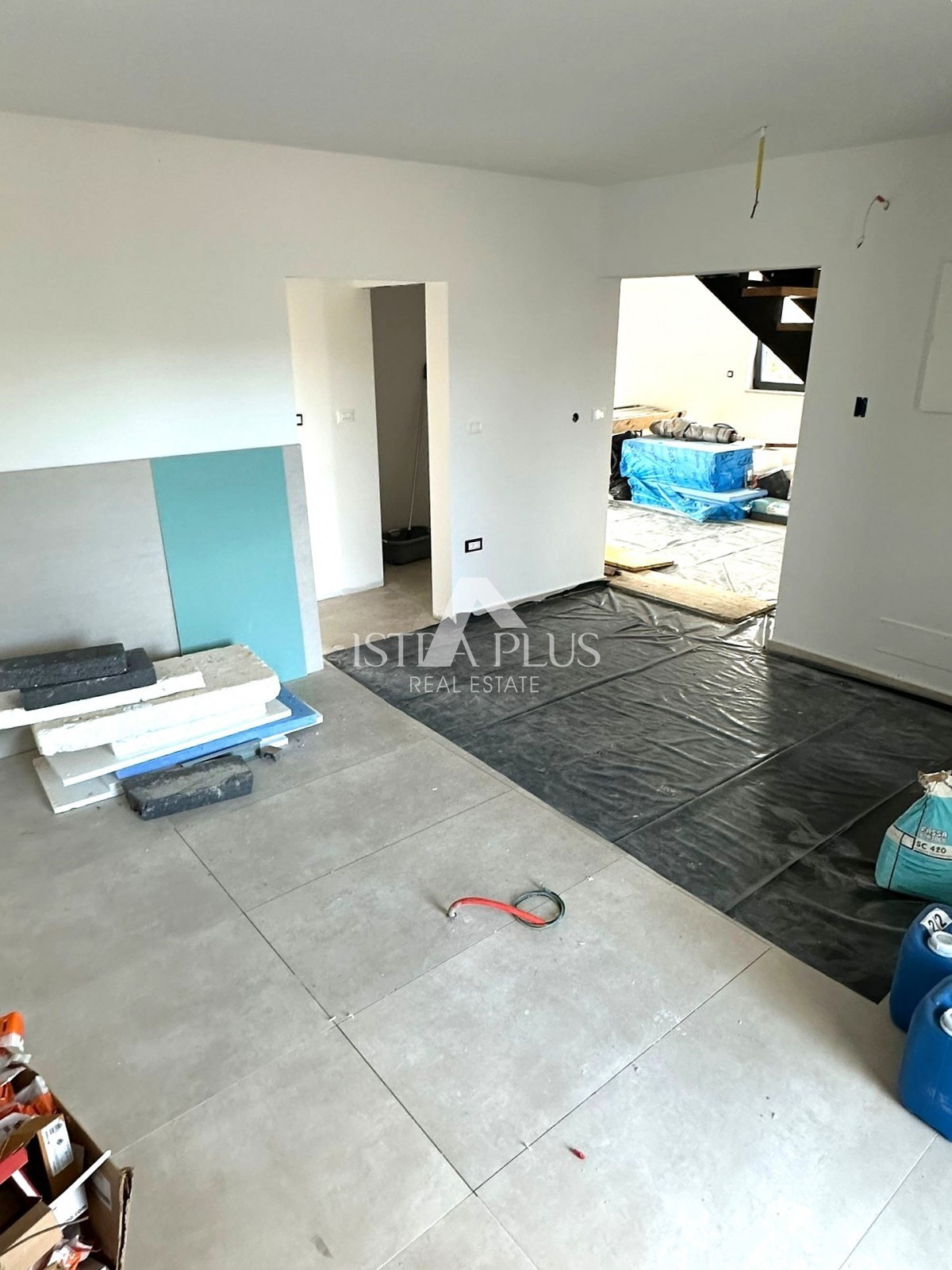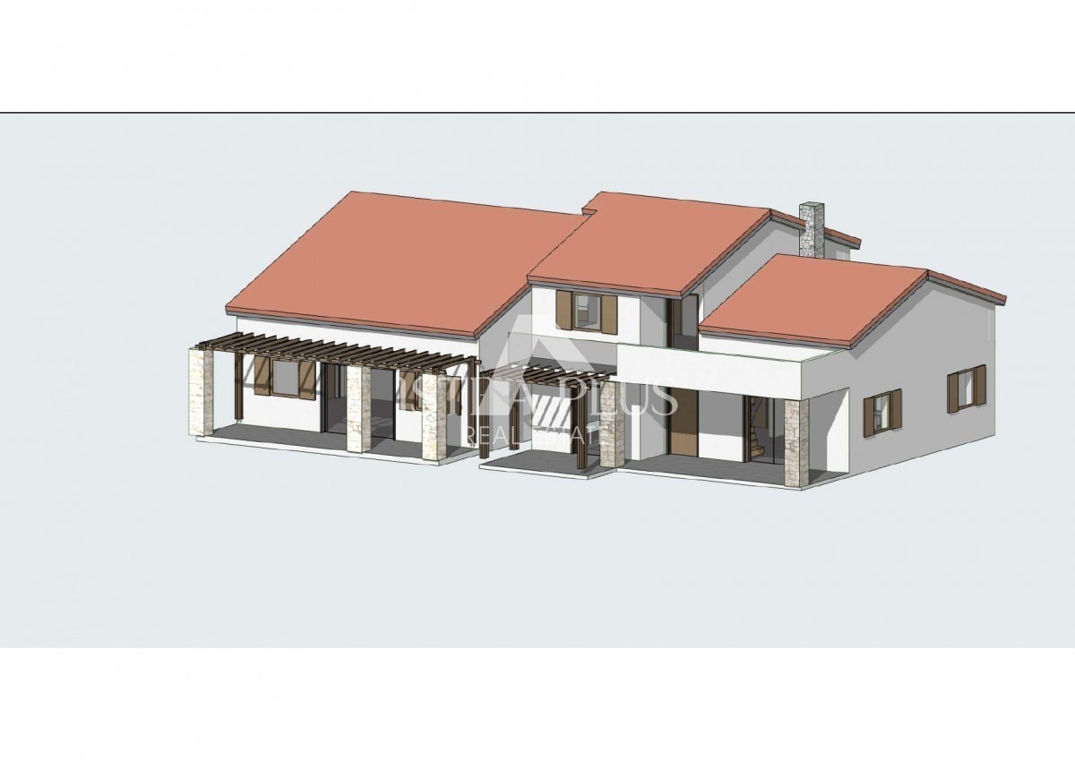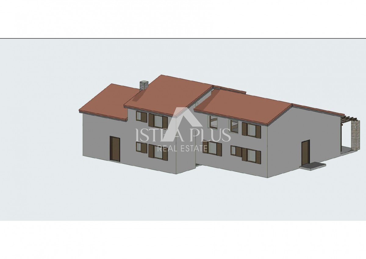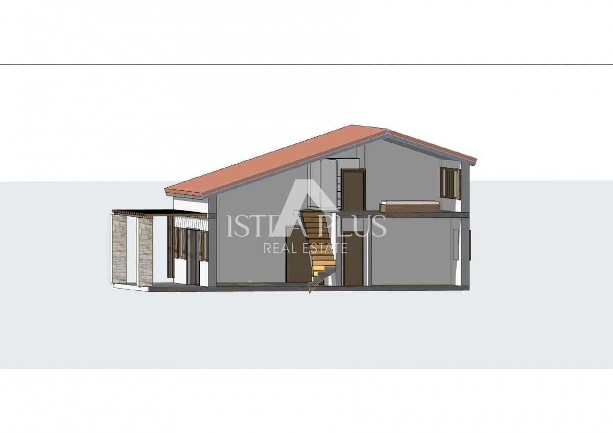 K106 In der Nähe von Poreč, in schöner und ruhiger Lage mit Blick auf das Meer, gibt es ein Geschäft, ein Postamt, Cafés und Restaurants in 600 m Entfernung und 12 km vom Meer entfernt. Haus A hat eine Fläche von 116,5 m2 und besteht aus zwei Etagen. Gru