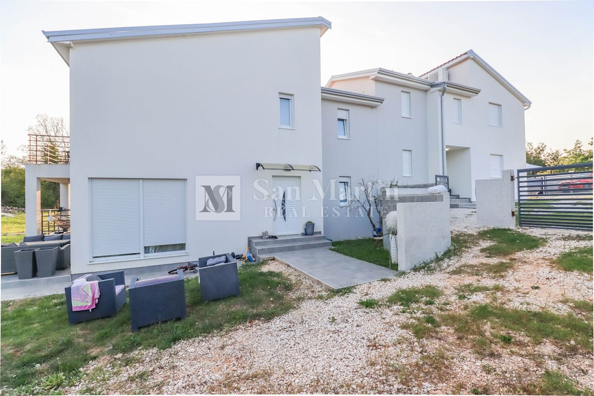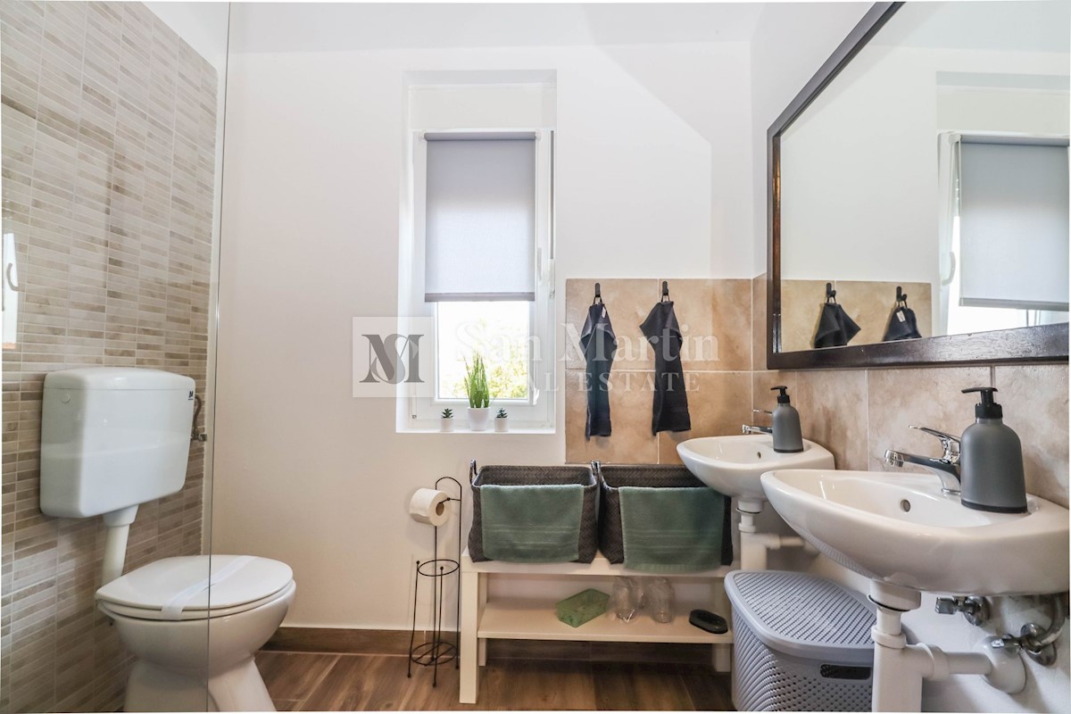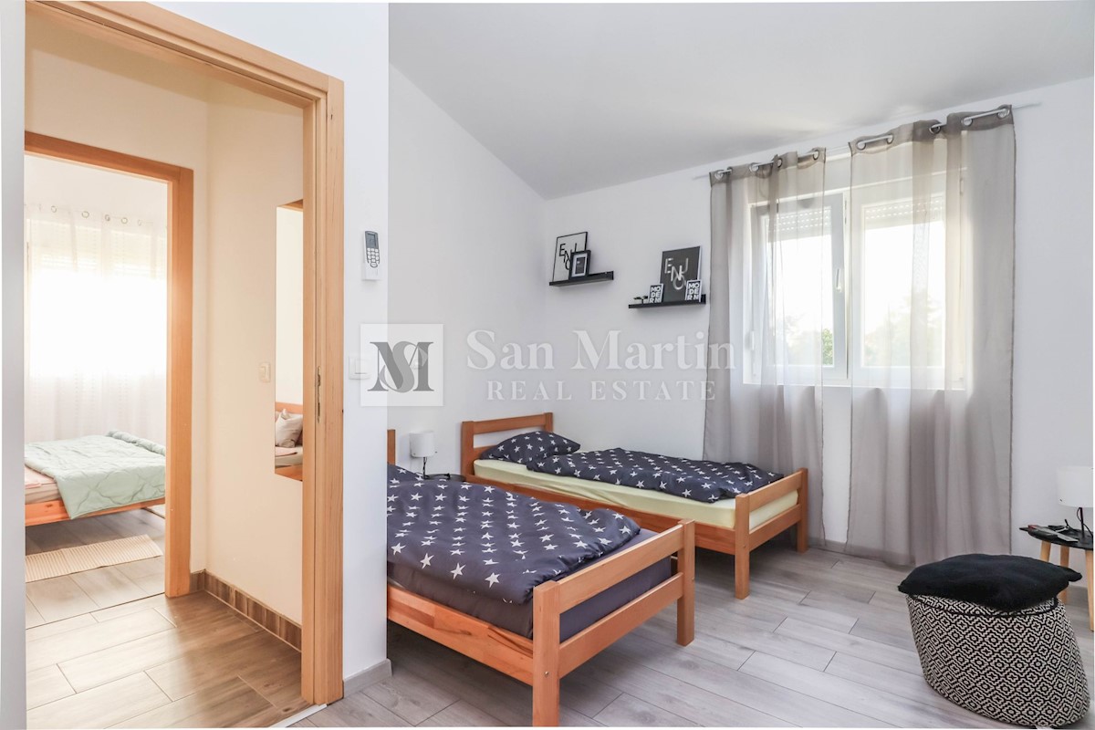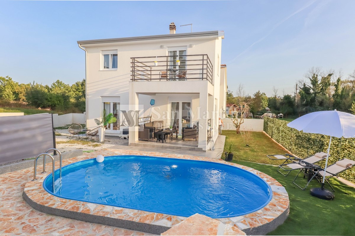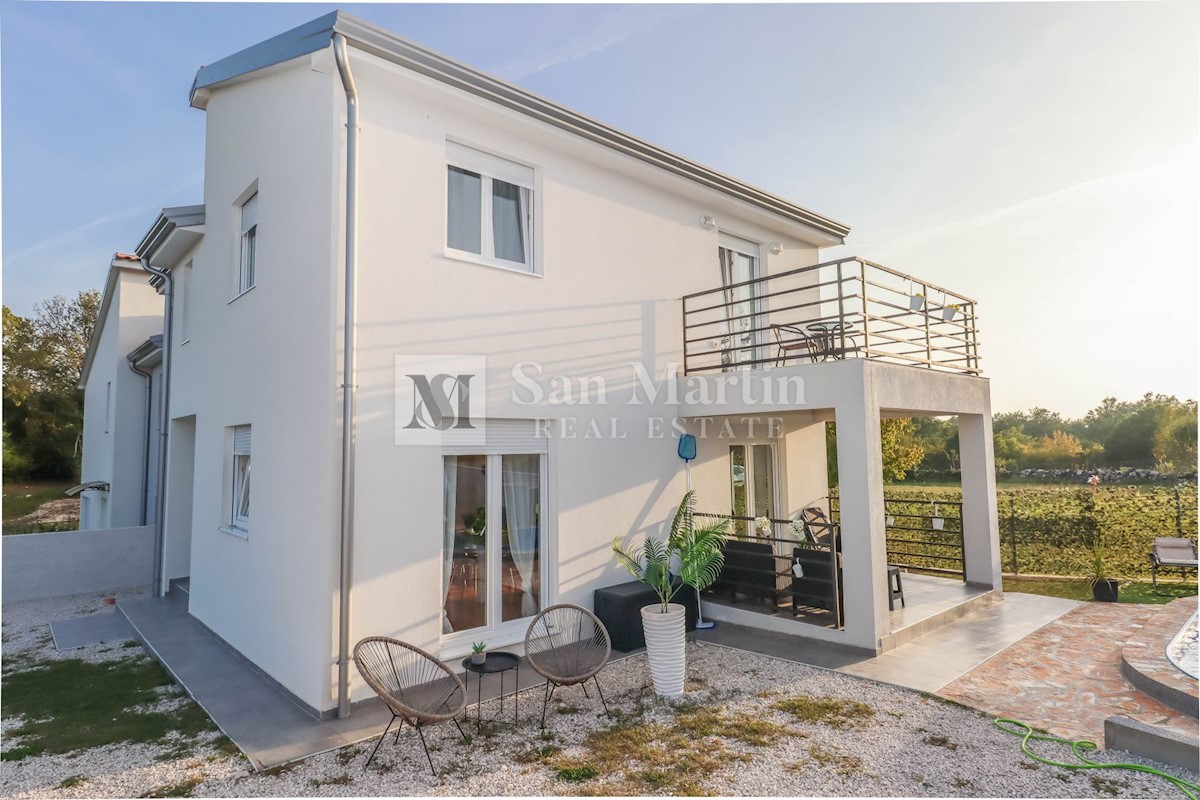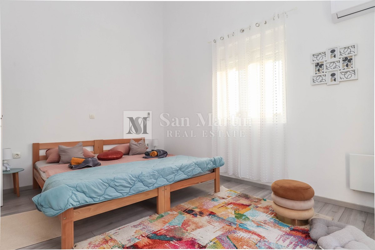 Poreč, okolica, Hiša z dvema stanovanjskima enotama, vsaka s štirimi spalnicami, ki se nahaja nedaleč od mesta Prva hiša ima v pritličju dnevno sobo, kuhinjo in jedilnico, ki sta odlično povezani z zunanjostjo, ter bazenom ter eno spalnico in kopalnico.