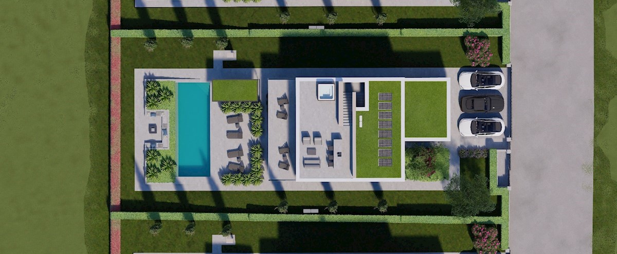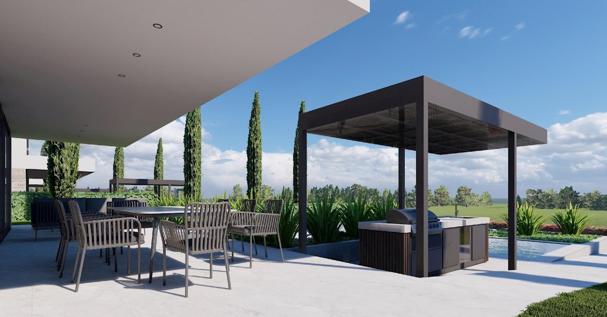 Kompleks vil se nahaja na površini 3730 m2. Sestavljen je iz 4 samostojnih, popolnoma opremljenih in opremljenih objektov s pogledom na odprto morje. Bruto kvadratura posamezne hiše: 270 m2 (štejejo samo zaprte površine) Neto notranja stanovanjska povr