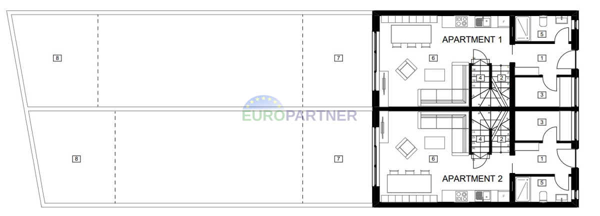 Nedaleč od Poreča in morja, na zelo atraktivni lokaciji, se je začela gradnja tega čudovitega dvojnega objekta. Hiša je zasnovana kot dvojni objekt, apartma 1 in apartma 2. Stanovanje 1 ima skupno 126,40 m2 in obsega pritličje, nadstropje in mansardo. Pre