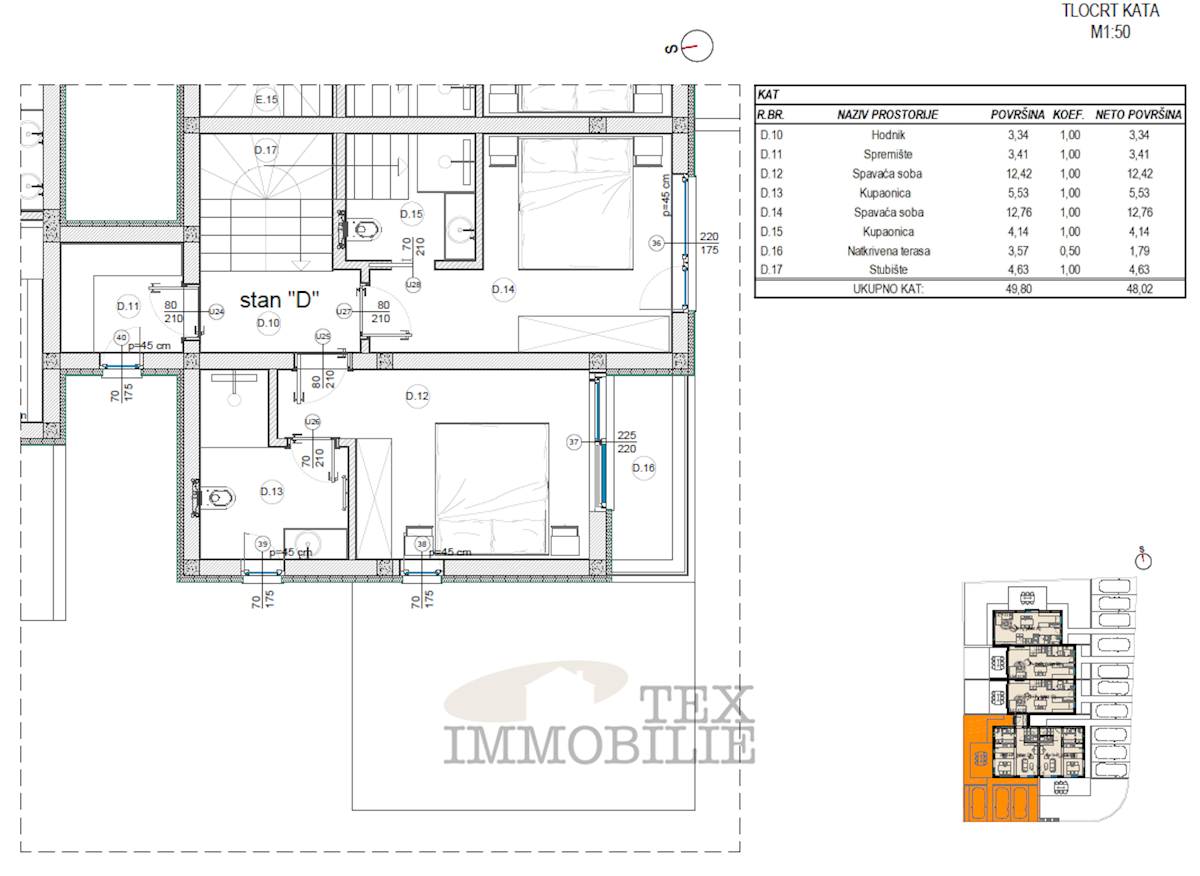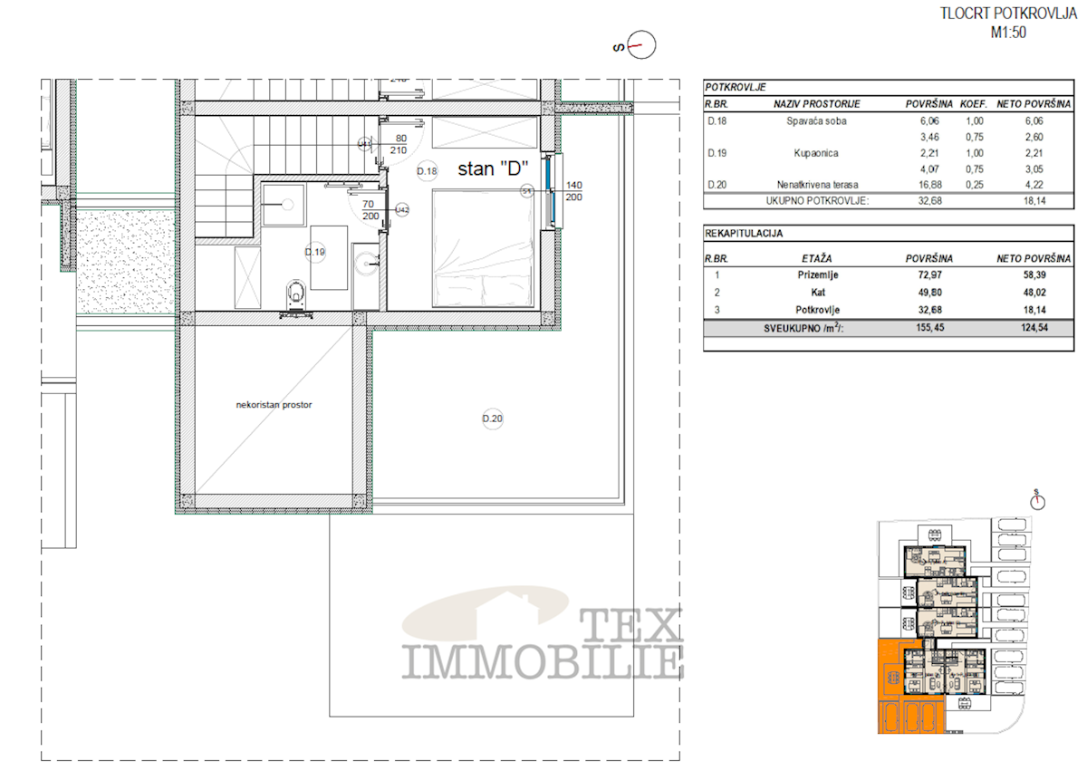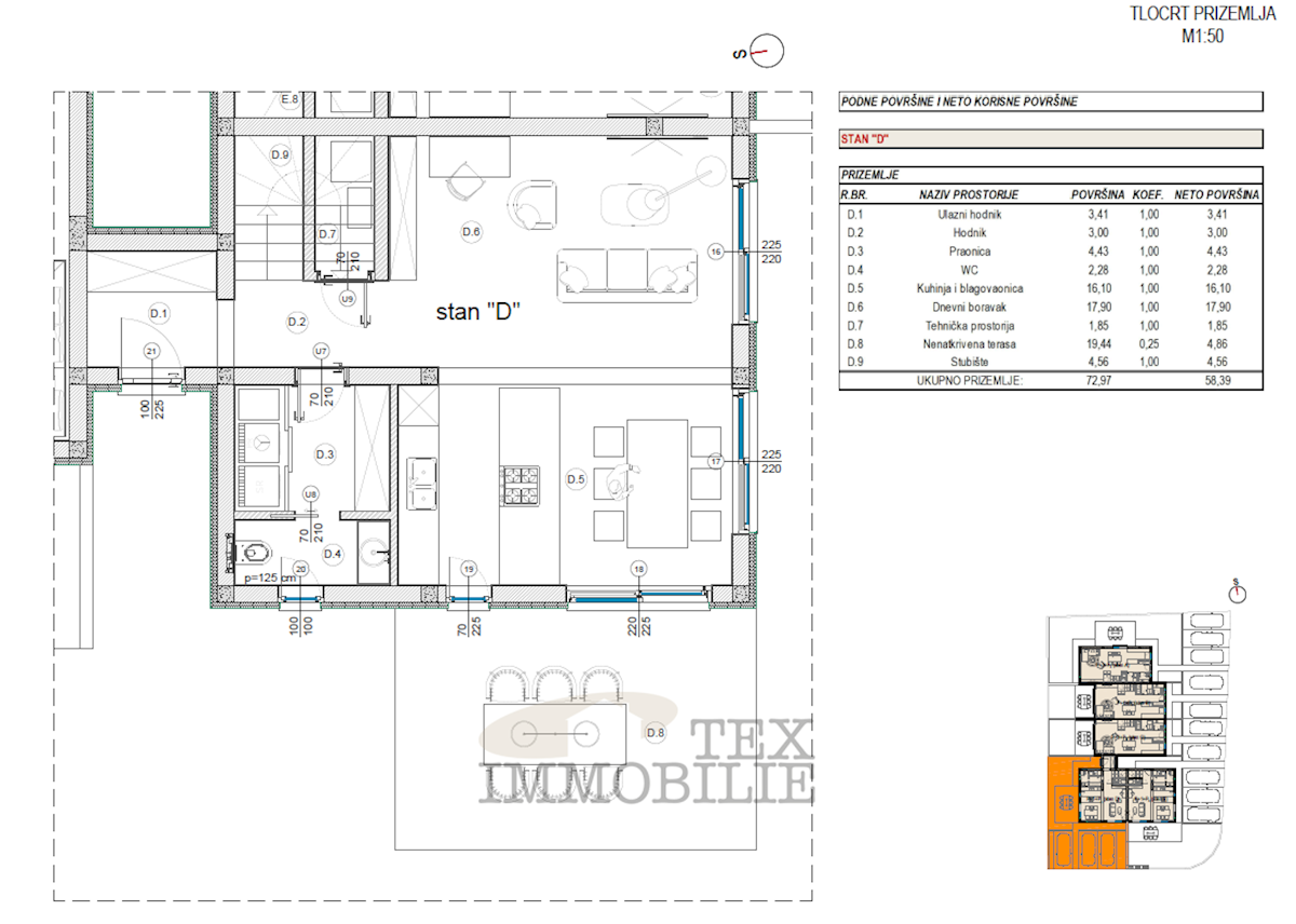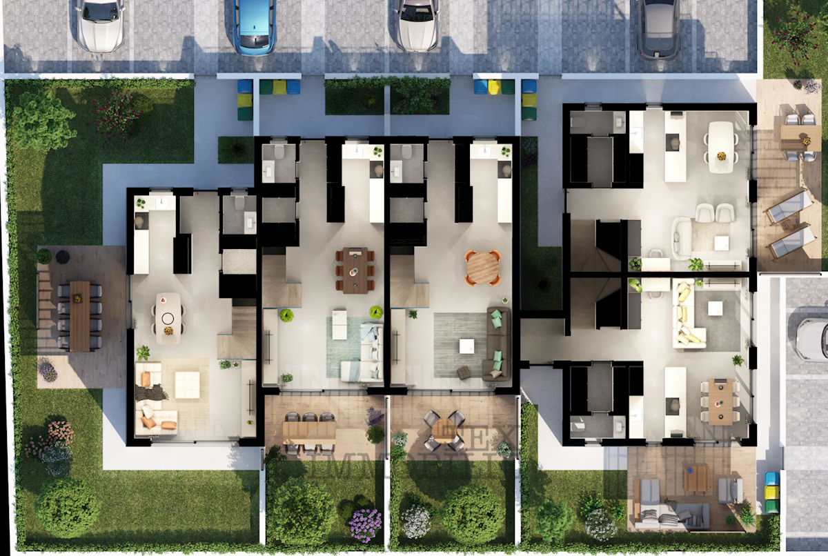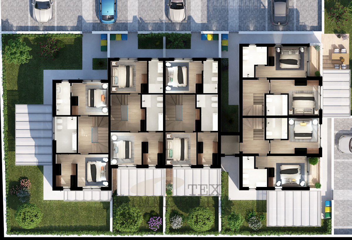 V mirnem okolju, le 2 km stran od centra Poreča in ob obali, se nahaja sodobna vrstna hiša s dvoriščem. Prva hiša v vrsti zavzema parcelo velikosti 134 m2, sama hiša pa se razprostira na 125 m2, razporejenih na tri ravni. Pritličje hiše sestoji iz predso