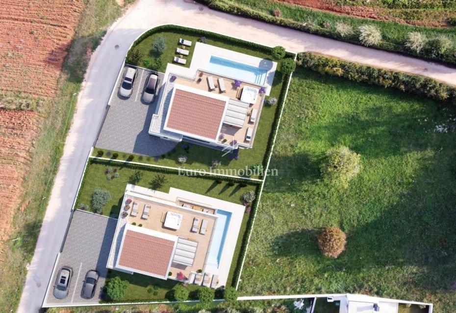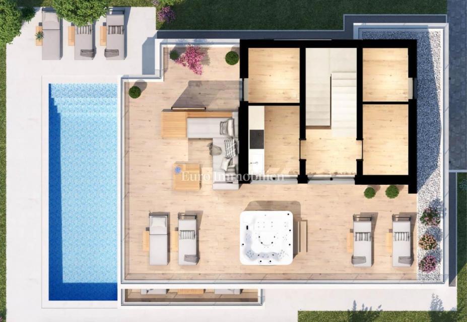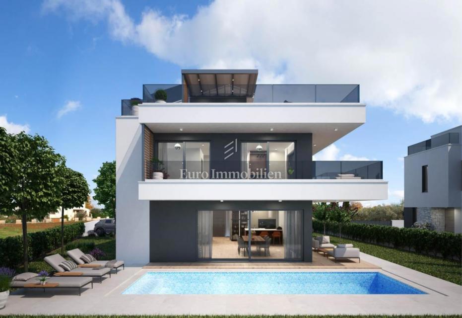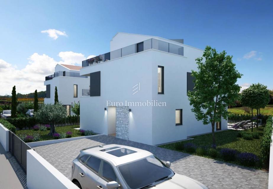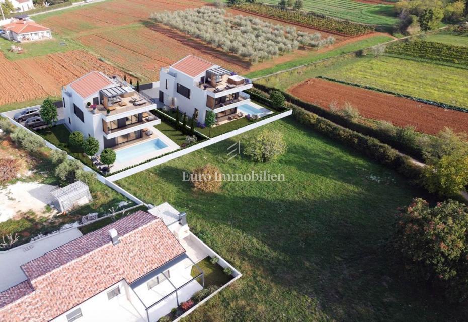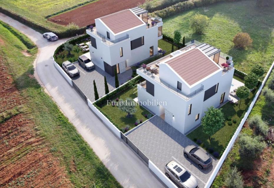Nova hiša atraktivnega in modernega dizajna se nahaja v bližini Poreča, le 4 km od centra mesta in deset minut vožnje od plaž. Gradi se na parceli velikosti 570m2. Hiša je sestavljena iz pritličja, nadstropja in mansarde. Skozi glavni vhod v hišo se vsto