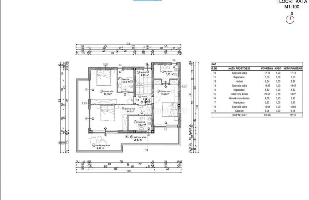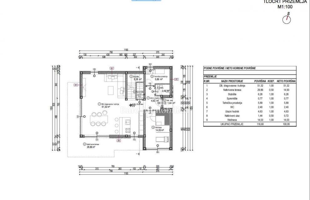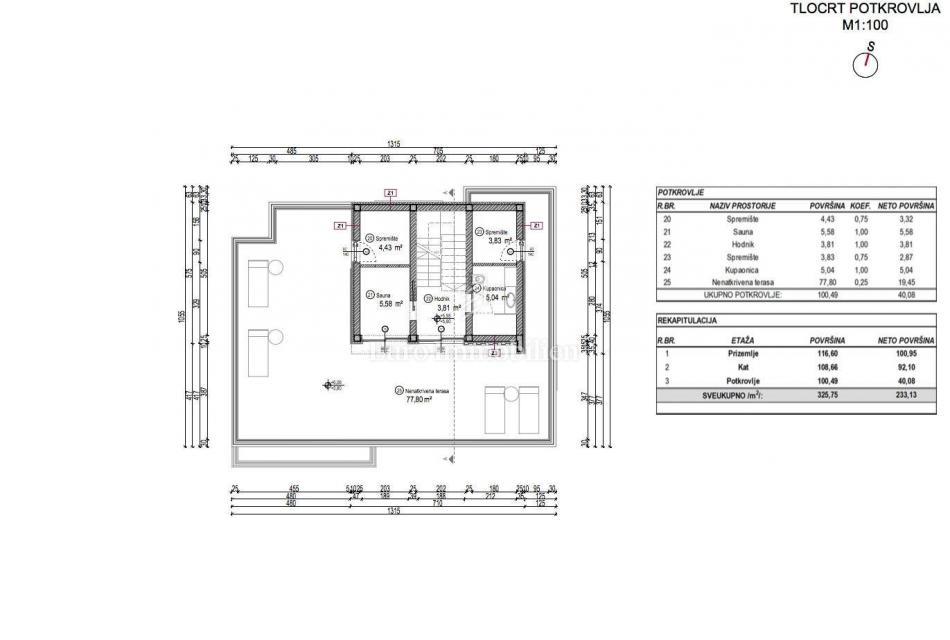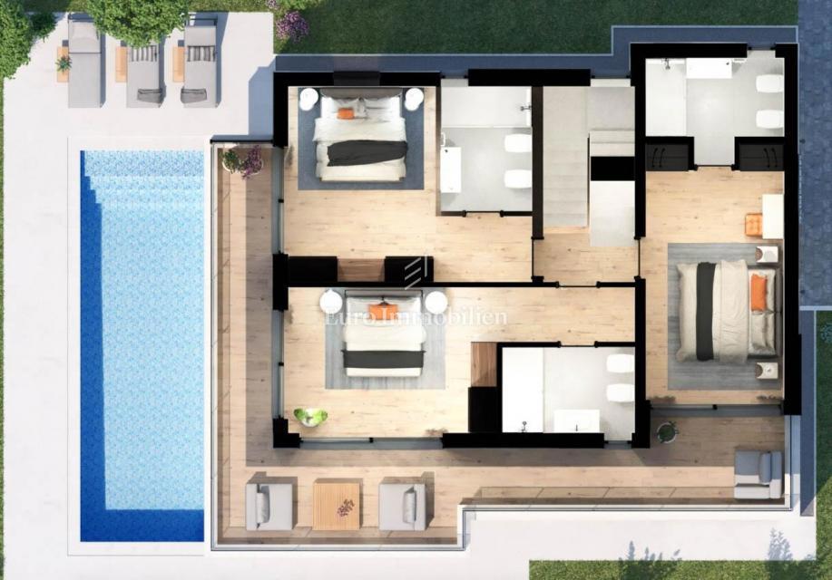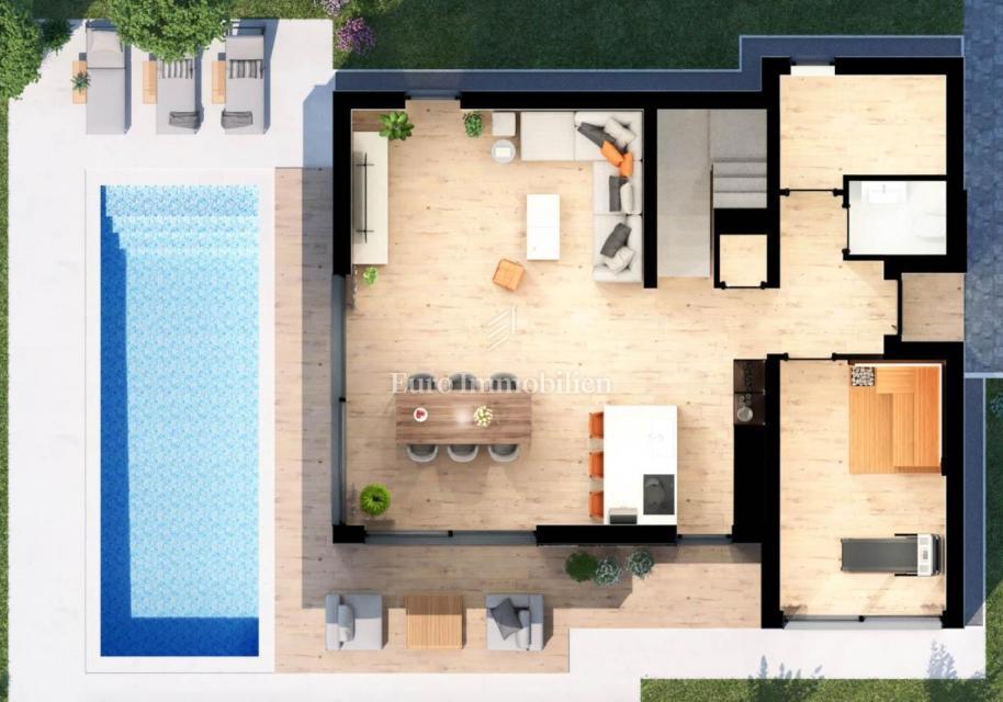 Nova hiša atraktivnega in modernega dizajna se nahaja v bližini Poreča, le 4 km od centra mesta in deset minut vožnje od plaž. Gradi se na parceli velikosti 570m2. Hiša je sestavljena iz pritličja, nadstropja in mansarde. Skozi glavni vhod v hišo se vsto
