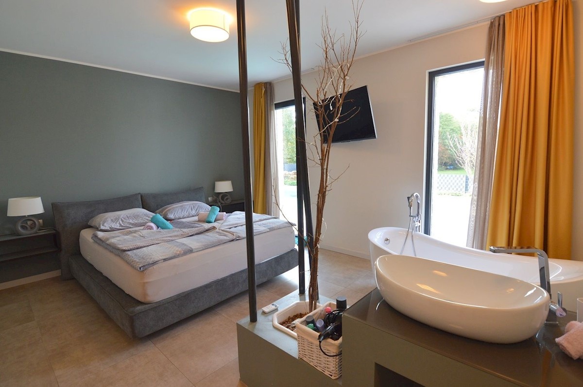 V predmestju Poreča je naprodaj luksuzna vila z bazenom. Vilo odlikuje moderen dizajn in visokokakovostno pohištvo, ima urejen, velik in popolnoma ograjen vrt s pokrito teraso z žarom, bazen cca 50 m² z lepo urejenim prostorom za sončenje. Vila se razpros