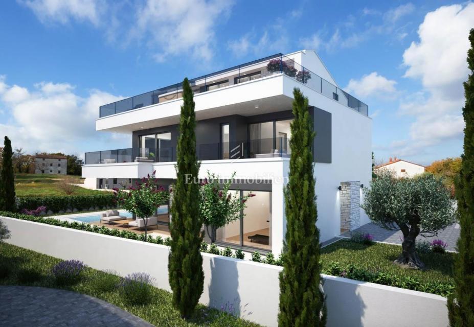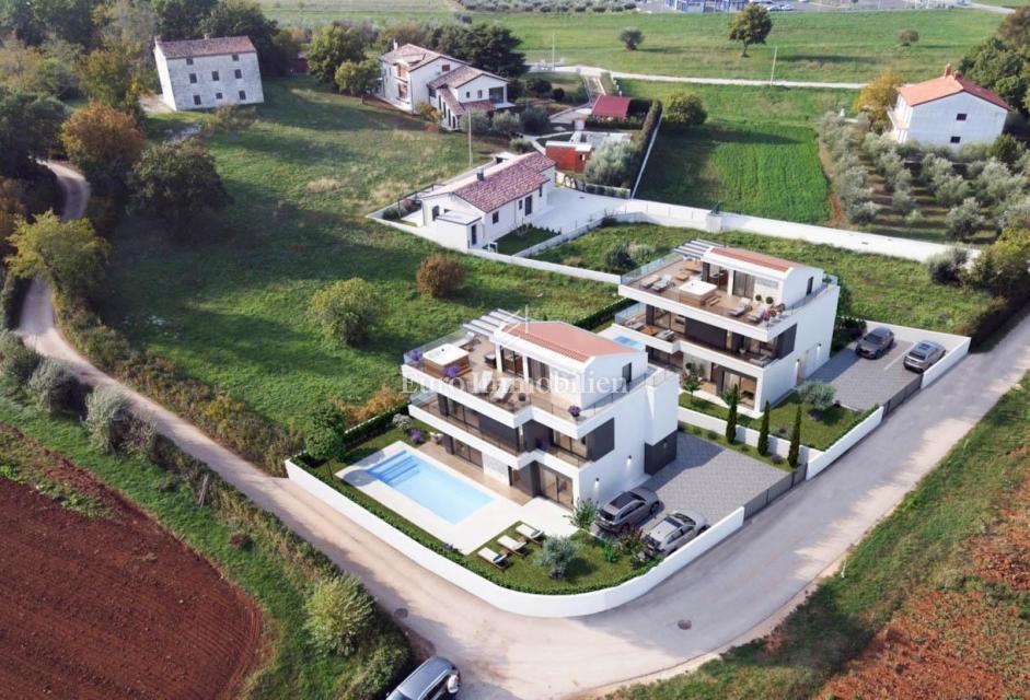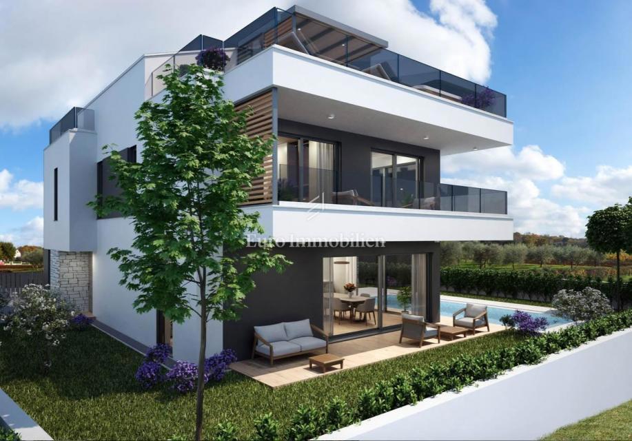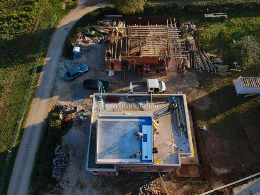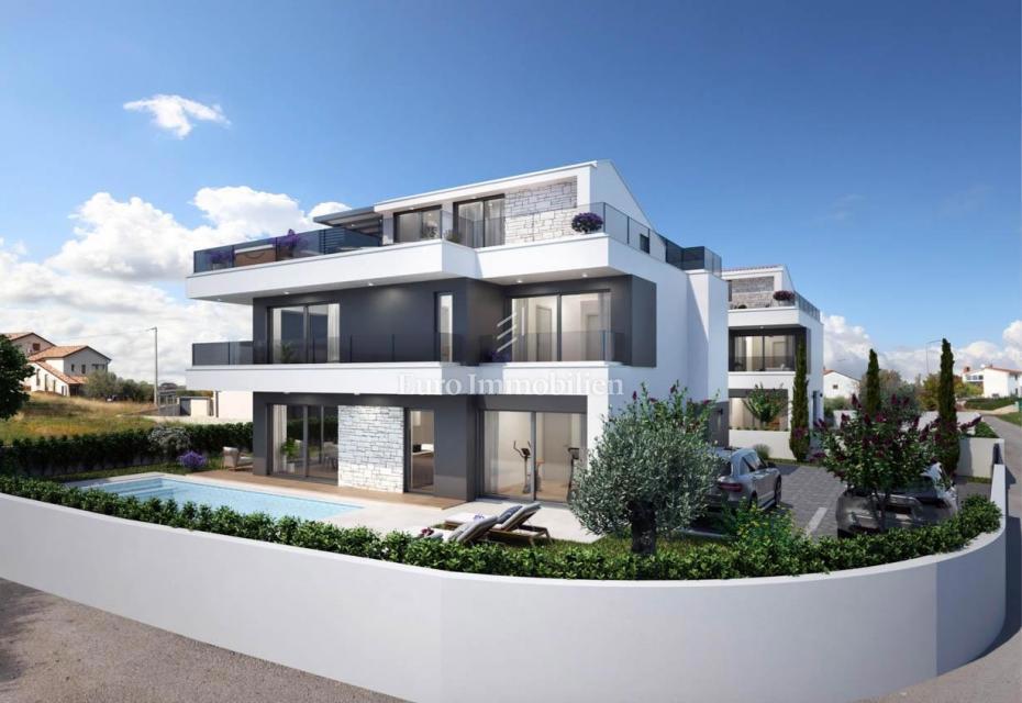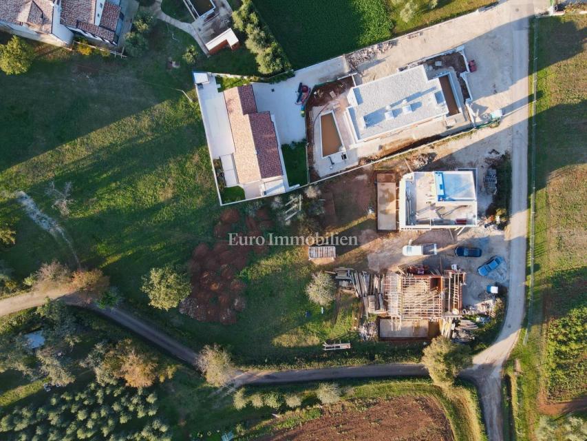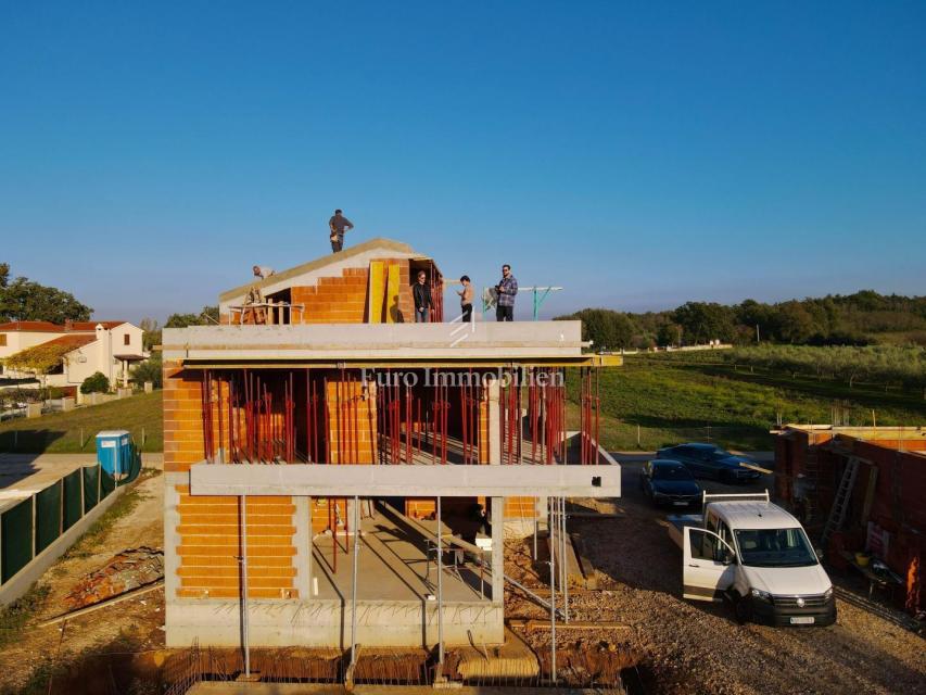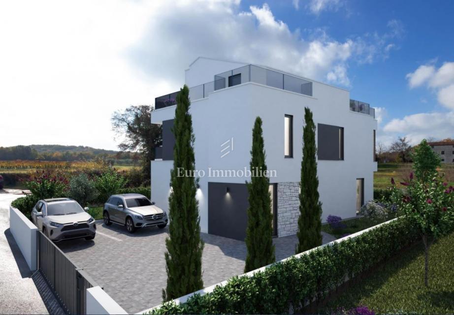 Nova hiša atraktivnega in modernega dizajna se nahaja v bližini Poreča, le 4 km od centra mesta in deset minut vožnje od plaž. Gradi se na parceli velikosti 501m2. Hiša je sestavljena iz pritličja, nadstropja in mansarde. Skozi glavni vhod v hišo se vsto