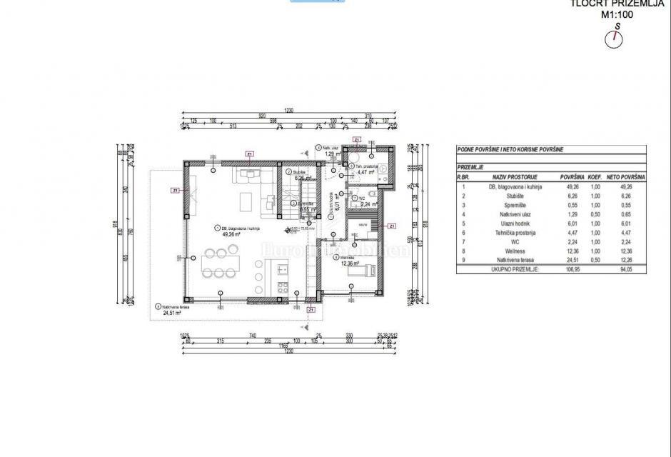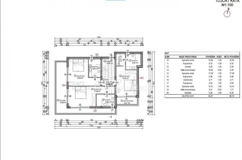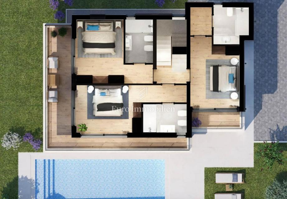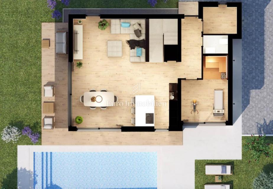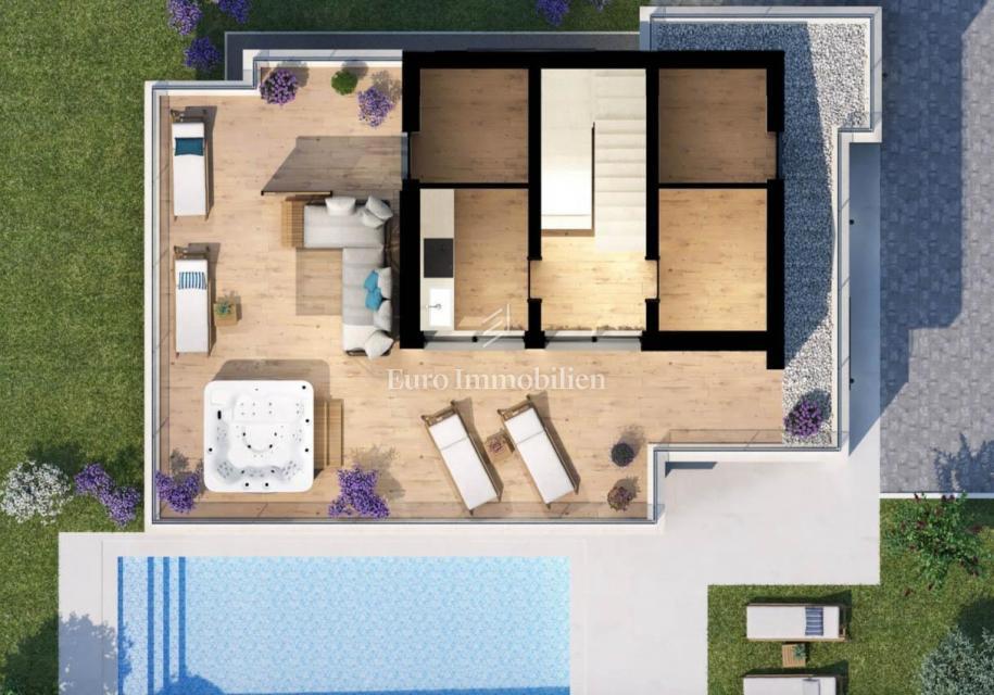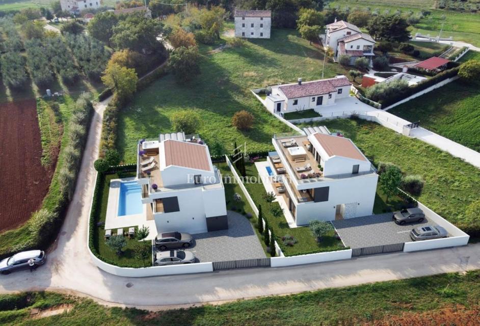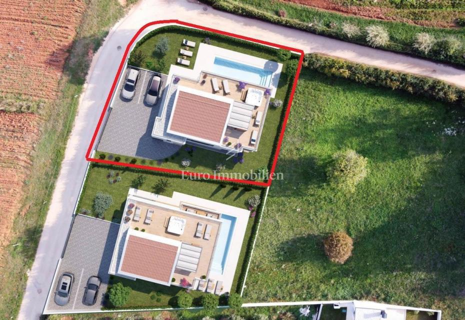 Nova hiša atraktivnega in modernega dizajna se nahaja v bližini Poreča, le 4 km od centra mesta in deset minut vožnje od plaž. Gradi se na parceli velikosti 501m2. Hiša je sestavljena iz pritličja, nadstropja in mansarde. Skozi glavni vhod v hišo se vsto