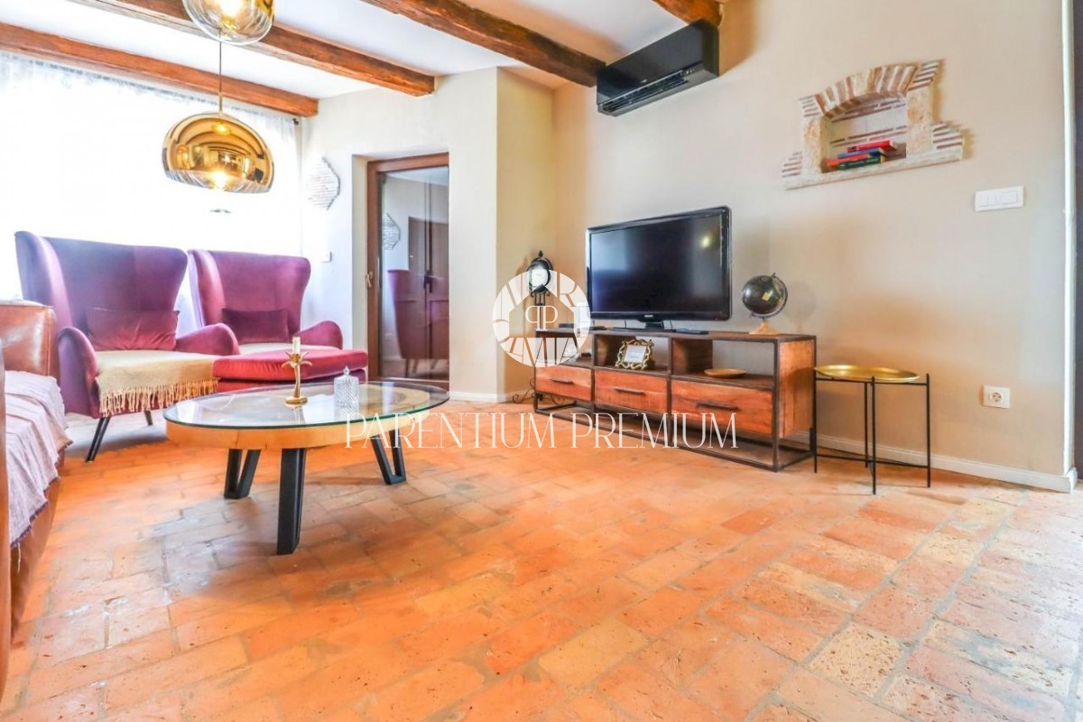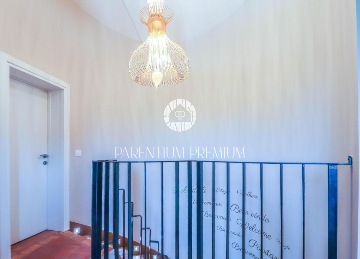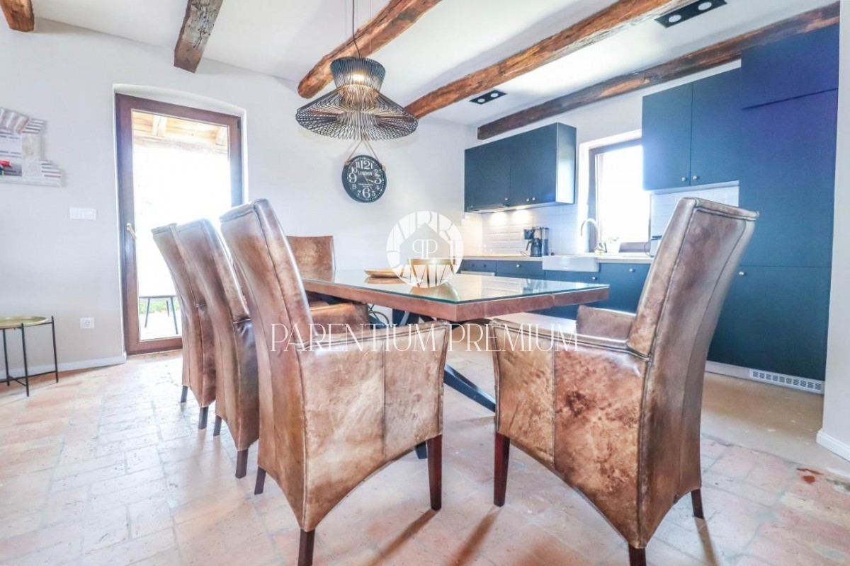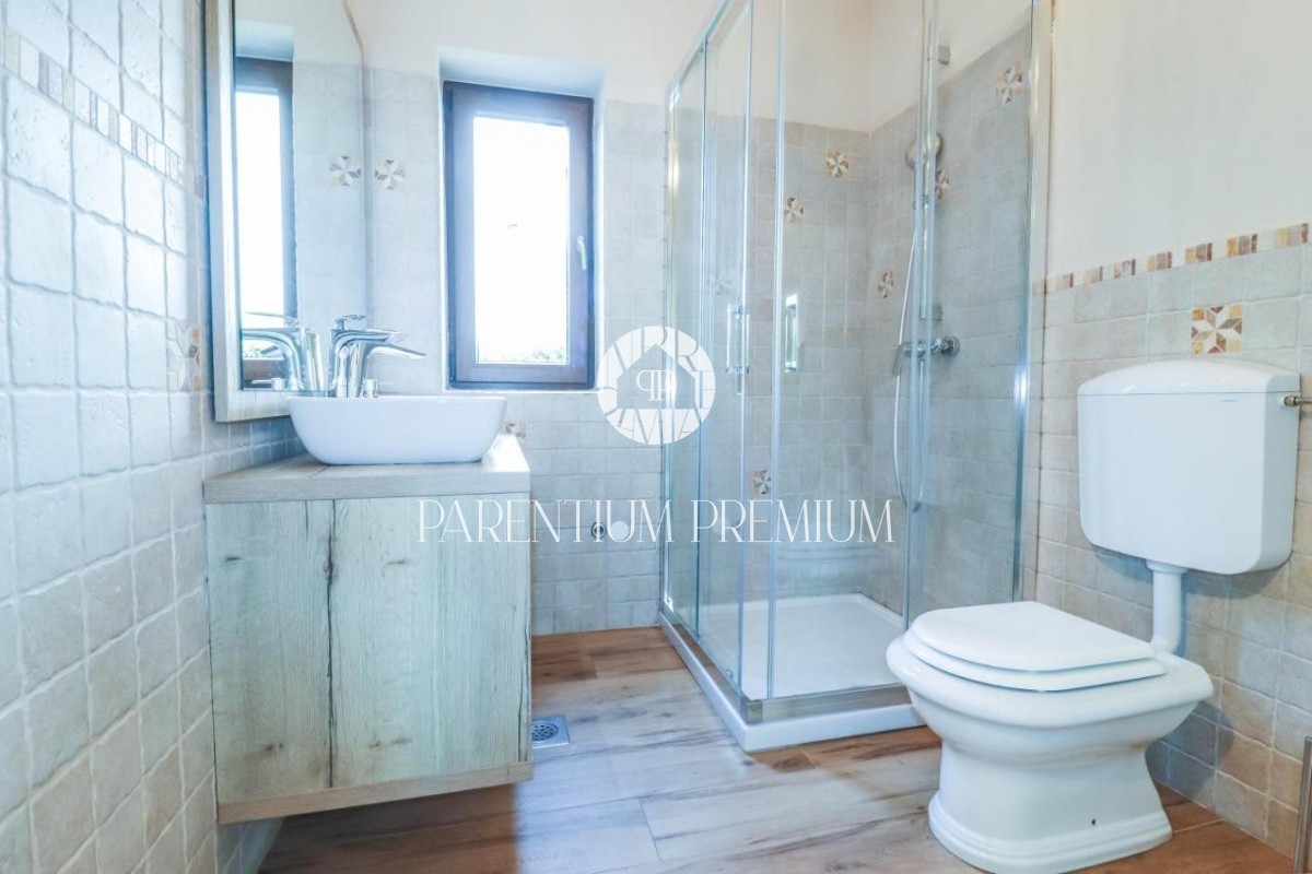 Istra Poreč Ta čudovita kamnita vila s 142 m2 se nahaja na 650 m2 velikem zemljišču v majhnem mestu, le 10 minut vožnje od mesta Poreč in njegovih čudovitih plaž. Hiša je razdeljena na 2 etaži, v pritličju pa se nahaja odprta dnevna soba s kuhinjo in je