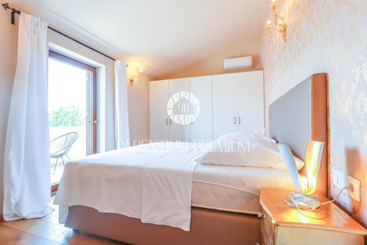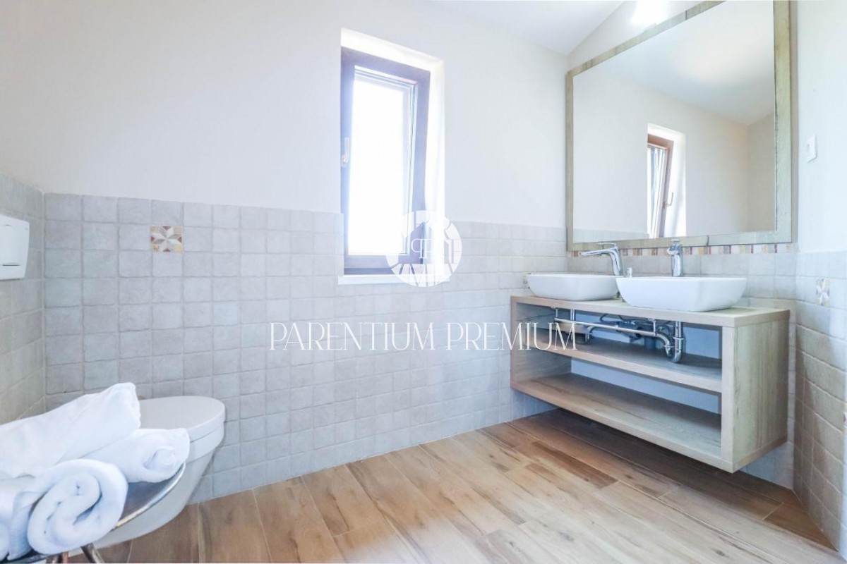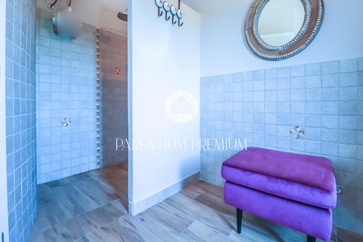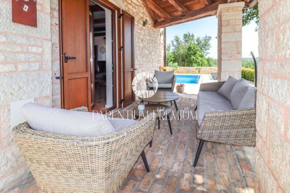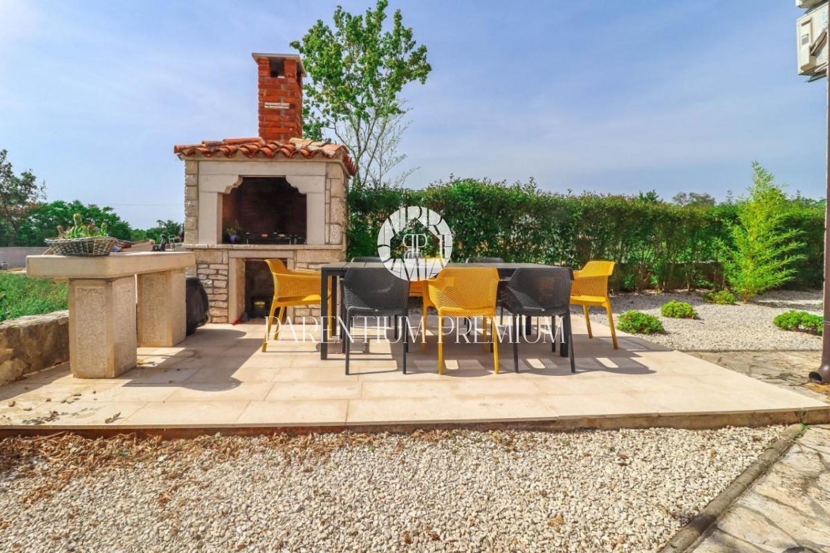 Istra Poreč Ta čudovita kamnita vila s 142 m2 se nahaja na 650 m2 velikem zemljišču v majhnem mestu, le 10 minut vožnje od mesta Poreč in njegovih čudovitih plaž. Hiša je razdeljena na 2 etaži, v pritličju pa se nahaja odprta dnevna soba s kuhinjo in je
