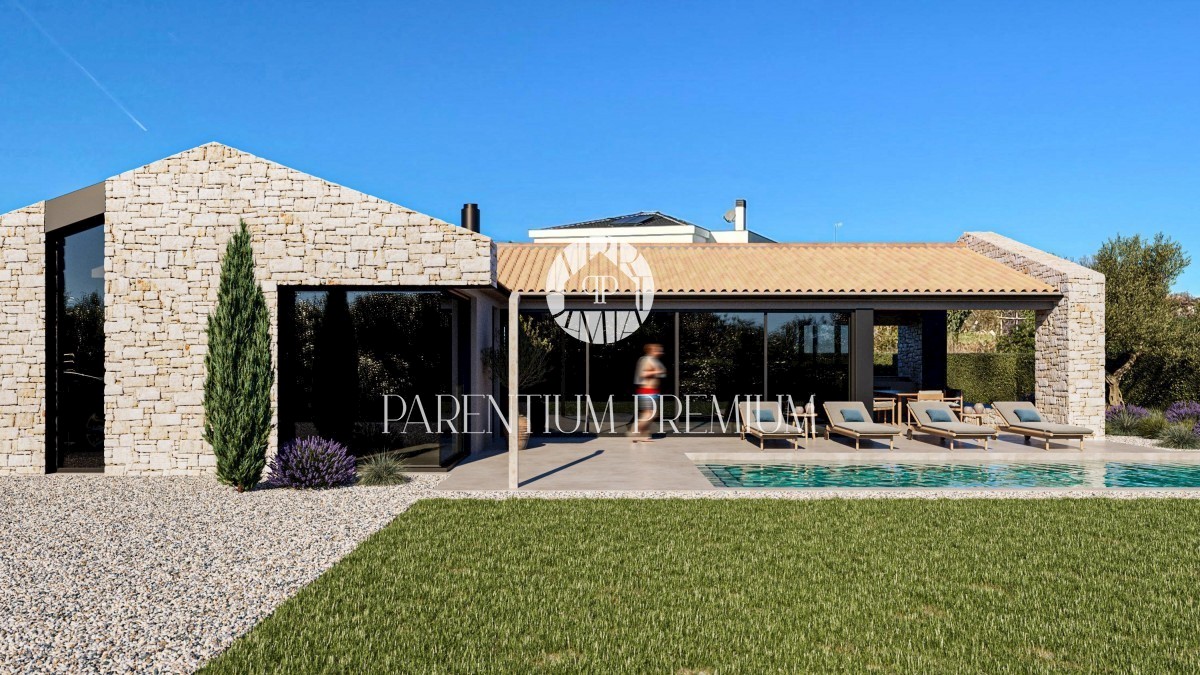 Istra, Tar Na zelo atraktivni lokaciji se je začela gradnja te čudovite dizajnerske vile. Hiša velikosti 132 m2 se nahaja na zemljišču velikosti 600 m2. Sestavljeno bo iz predprostora, velike dnevne sobe s kuhinjo in jedilnico, wc-ja ter 3 spalnic in dve