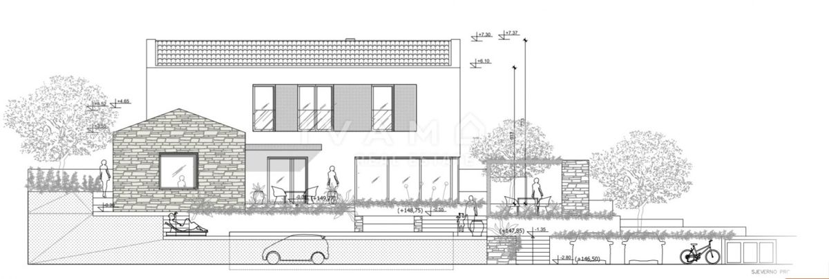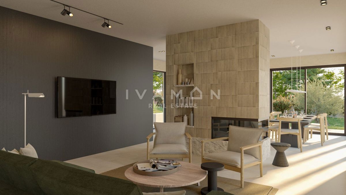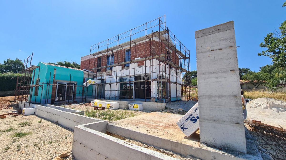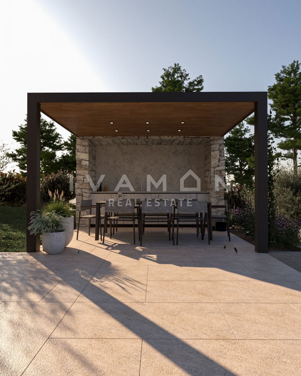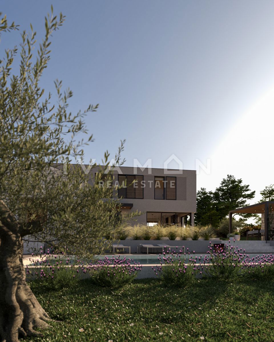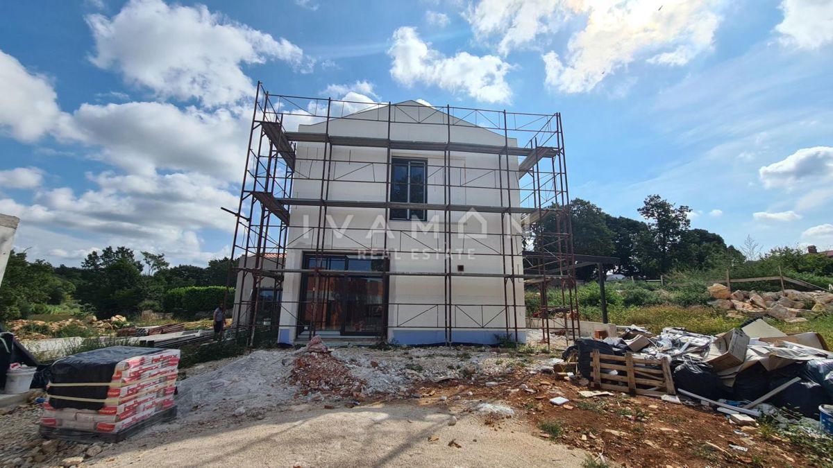 Na majhnem hribu v mirnem kraju, ki se nahaja 15 km od centra Poreča in 10 km od najbližjih plaž, je naprodaj lepa, novozgrajena vila. Nahaja se na zemljišču velikosti 940 m2 in ima 180 m2 neto bivalne površine. Parcela je lepe pravilne oblike in kot tak