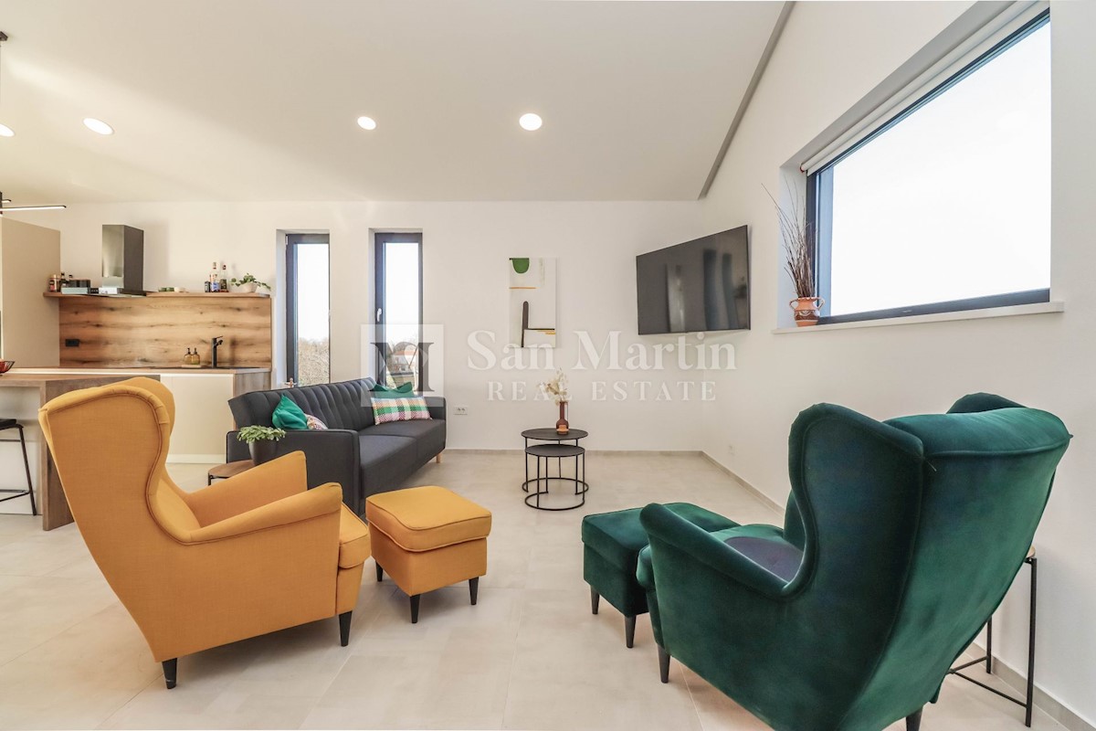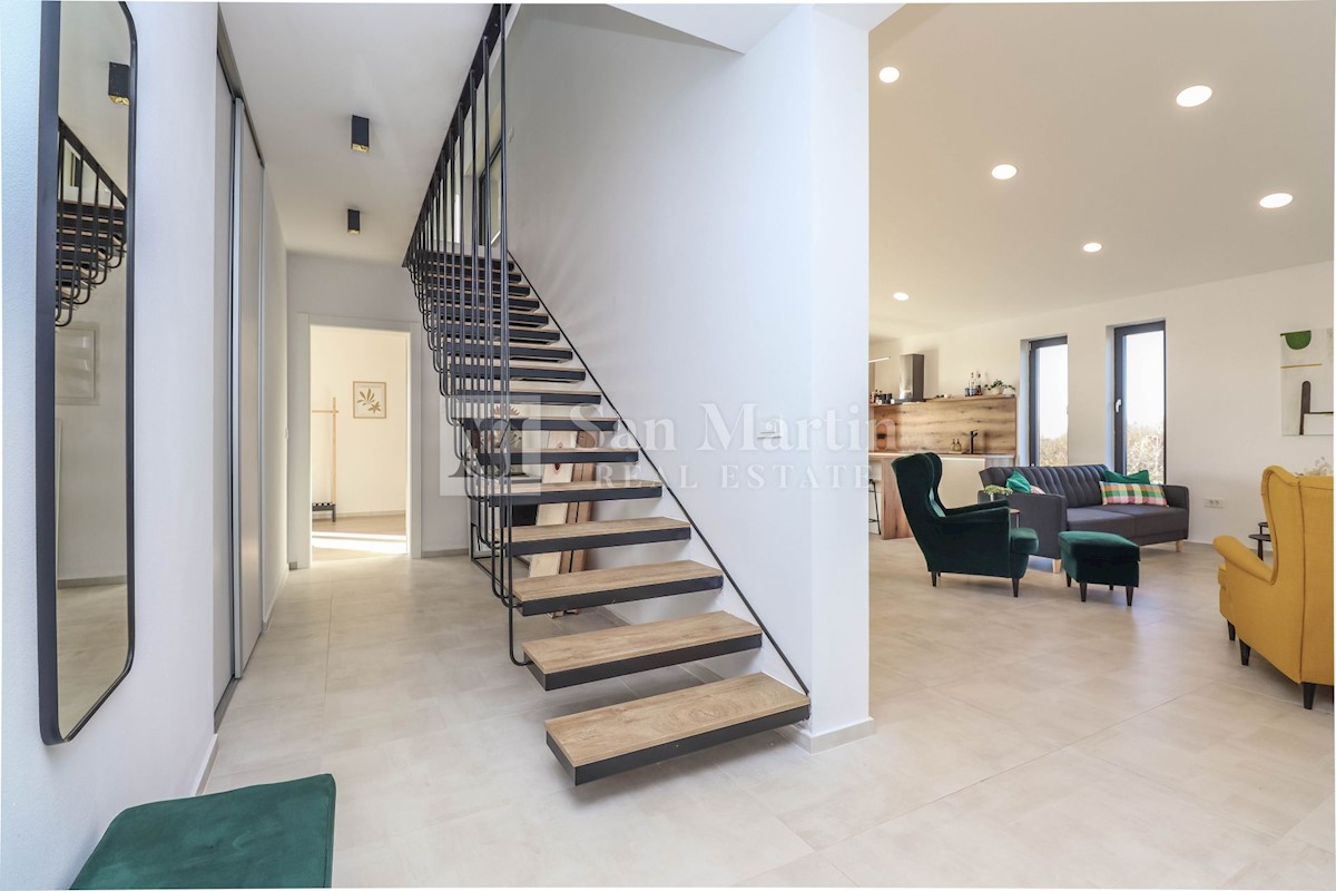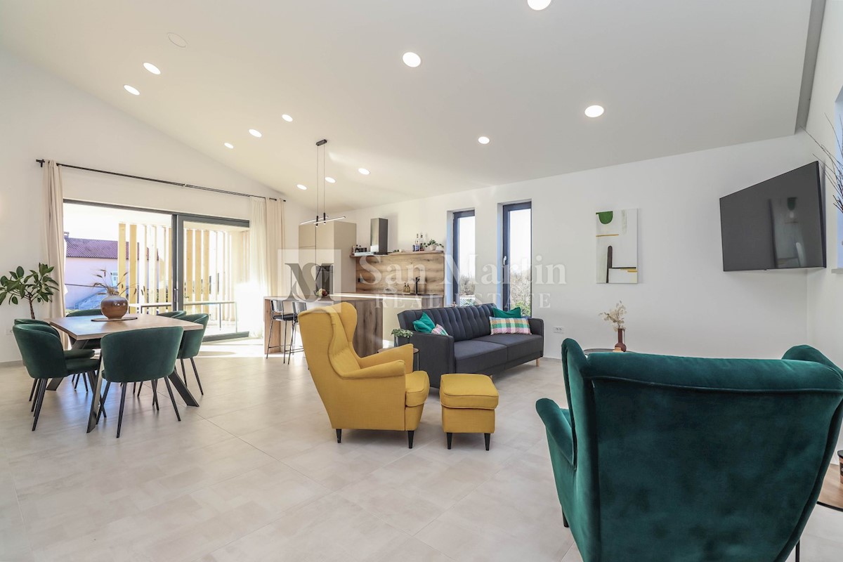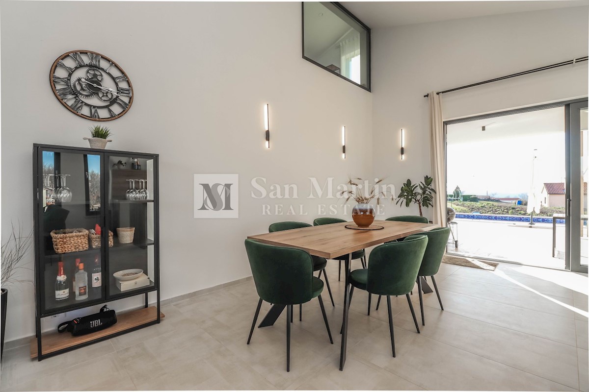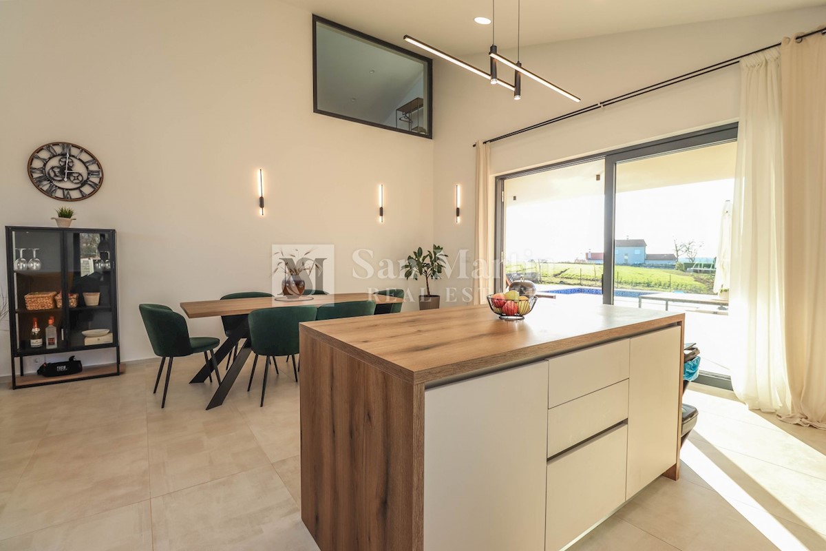 Poreč, okolica, Moderna hiša z bazenom Ta moderna hiša z bazenom se nahaja le 20 kilometrov od morja in Poreča, ki se prodaja v celoti opremljena. V pritličju hiše je prostoren dnevni prostor z jedilnico in kuhinjo, ki je z velikimi drsnimi steklenimi s