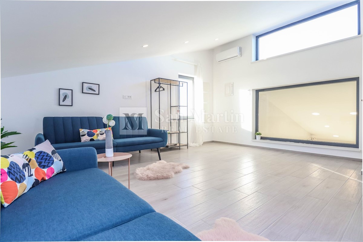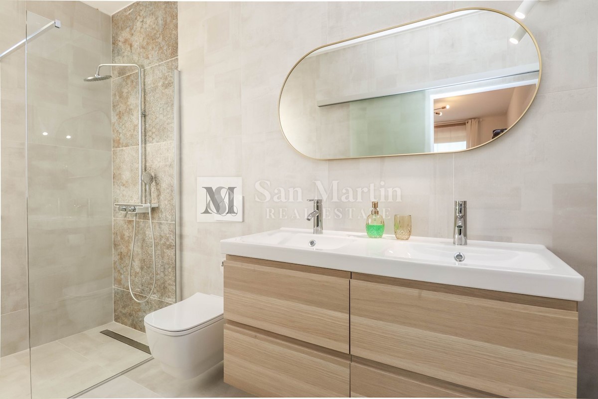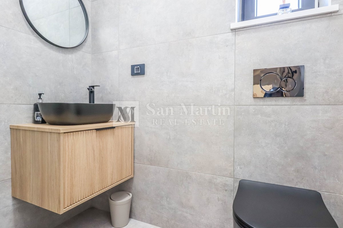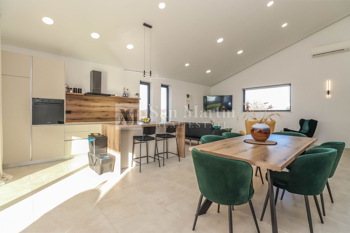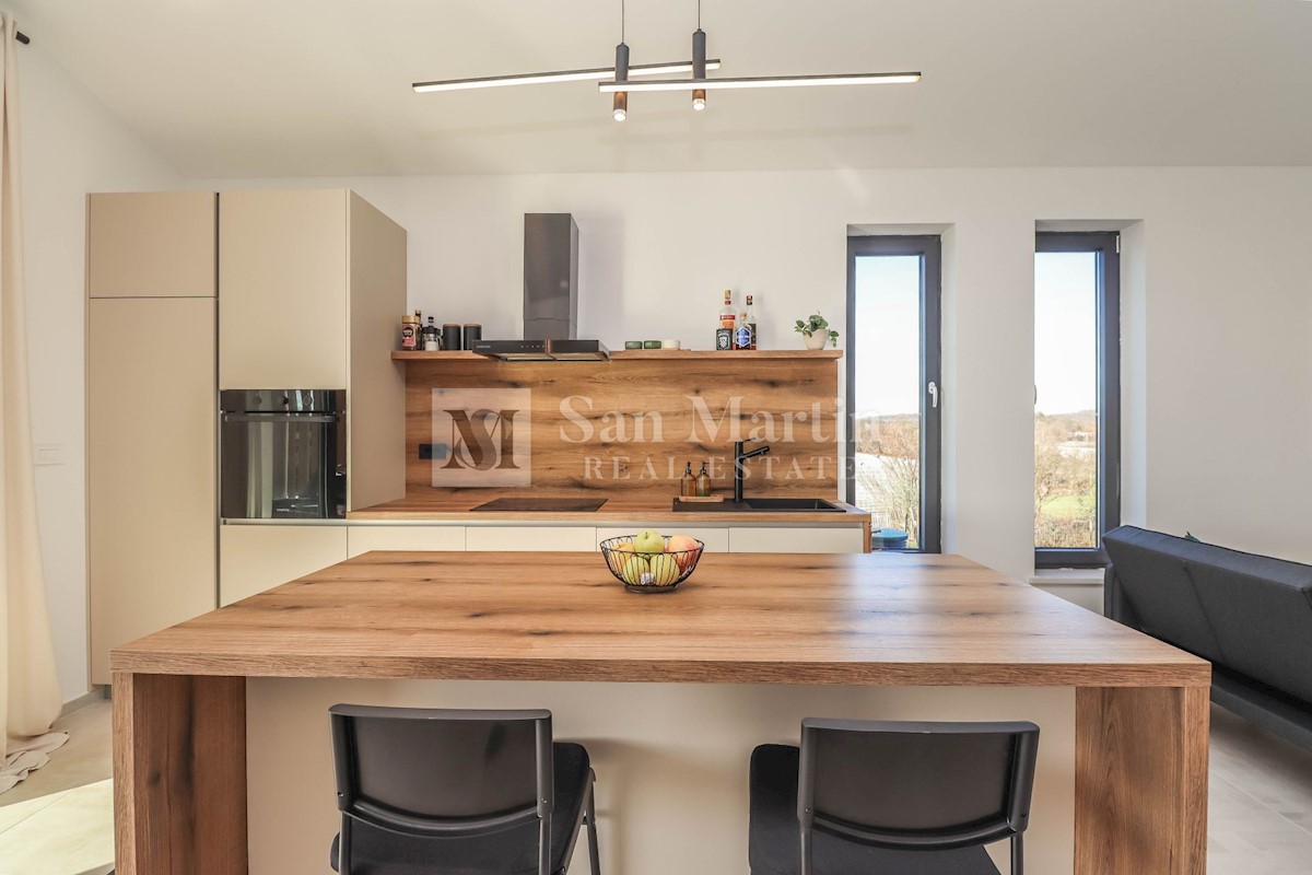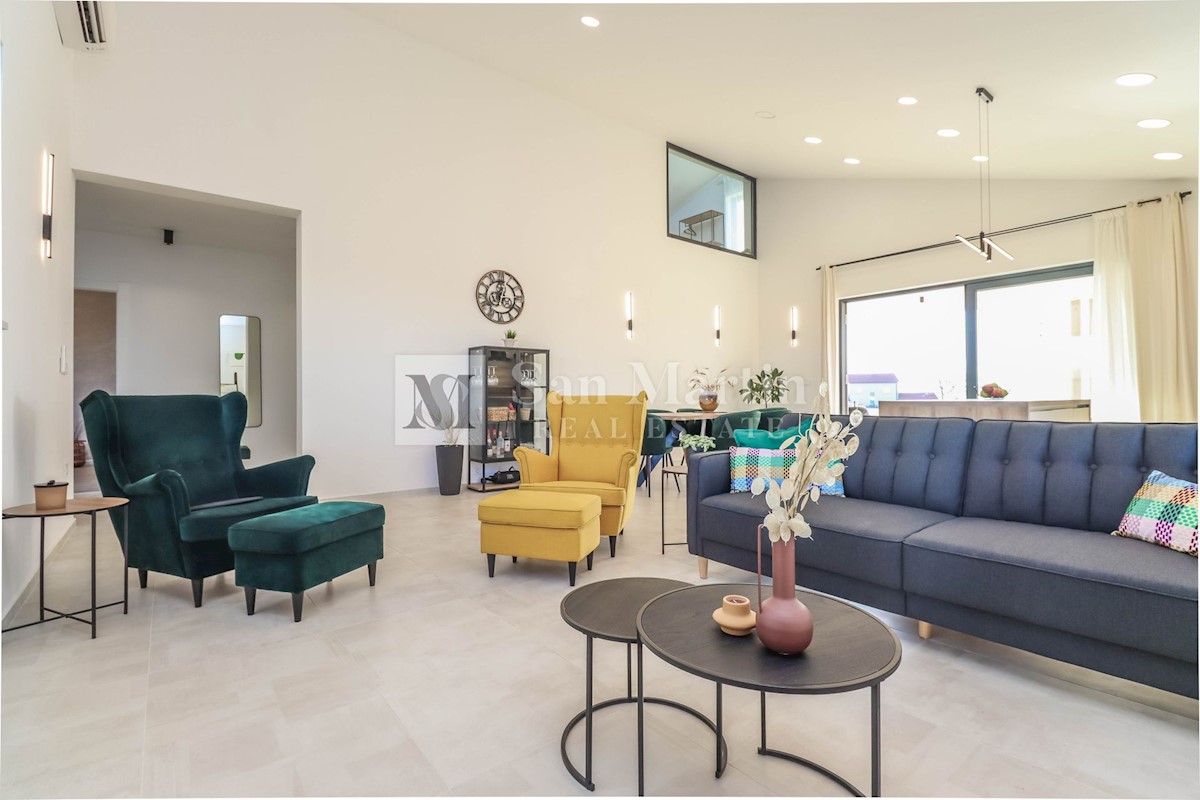 Poreč, okolica, Moderna hiša z bazenom Ta moderna hiša z bazenom se nahaja le 20 kilometrov od morja in Poreča, ki se prodaja v celoti opremljena. V pritličju hiše je prostoren dnevni prostor z jedilnico in kuhinjo, ki je z velikimi drsnimi steklenimi s