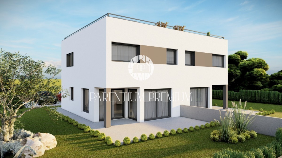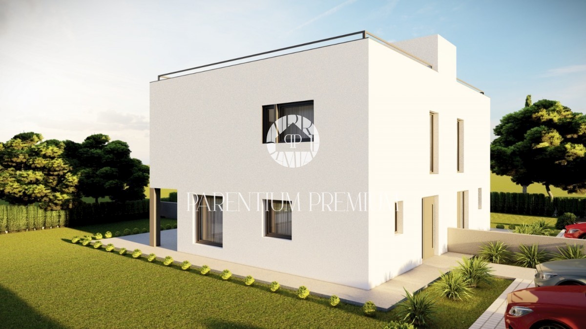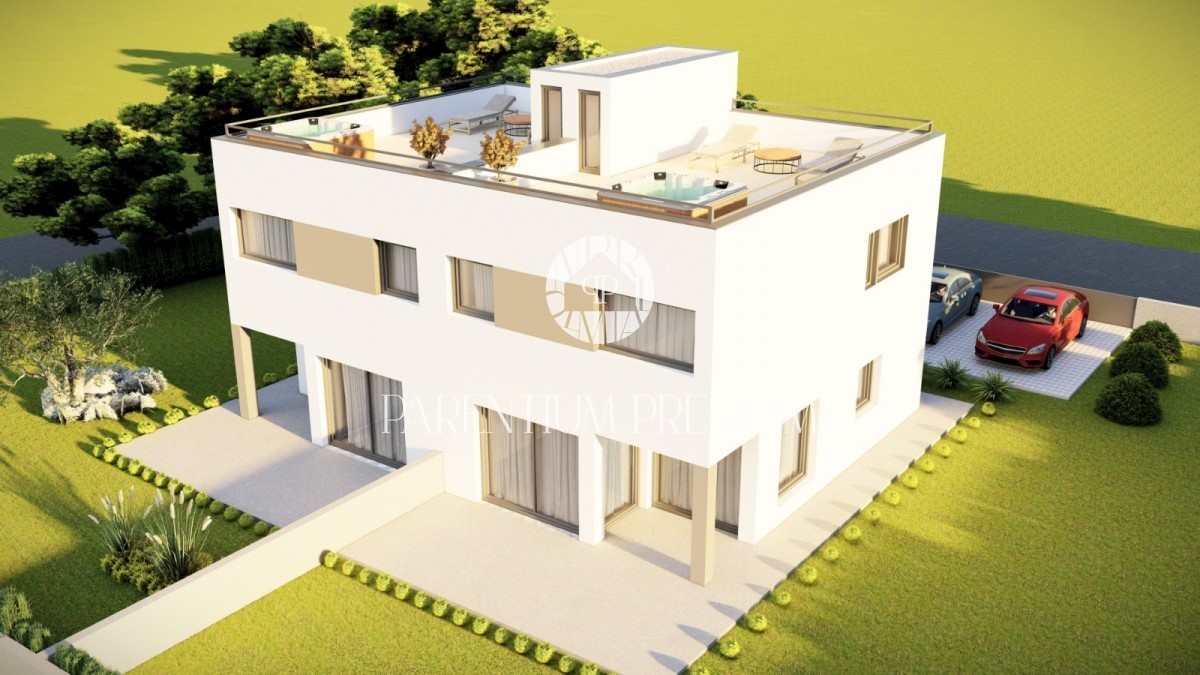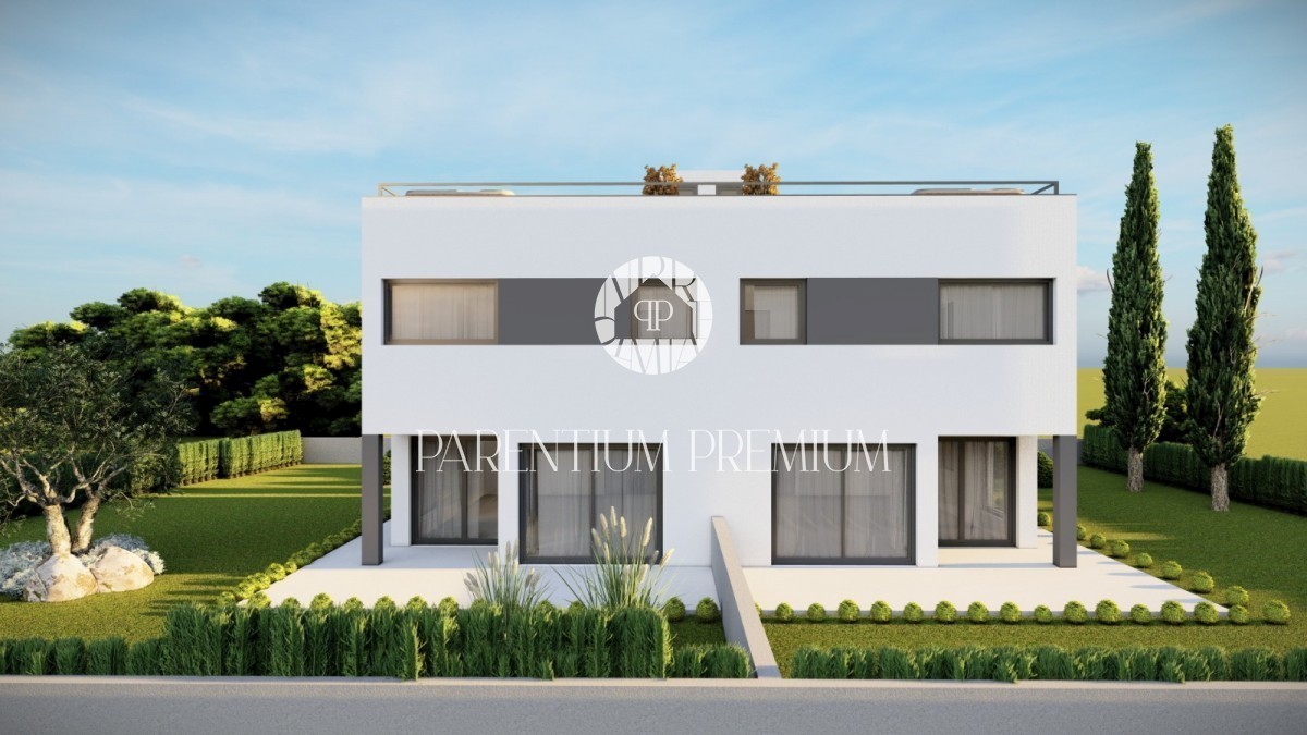 Istra, Poreč - okolica Ta nova moderna hiša dvojček s skupno površino 117,66 m2, s strešno teraso in očarljivim razgledom se nahaja v družinskem naselju v bližini čudovitega mesta Poreč. Ta lastnost ponuja izbiro med 2 ali 3 spalnicami, kar vam omogoča,