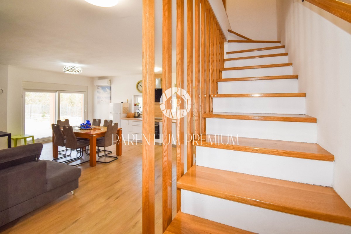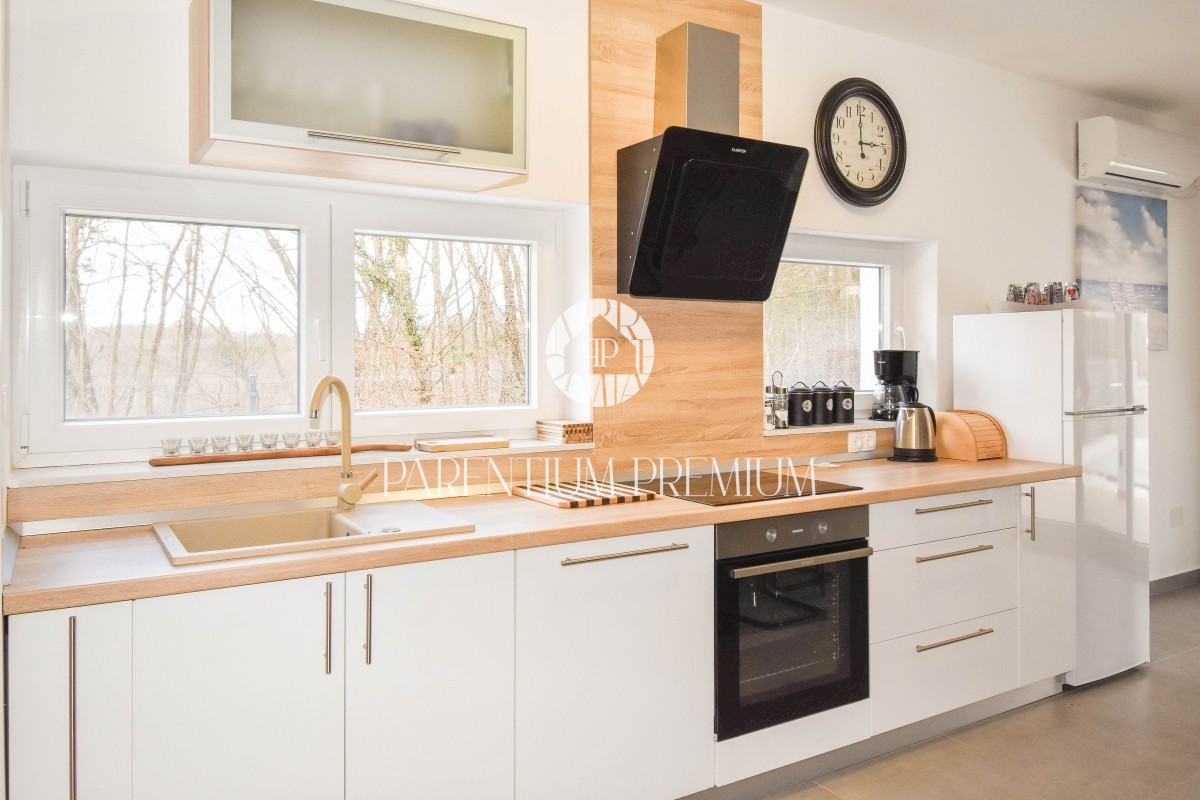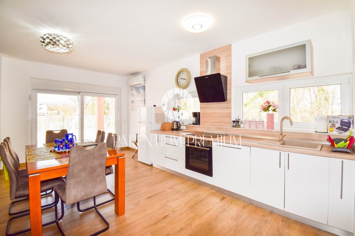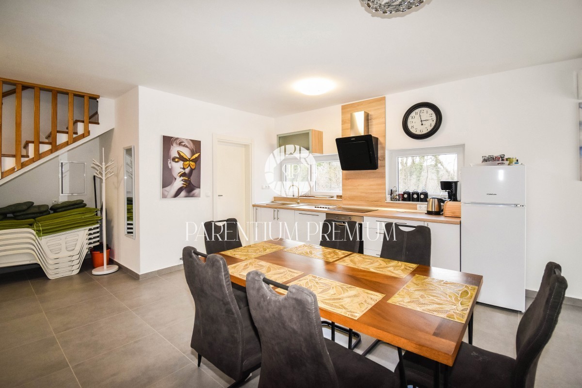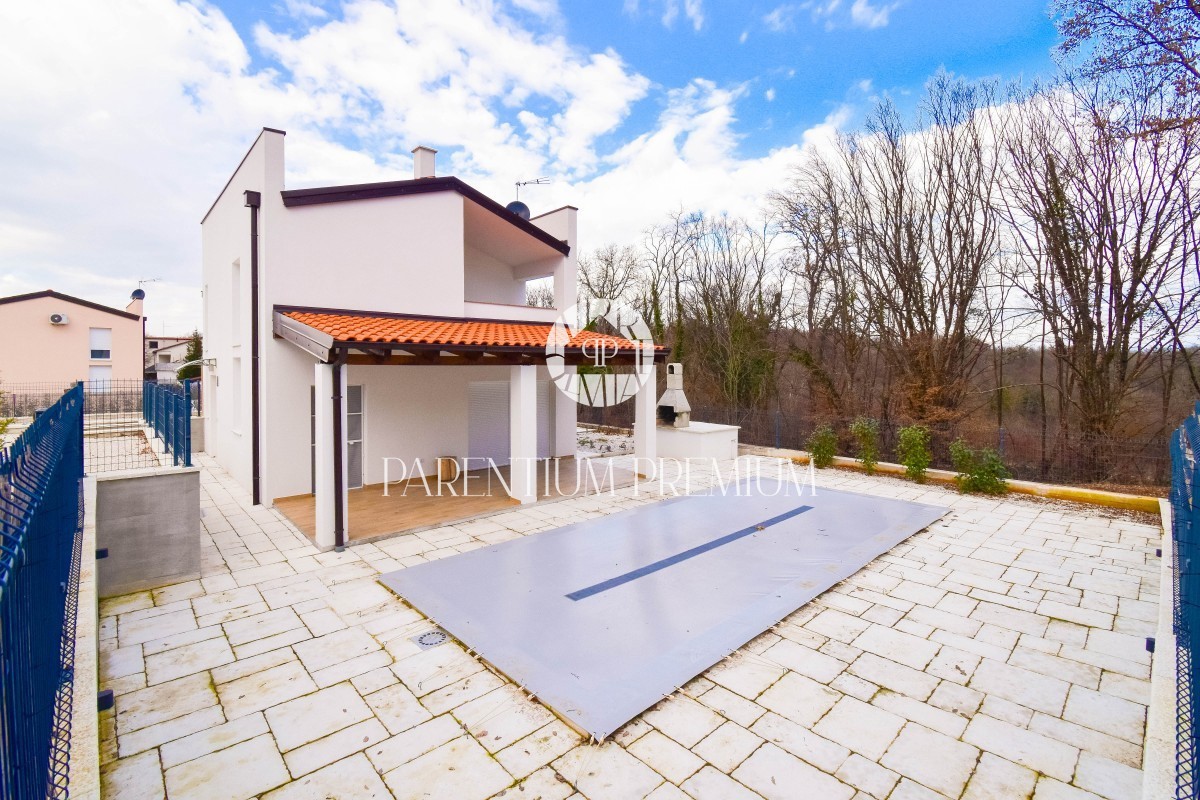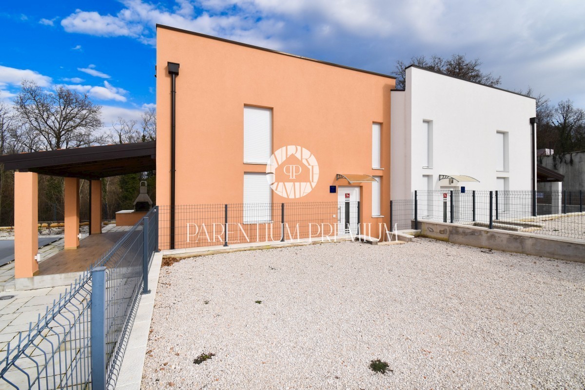 Istra, Poreč - okolica (notranjost) Prodaja se odlična nova moderna hiša z 2 stanovanjskima enotama v skupni izmeri 168,80 m2, ki se nahaja na zemljišču velikosti 705 m2. Hiša je razdeljena na 2 enaki stanovanjski enoti. Vsaka enota je sestavljena iz 2