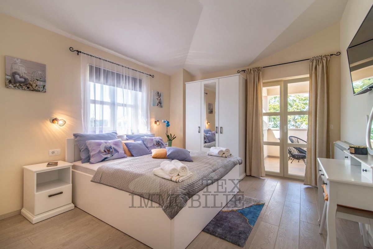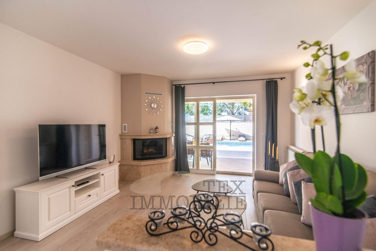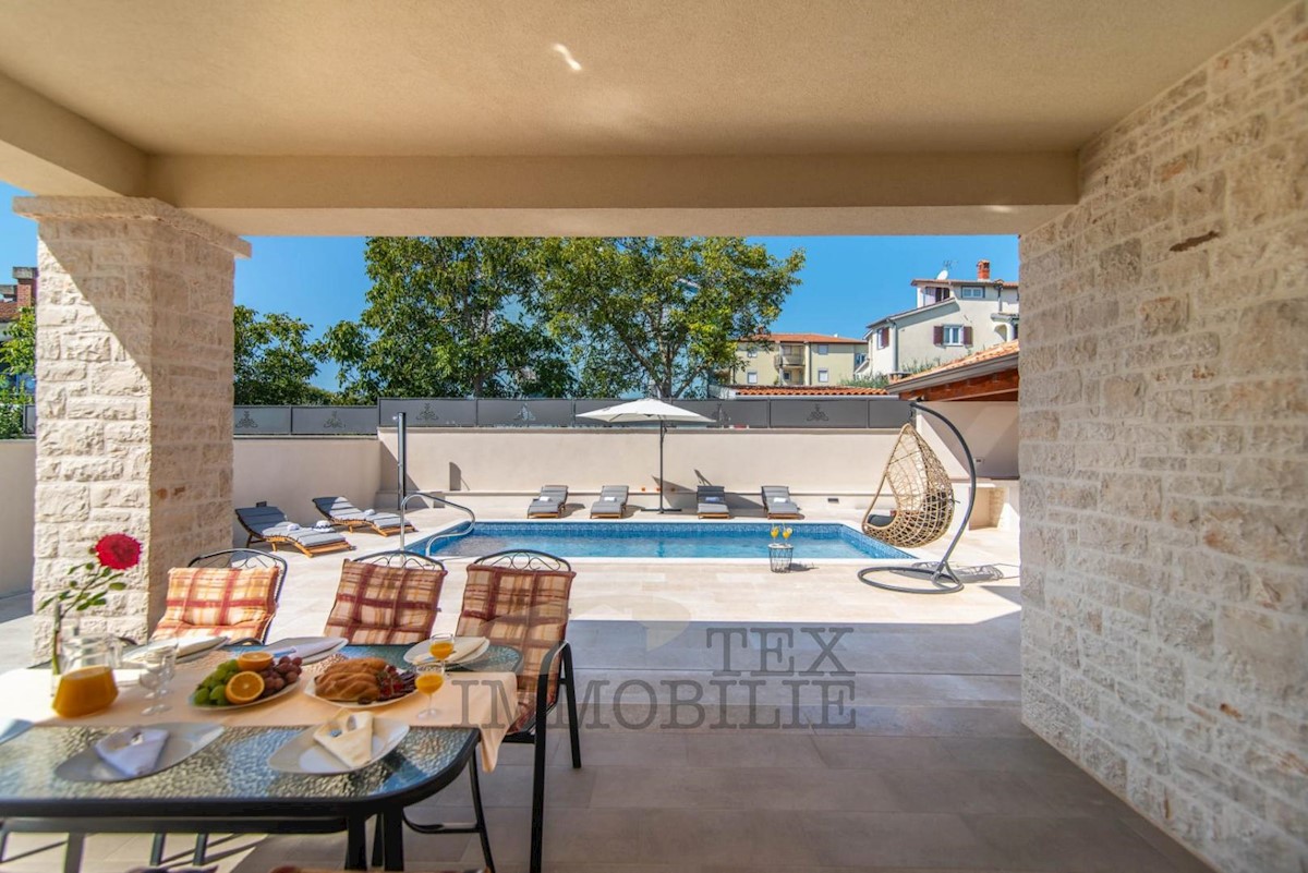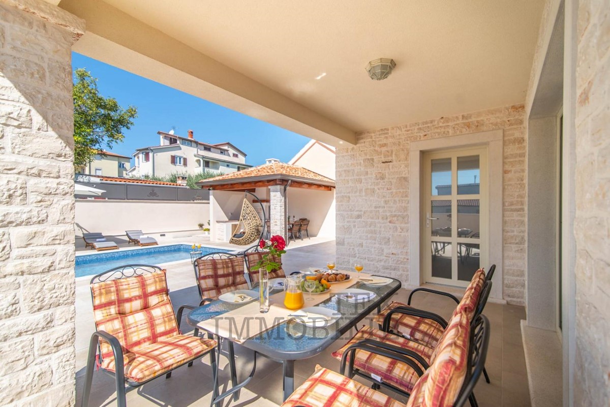 Na prodaj je vila s bazenom, ki se nahaja v mirnem okolju, nedaleč stran od mesta Poreč in morja. Stoji na parceli velikosti 560 m2 in ima skupno površino 138 m2, razporejeno na pritličje in prvo nadstropje. Pritličje hiše ponuja vhodno dvorano, kopalnic