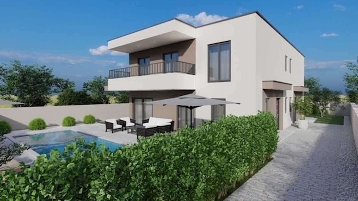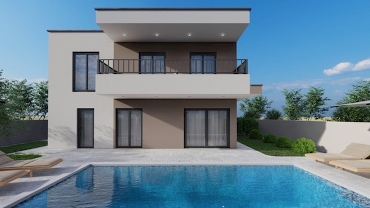 Na odlični lokaciji, le 4 km od Poreča, v mirni ulici, se nahaja moderna hiša dvojček v dveh etažah 121,96 m2 - v pritličju je dnevna soba s kuhinjo in jedilnico, shramba , kopalnico in prostorno teraso - v prvem nadstropju so tri spalnice, dve kopalnici