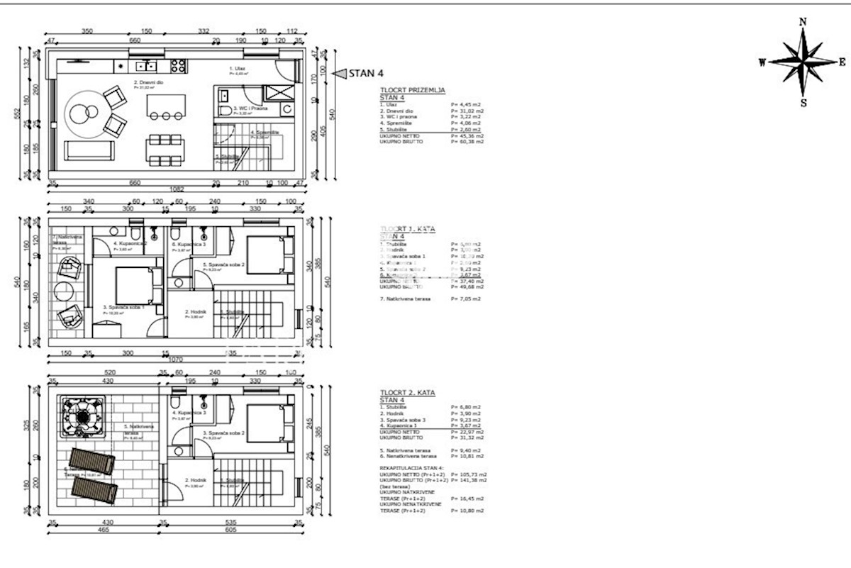 Istra, Poreč Prodamo vrstno hišo v novi in moderni stavbi, le cca 800 m od morja, to je prva hiša v nizu. Vsebuje: pritličje, prvo in drugo nadstropje. Pritličje hiše obsega predsobo, kuhinjo, dnevno sobo s kuhinjo in jedilnico, WC in shrambo pod sto